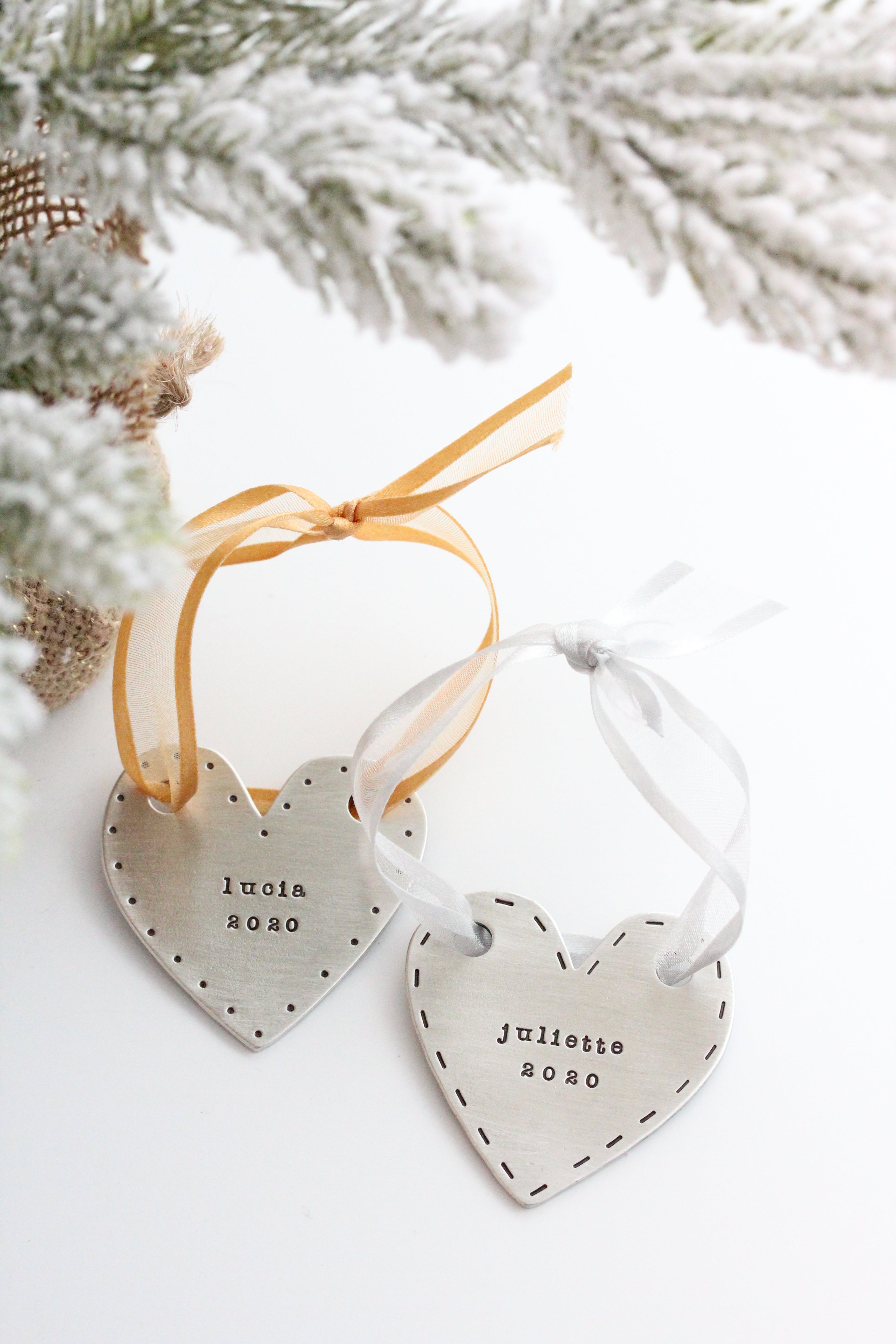 A beautiful solid pewter hear tournament, bench crafted and personalized with any text. Max of 12 characters / 2 lines. Heart measures 2" x 2". Hung from a silver or gold organza ribbon.