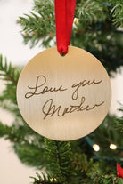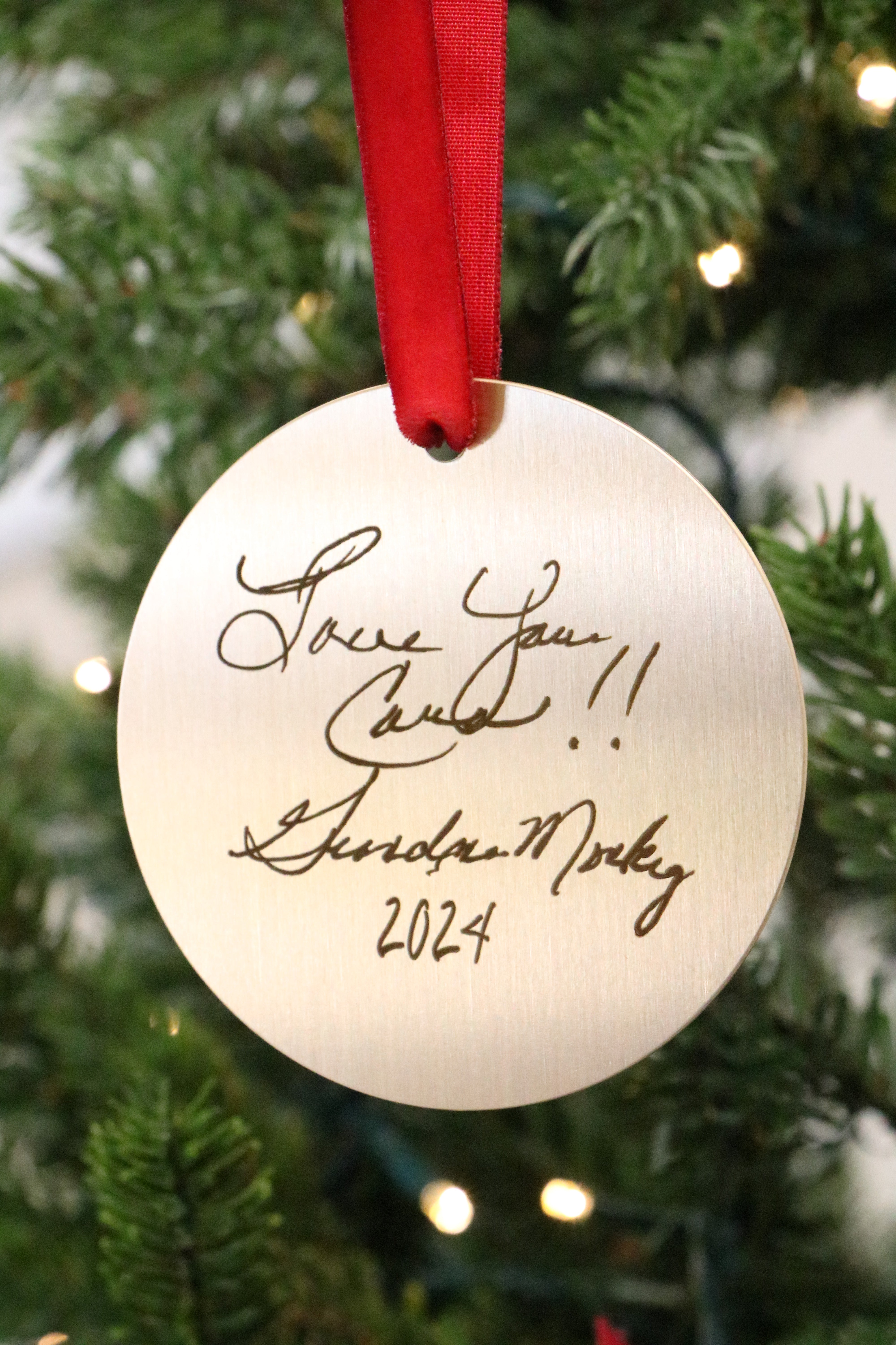 This new ornament features your very own handwriting! Just upload a photo and we will do the rest. Ornament is made from solid brass and measures 3". Includes a white, silver or red ribbon of our choice!
