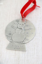 Our own design, this snow globe ornament is a personal favorite. A jolly snowman fills the center and the perimeter can be stamped with anything you would like.... names, a phrase, be creative. Bottom of snow globe can also be stamped. Made of fine silver pewter and finished with a red velvet ribbon.