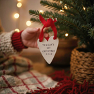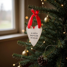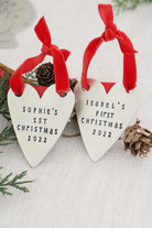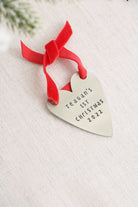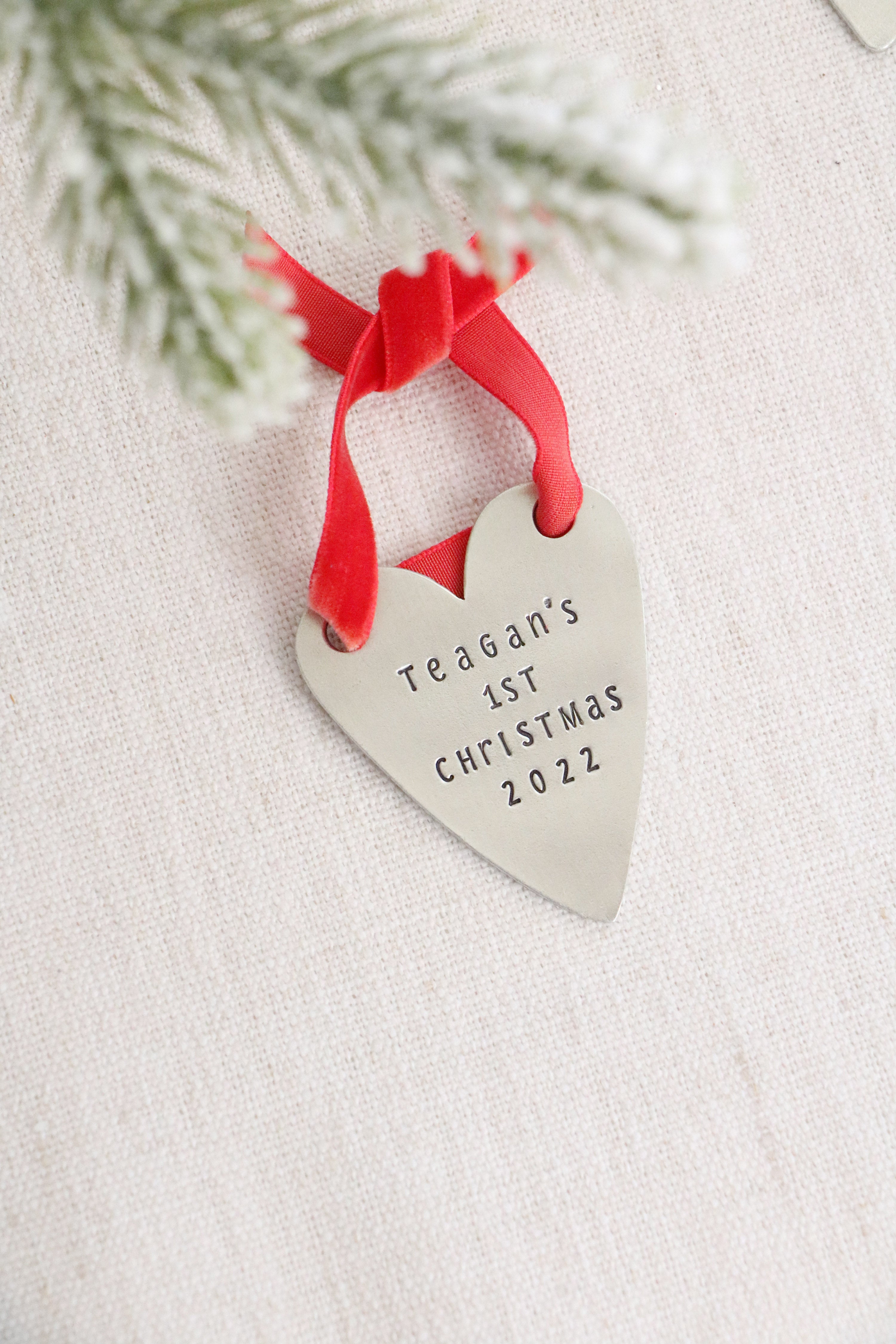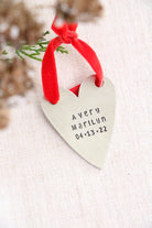 A beautiful solid pewter heart ornament, bench crafted and personalized with any text. Max of 4 lines - approximately 12 characters per line except for last line which can be about 4-6 characters. Hung from a red velvet ribbon.