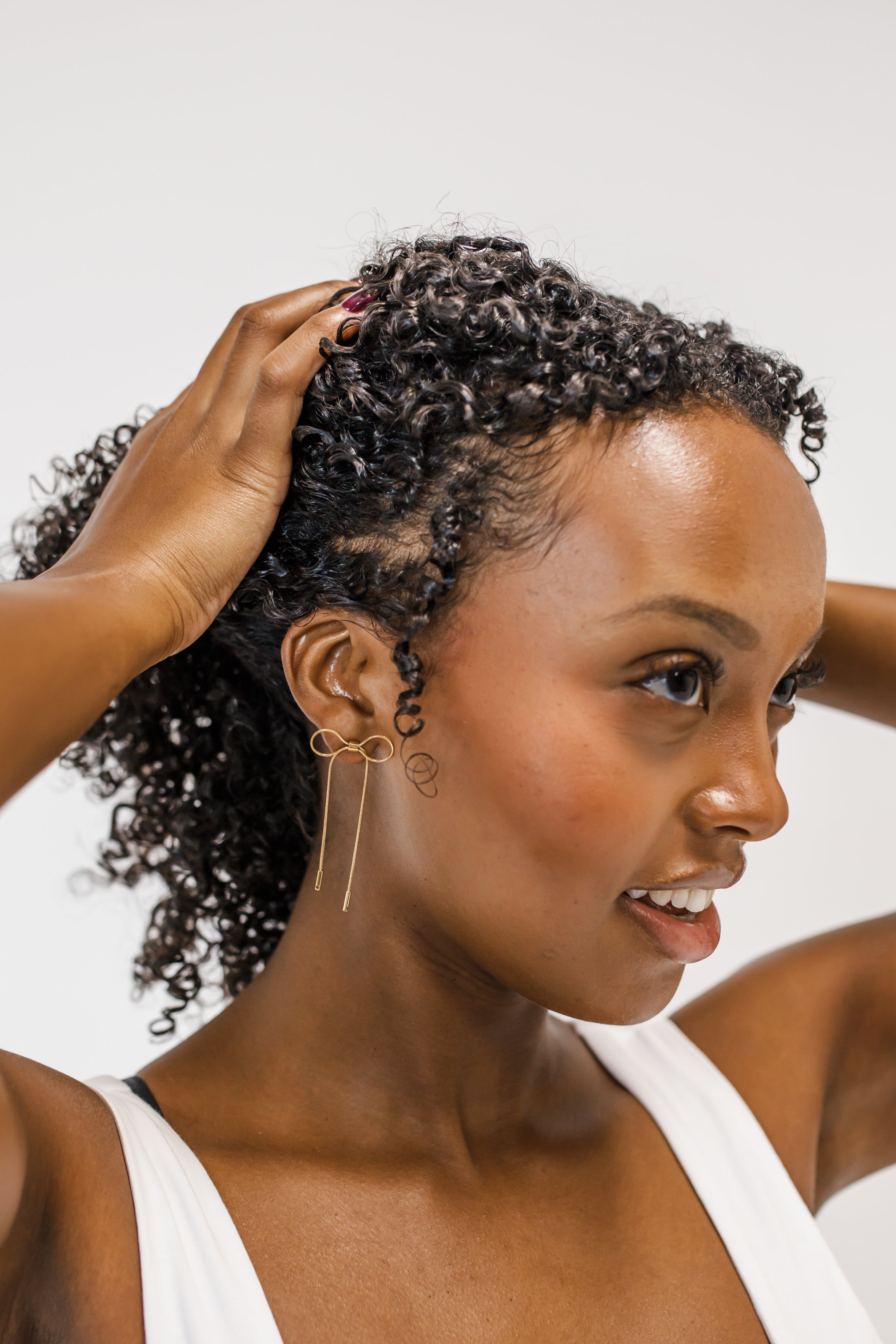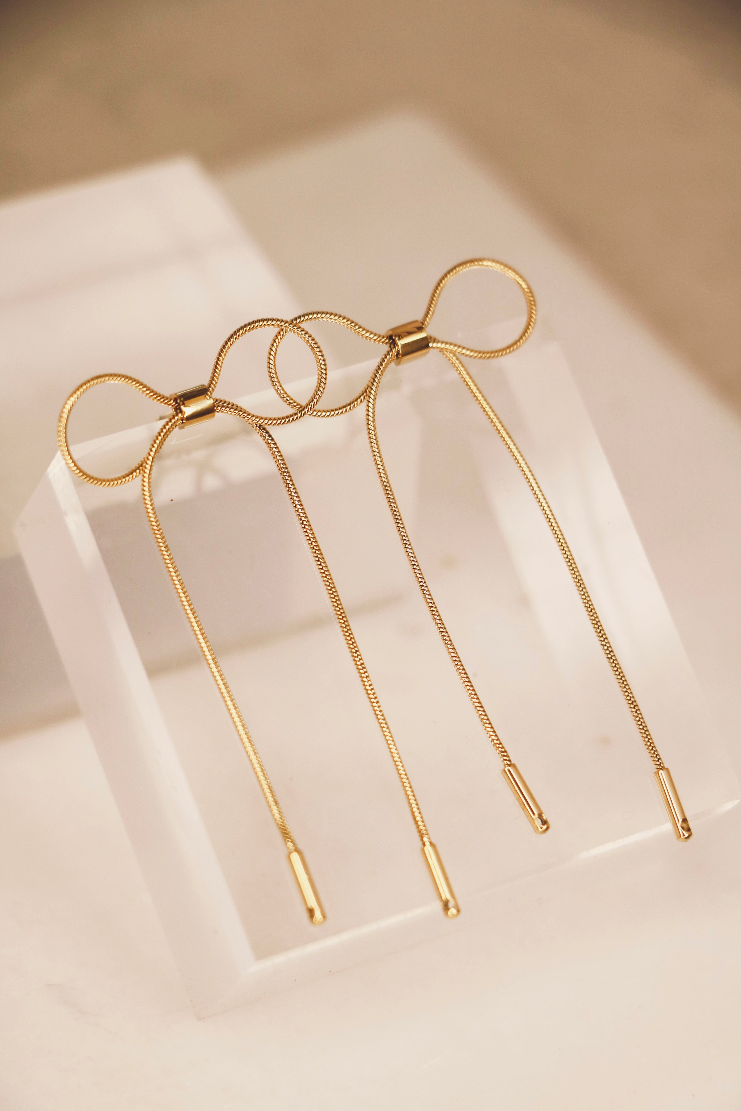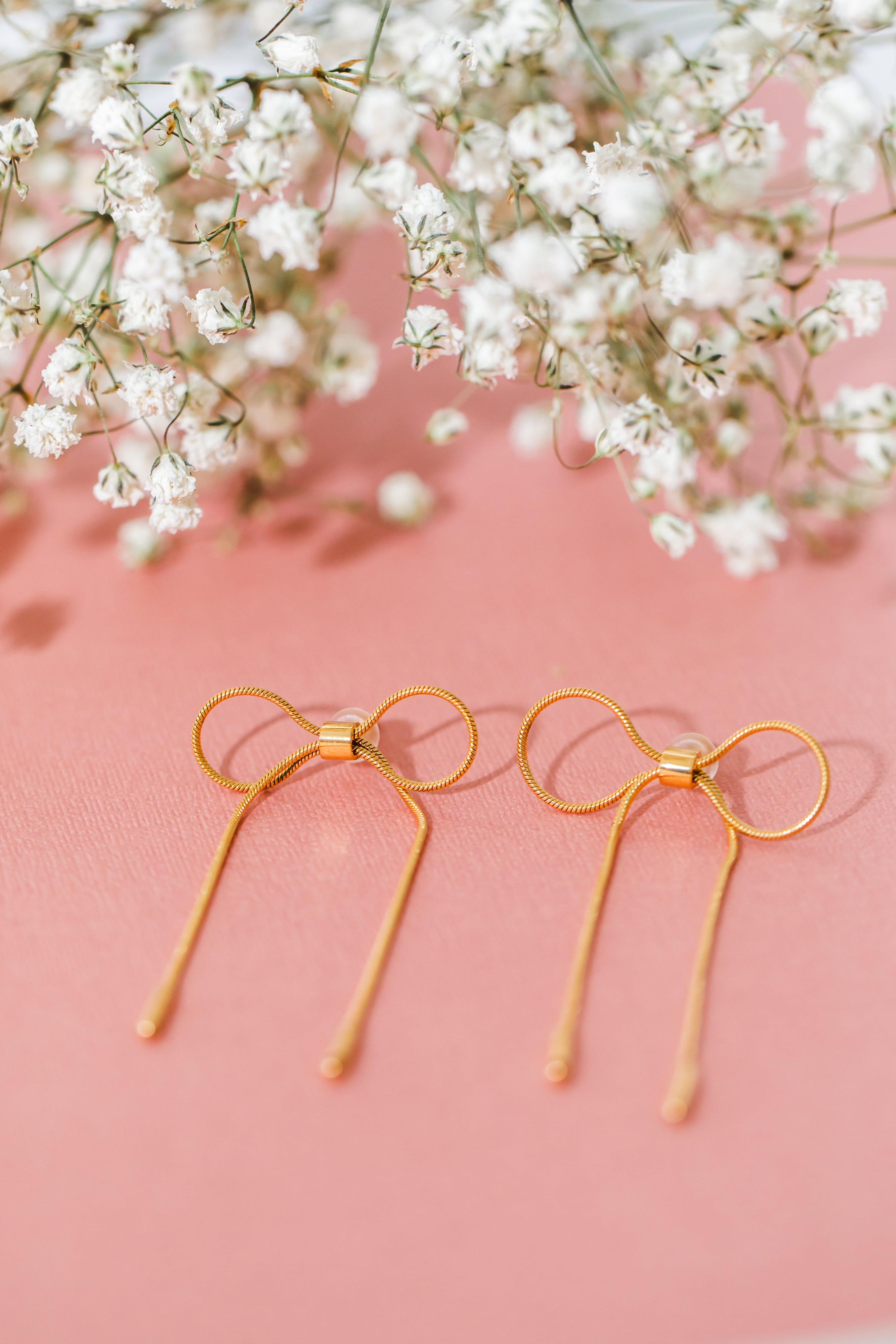 These delicate bow earrings are a current favorite. Made from stainless steel plated with 14K gold, the snake chain is seamlessly formed into a bow and securely soldered to an earring post. Easy to dress up or down.