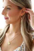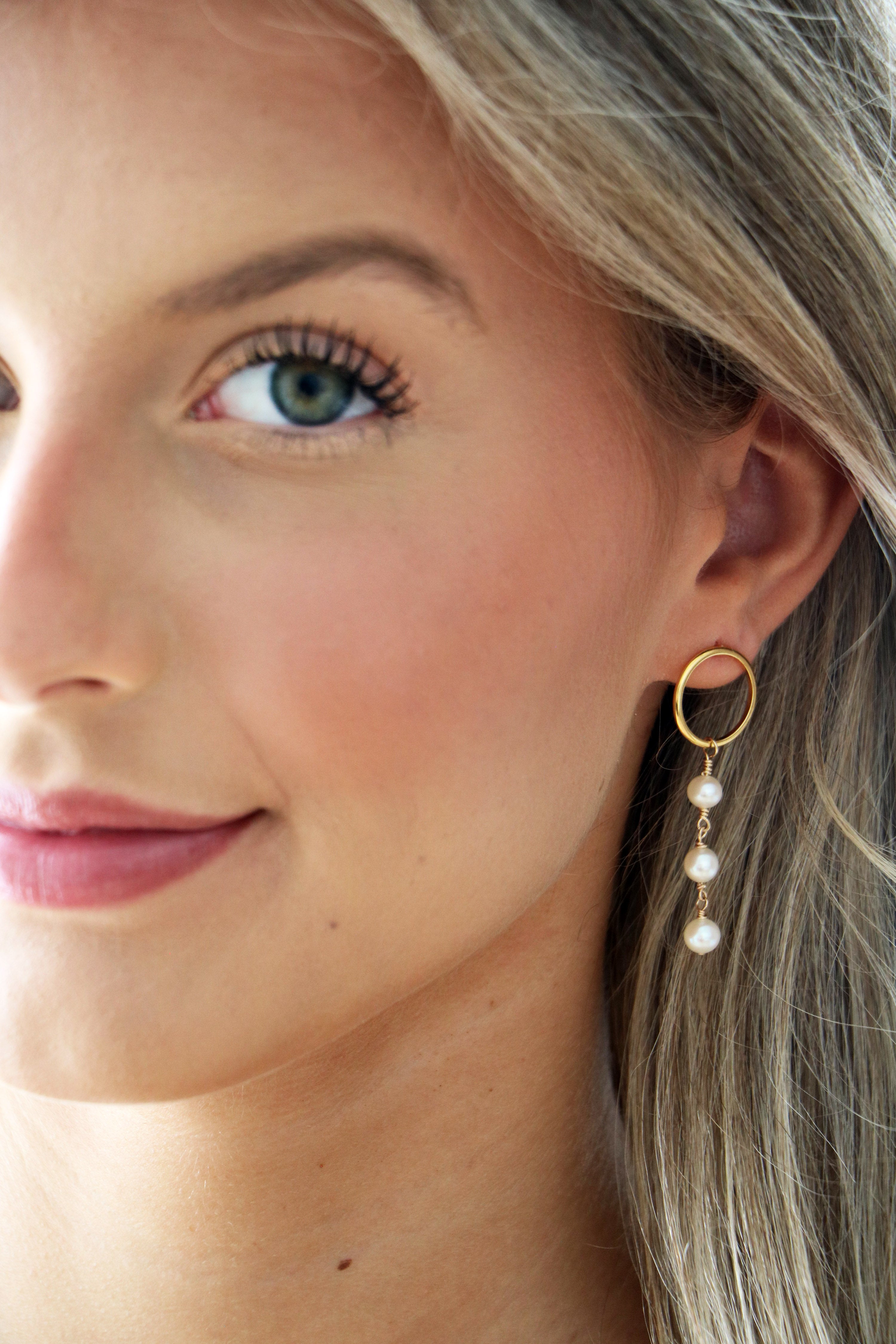 The modern circle shape coupled with the classic pearl drop really makes these earrings something special. They are a statement with a flare of fancy, but still simple enough to wear everyday. The pearls are freshwater cultured pearls with a creamy white color. Earrings are brass plated with 24K gold and have a surgical steel ear post.