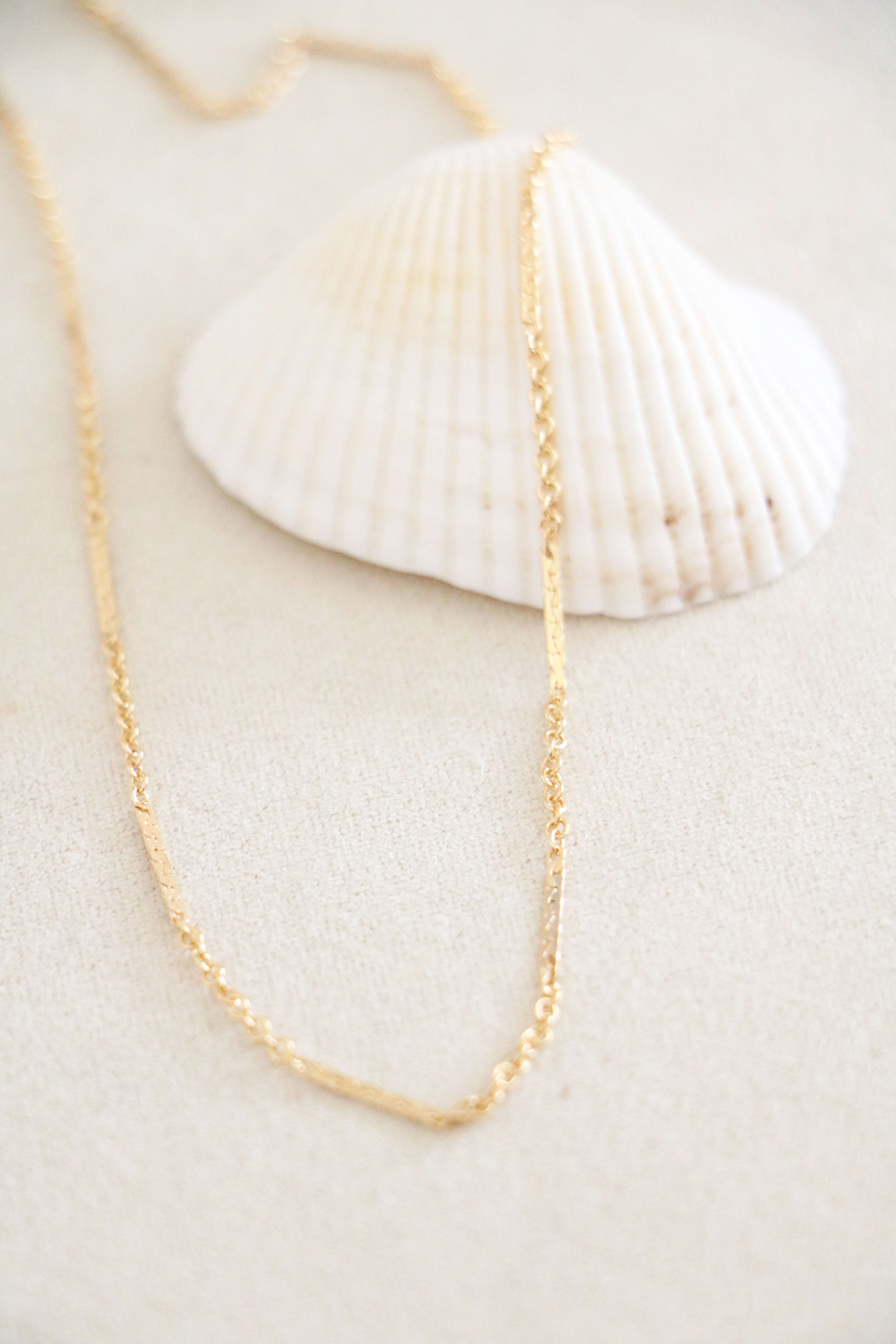 This chain is incredibly versatile. It has a sleek modern look with hints of shimmer from the bar accents spaced throughout the chain. Custom made into a bracelet or necklace in your choice of length. Available in 14K gold filled.