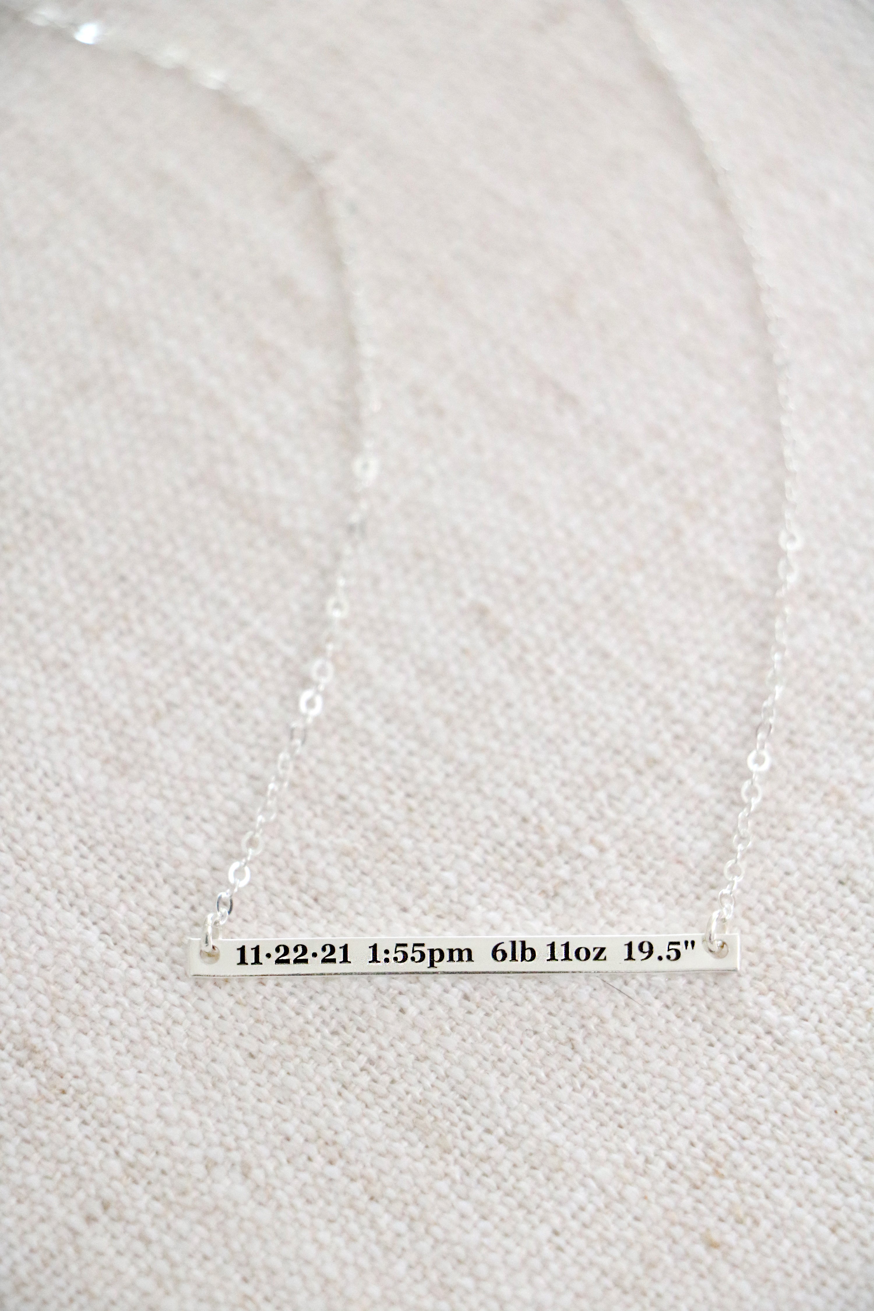 This bar measures approximately 1.5" in length and is made of solid sterling silver. Such a special sentiment to wear your little one's birth stats around your neck. Hung from your choice of chain length, this necklace is solid sterling silver and is 100% nickel and lead free.