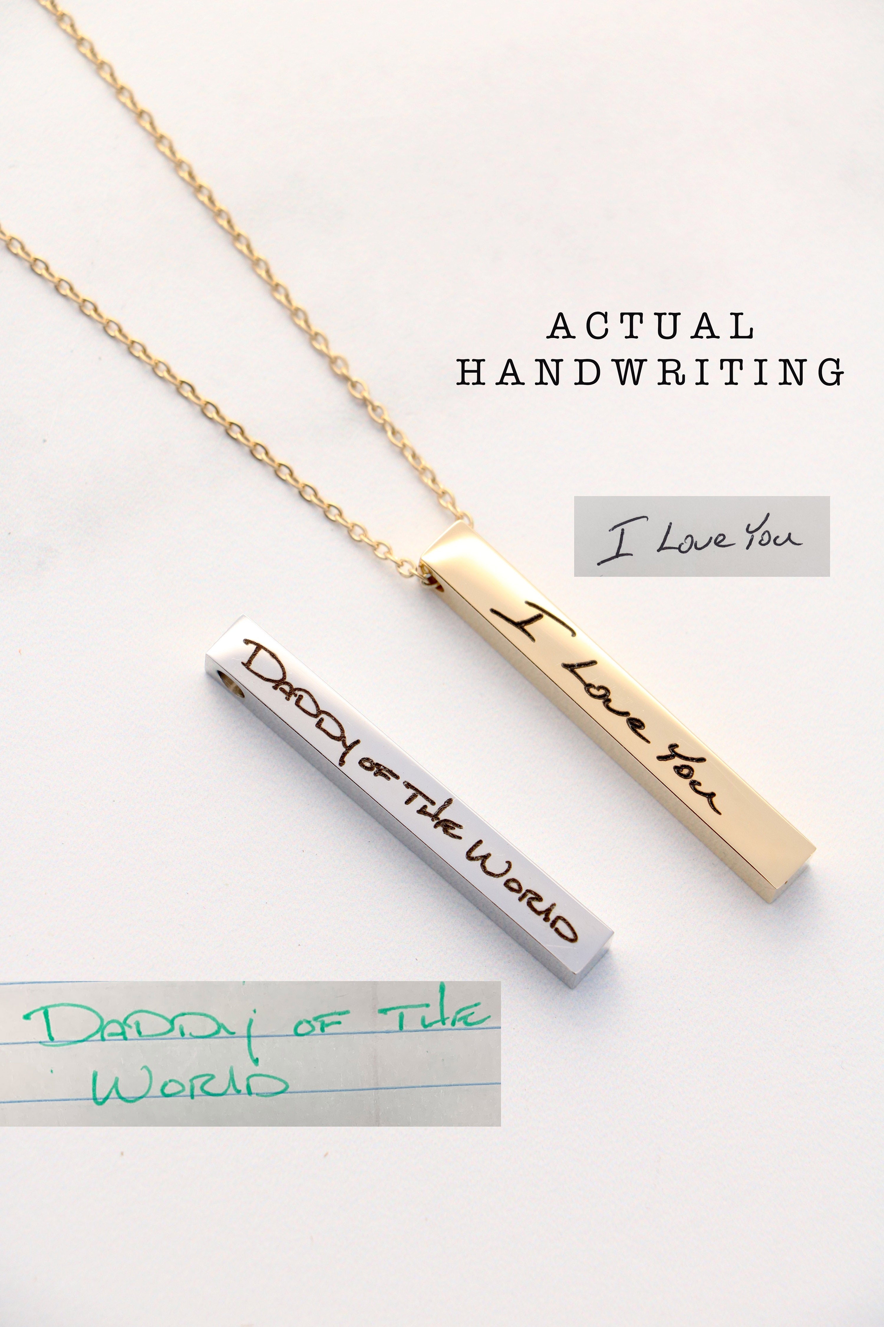 Preserve a beloved memory with our custom signature collection! This necklace is laser engraved from a photo of your actual handwriting, so its a perfect match. Bar charm is made of jewelry grade stainless steel so it is hypoallergenic and never tarnishes, the perfect heirloom quality piece. Attached to stainless steel chain which is adjustable at the back from 16" - 19". Bar measures approximately 40mm by 5mm.