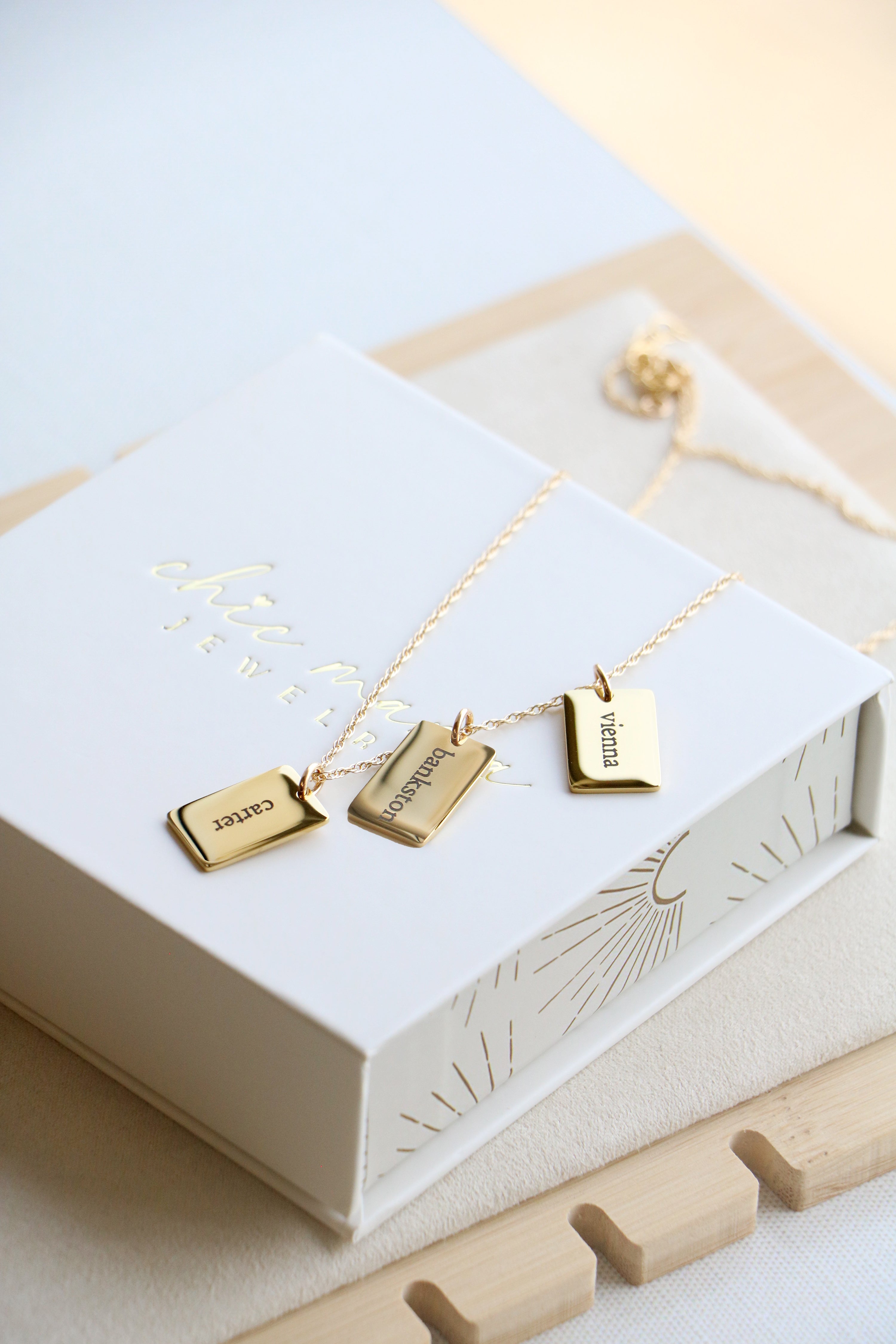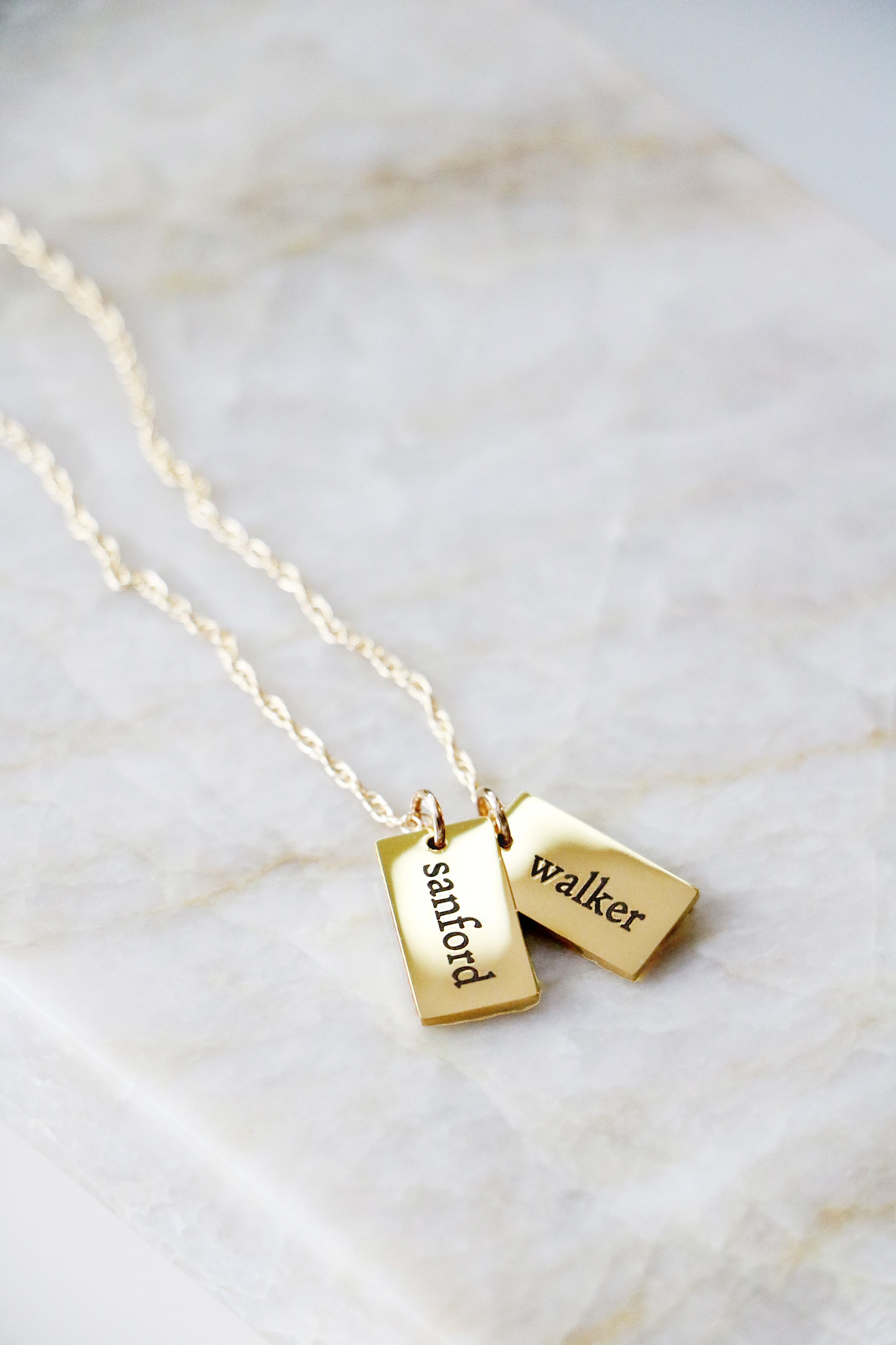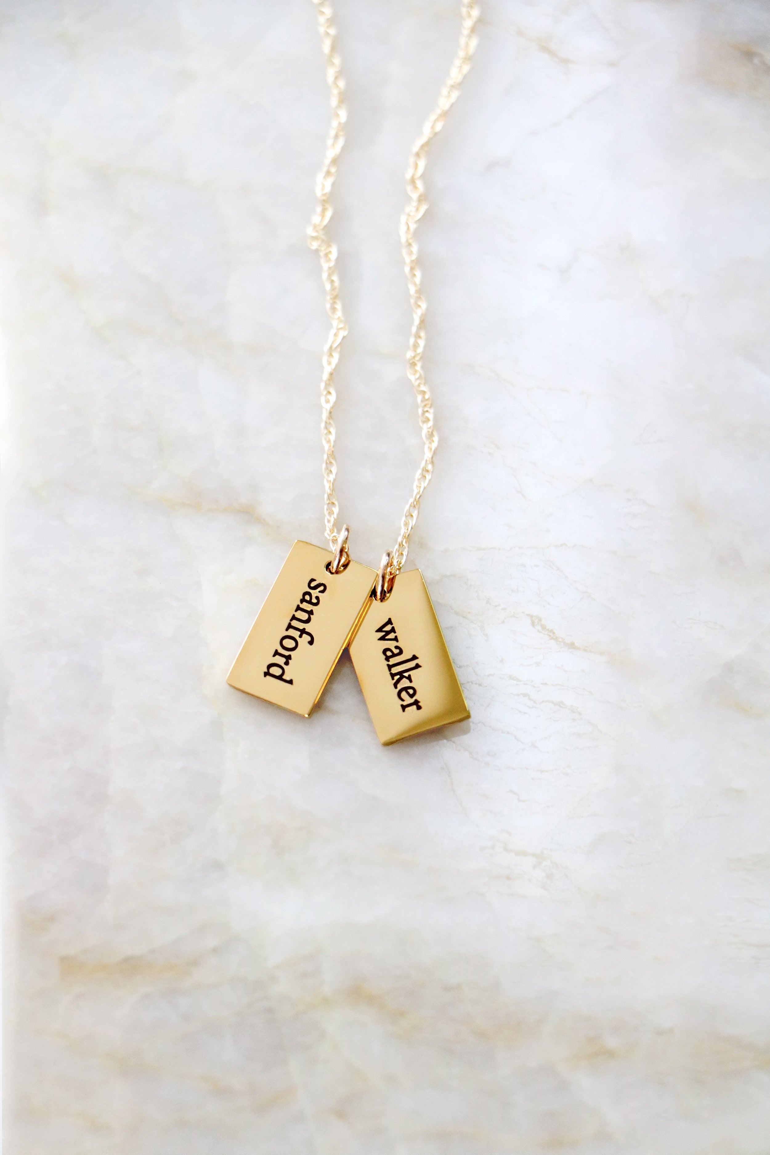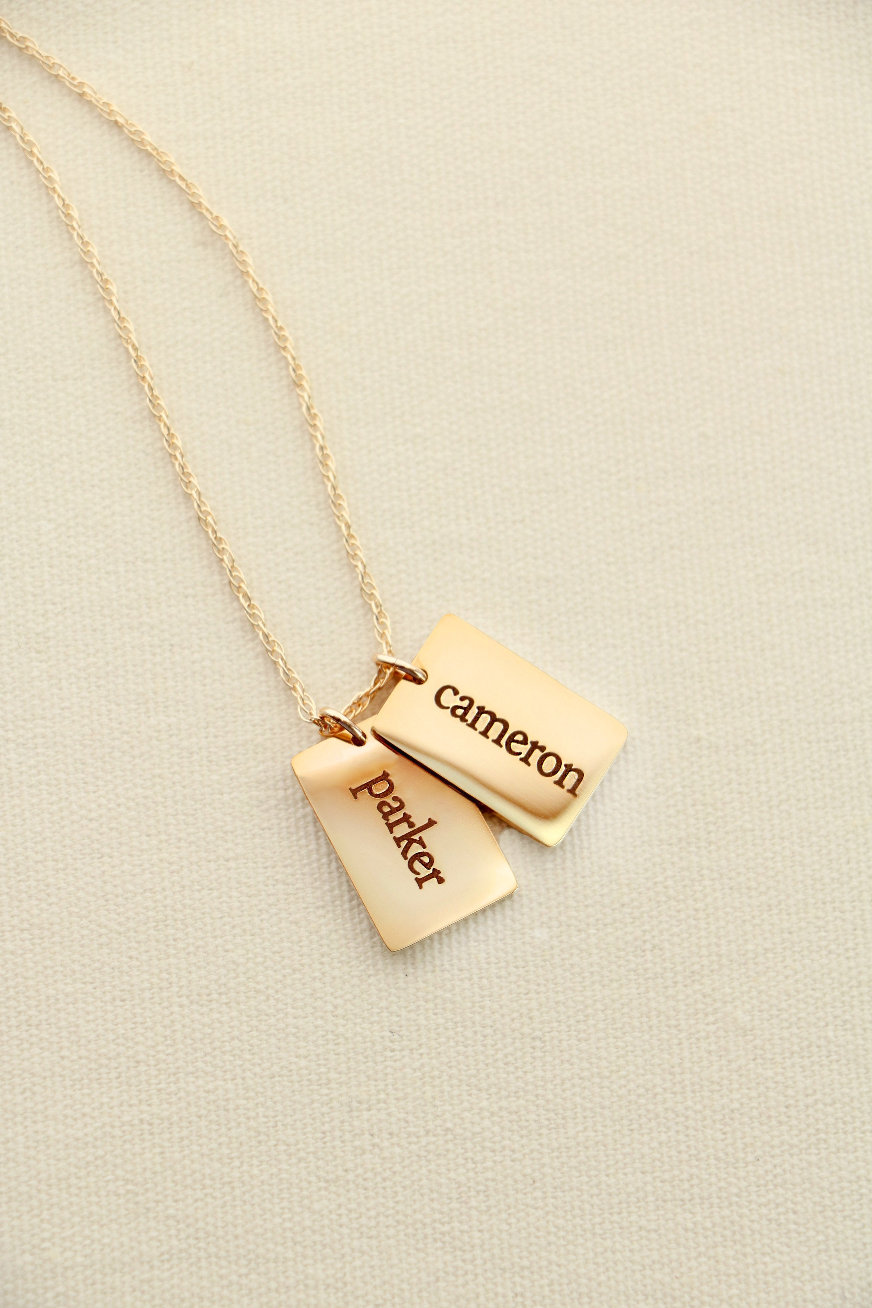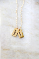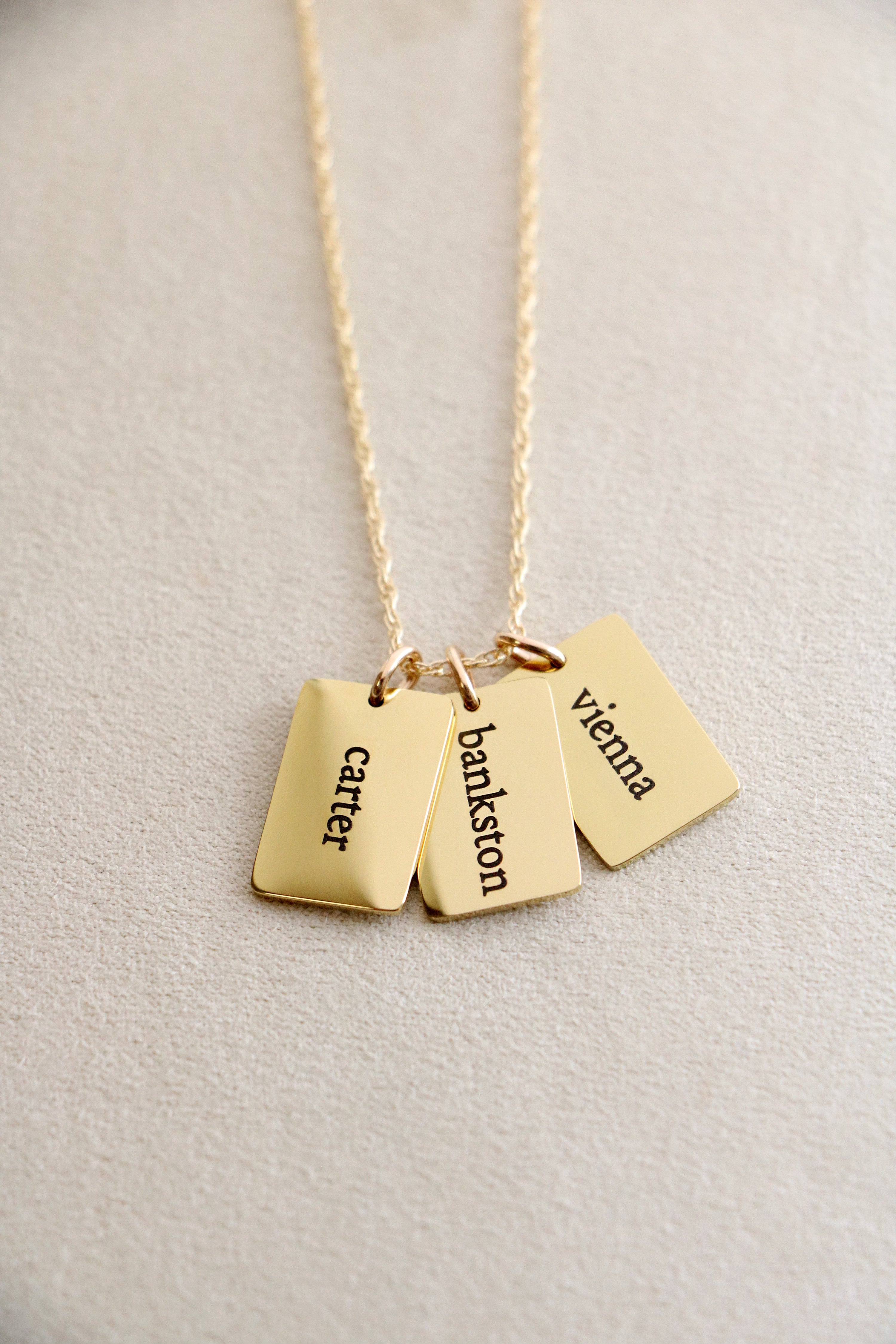 A modern take on the classic name necklace. Choose up to 4 tiny dog tags, each engraved with a single name on the front and optional date of birth on the back. Charms are attached to a sterling silver or 14K gold filled chain in your choice of length.