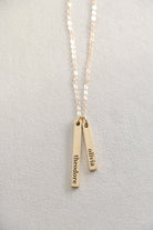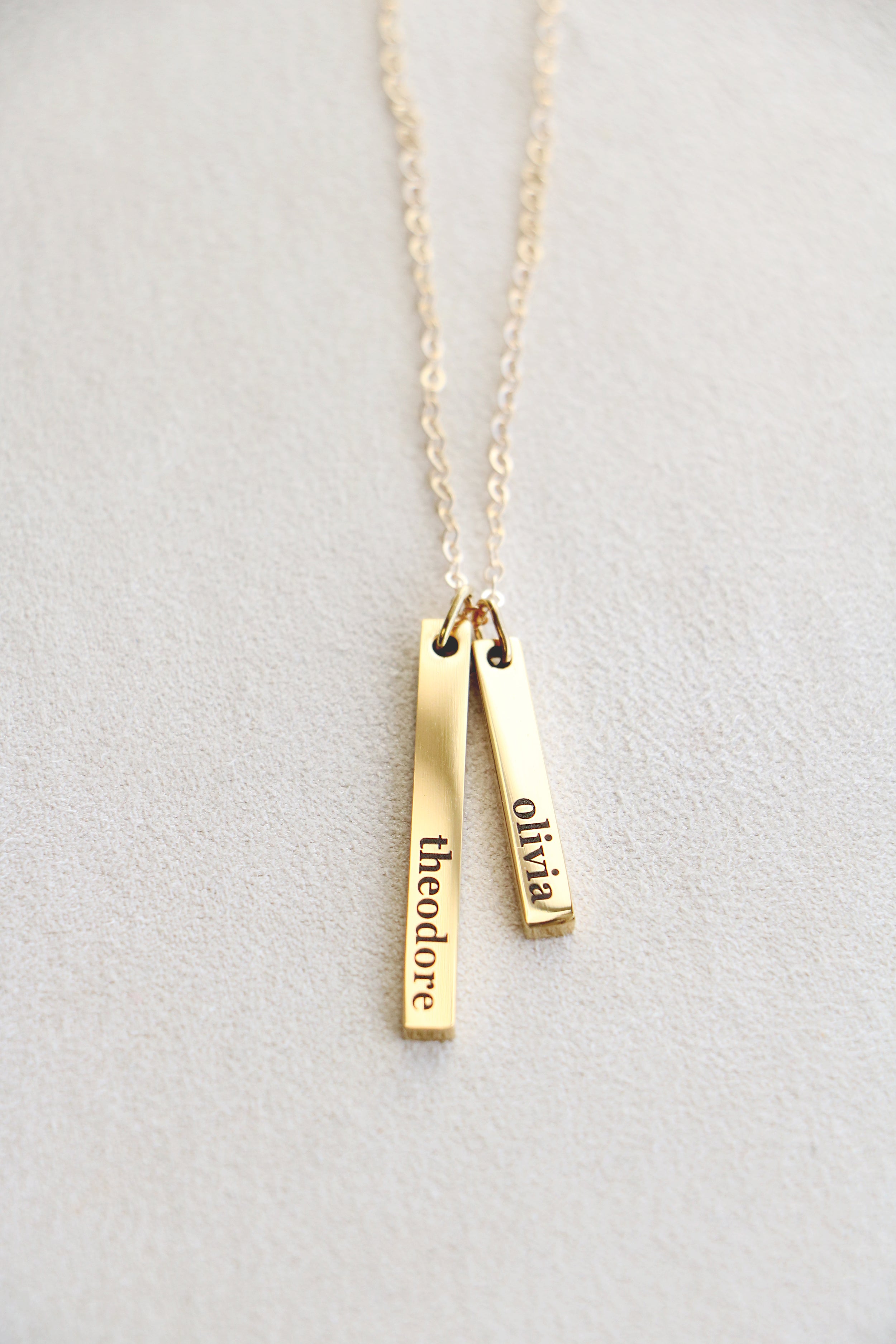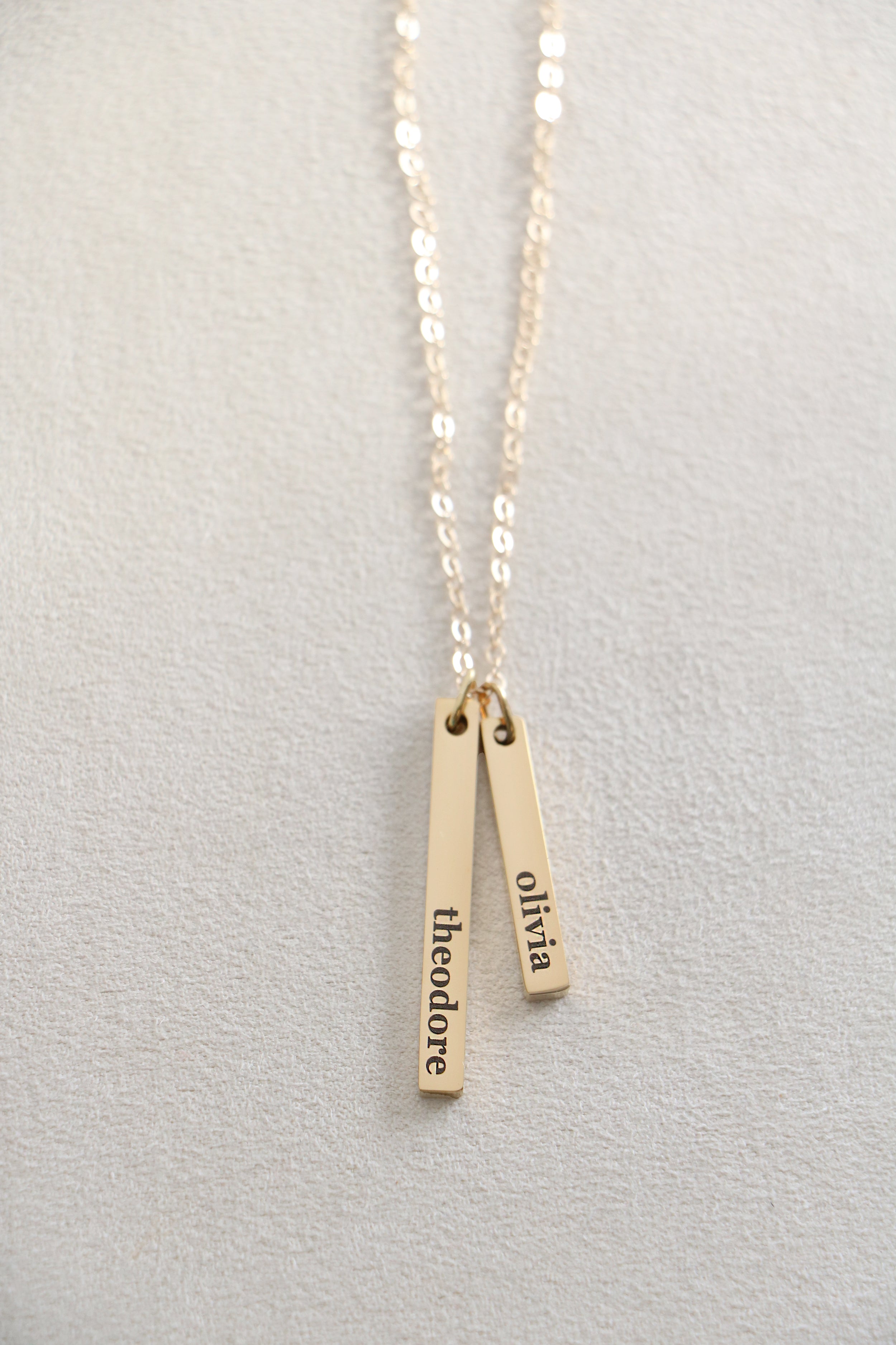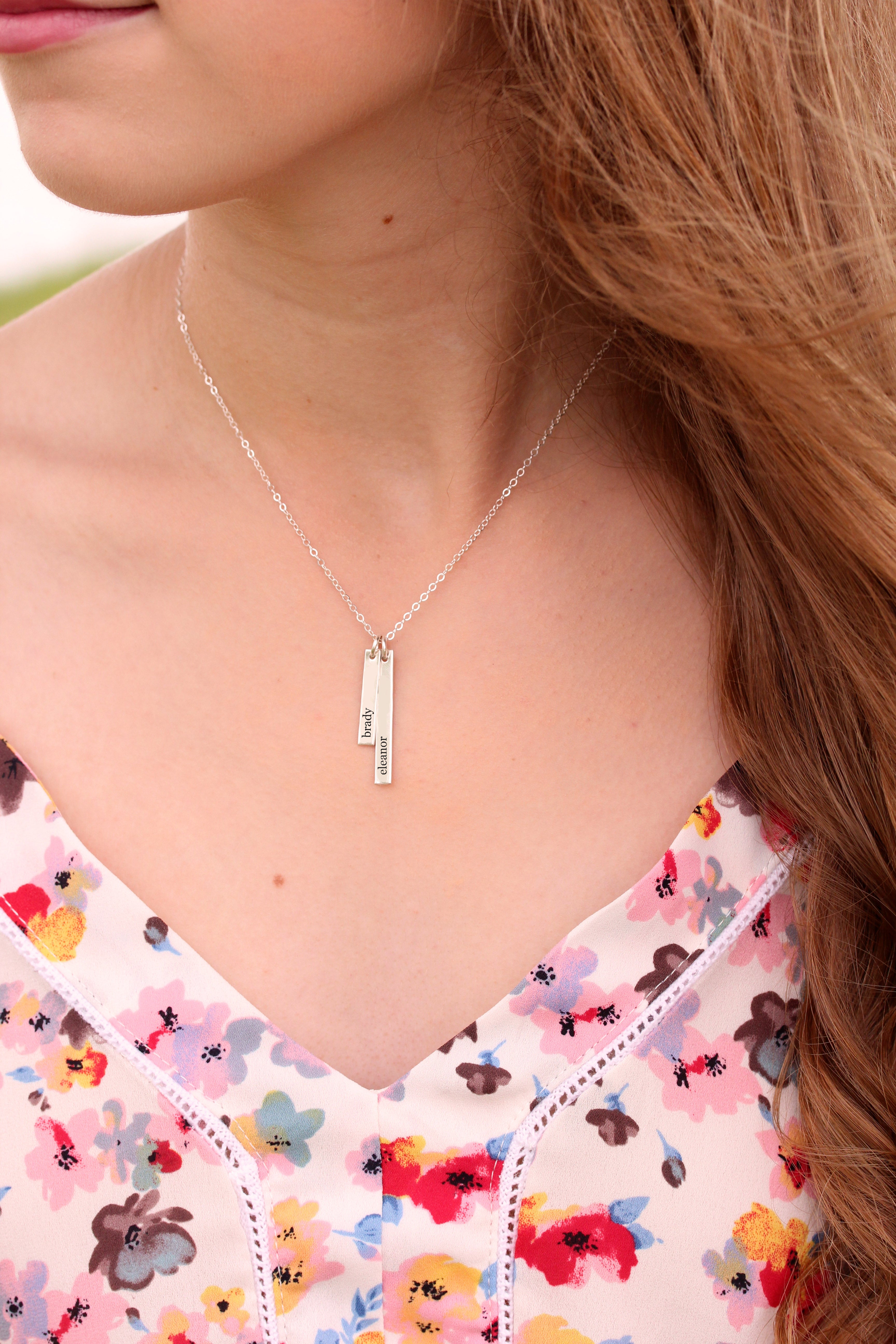 Our most dainty bar necklace! Each vertical bar is just big enough for a single name, favorite word, or date. Choose to add 1-4 bars. Mix and match sizes as you want. Both sides of bar can be engraved.