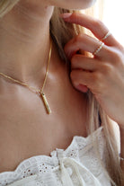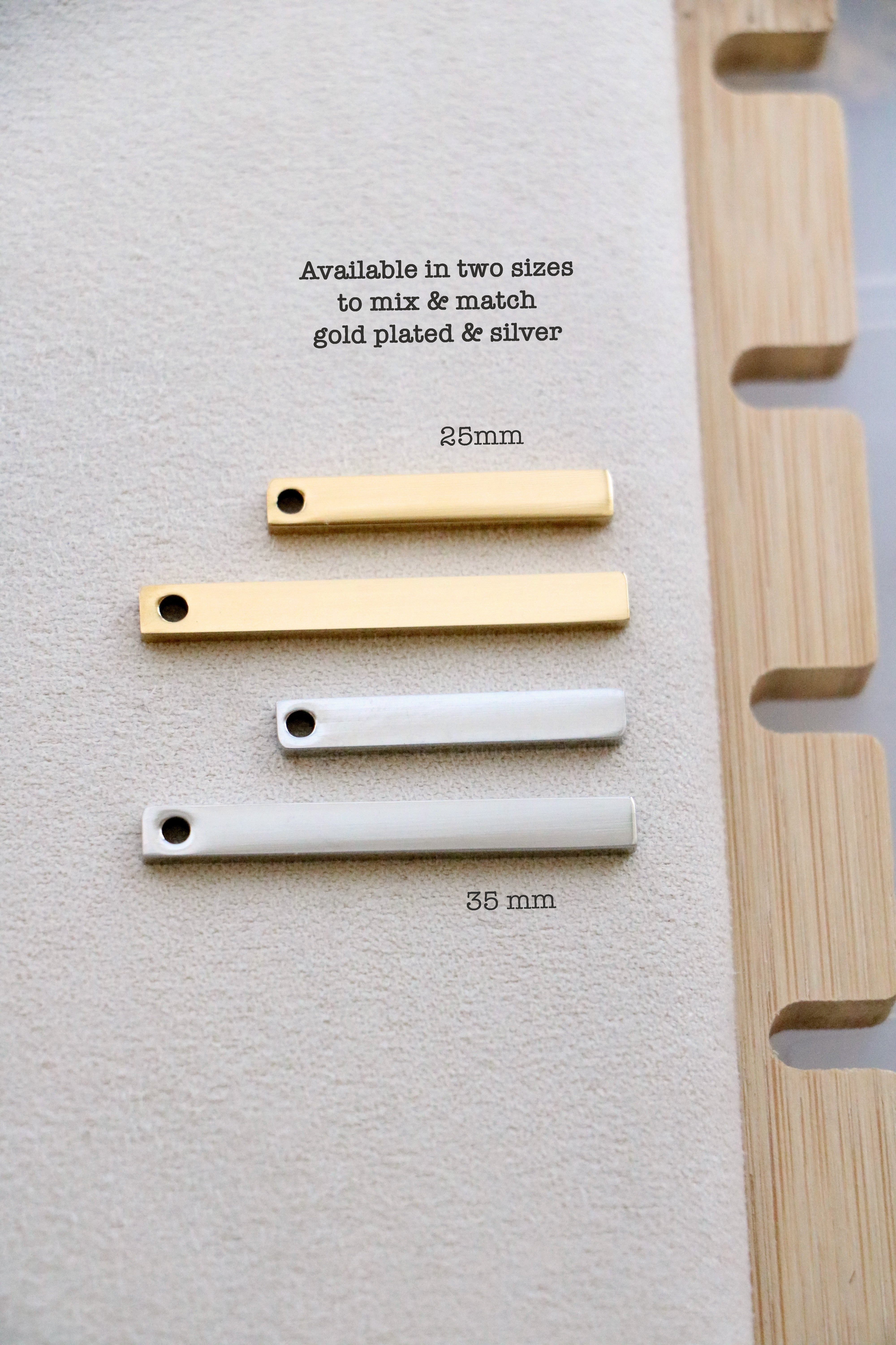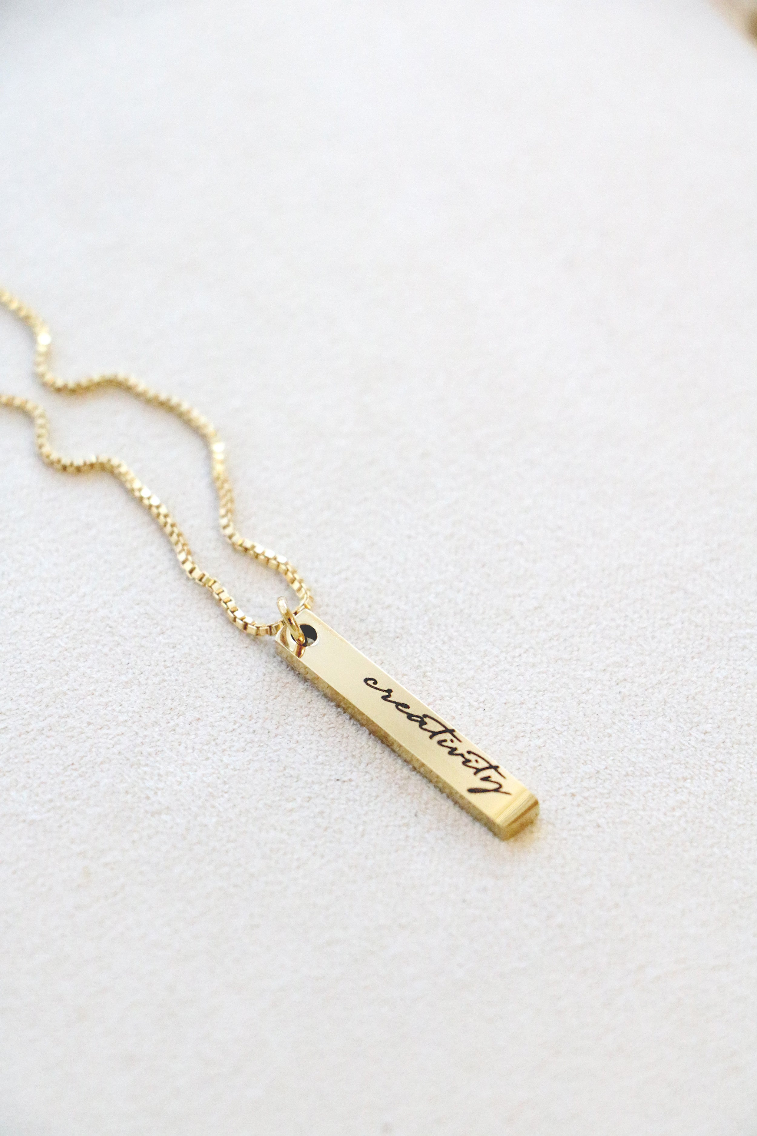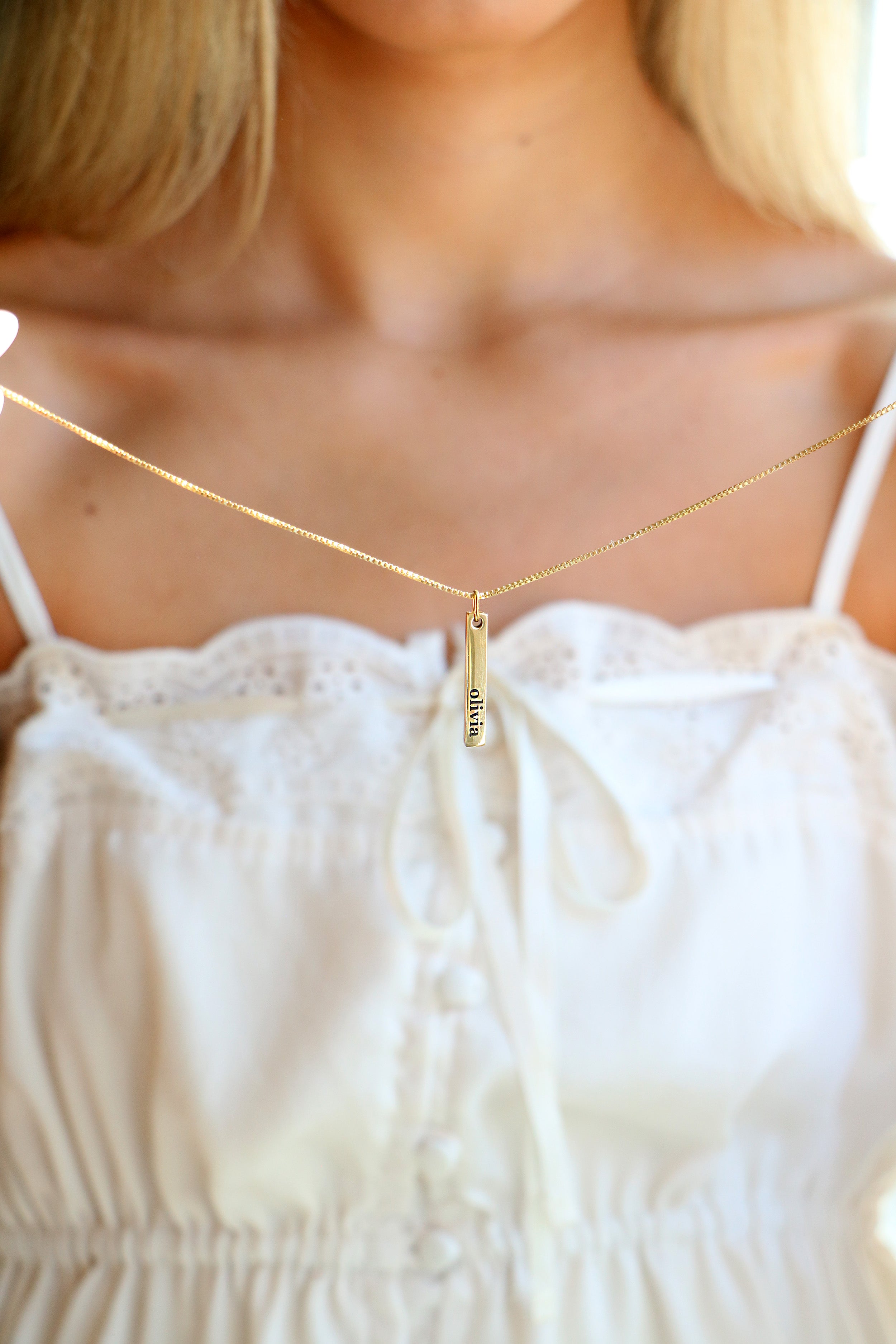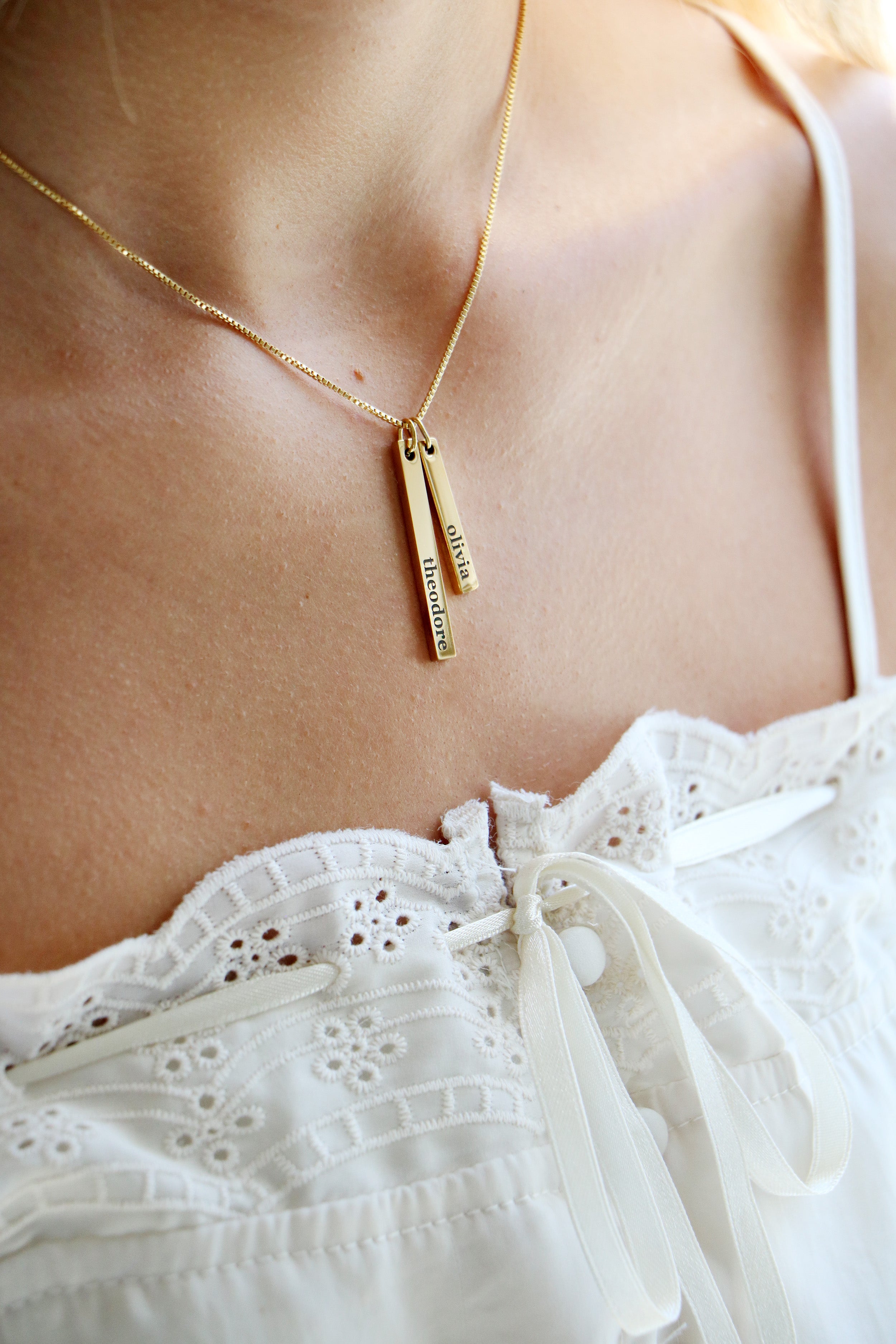 Our most dainty bar necklace! Each vertical bar is just big enough for a single name, favorite word, or date. Choose to add 1-4 bars. Mix and match sizes as you want. Both sides of bar can be engraved.