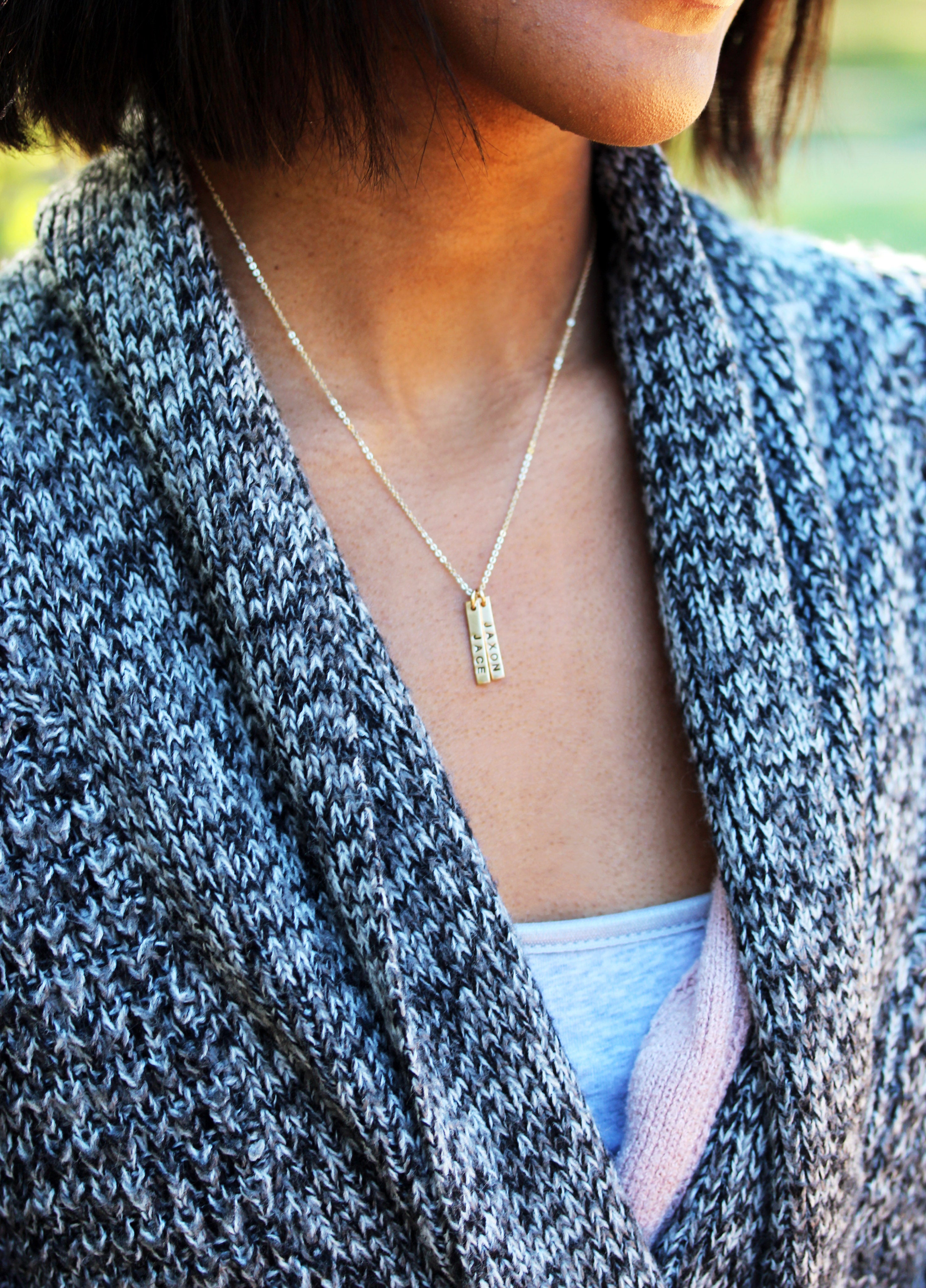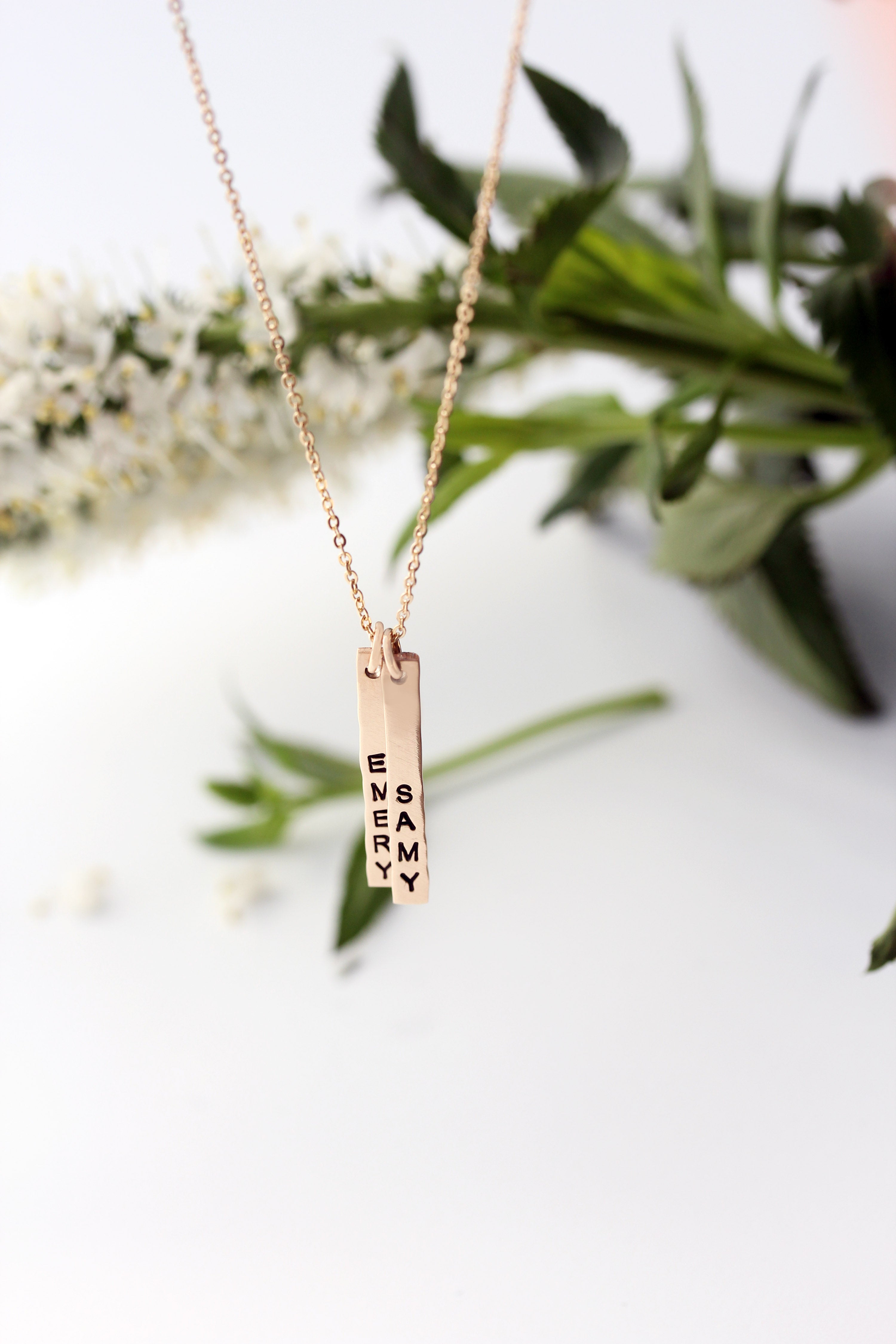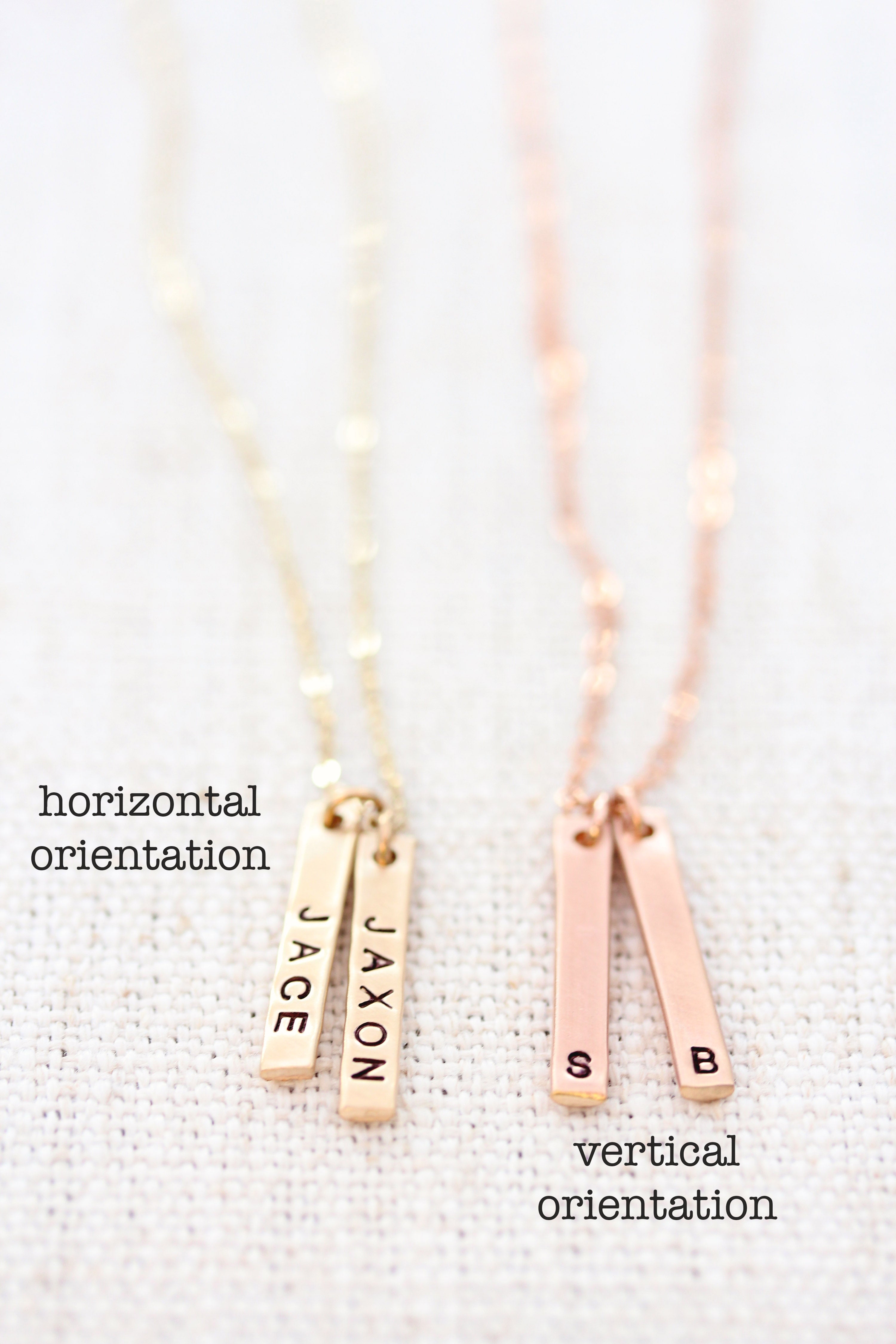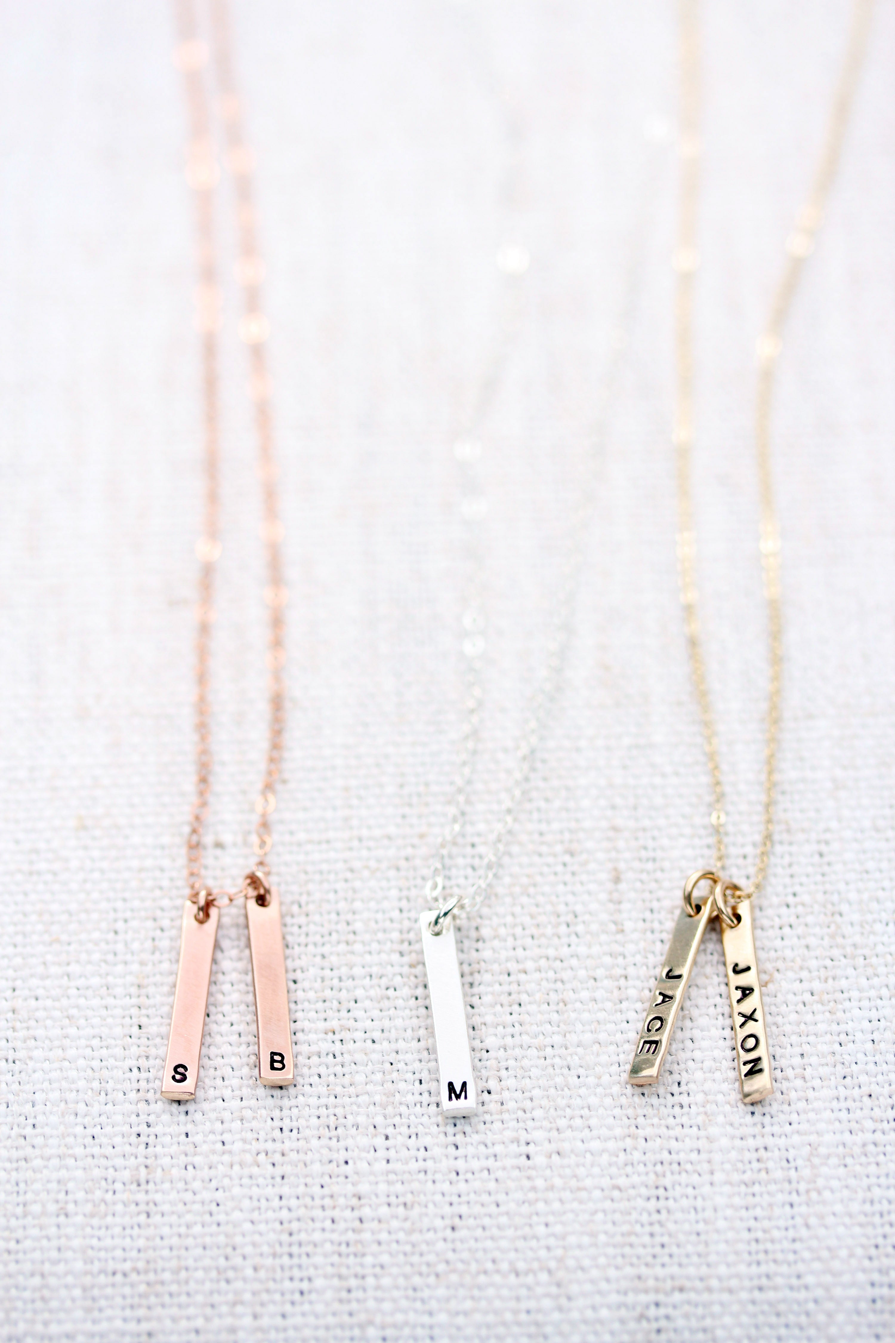 Our most dainty bar necklace! Each vertical bar is just big enough for a single name or initials. Choose to add 1, 2, or 3 bars. Bars are made from sterling silver or 14K gold filled metal. Length of each bar depends on length of characters. Suspended on a delicate cable chain in your choice of length.