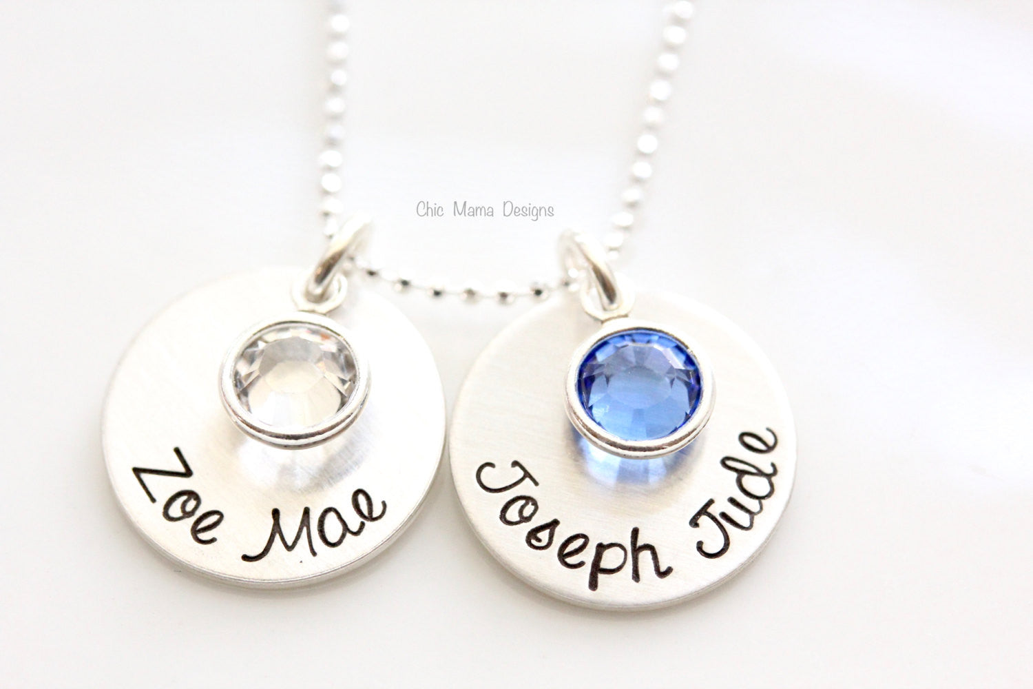 This is a beautiful addition for the mother of two! Two solid sterling silver discs each handstamped with a name are stacked with a beautiful faceted Swarovski crystal to represent your little one's birthmonth. Discs are attached to your choice of sterling silver chain.