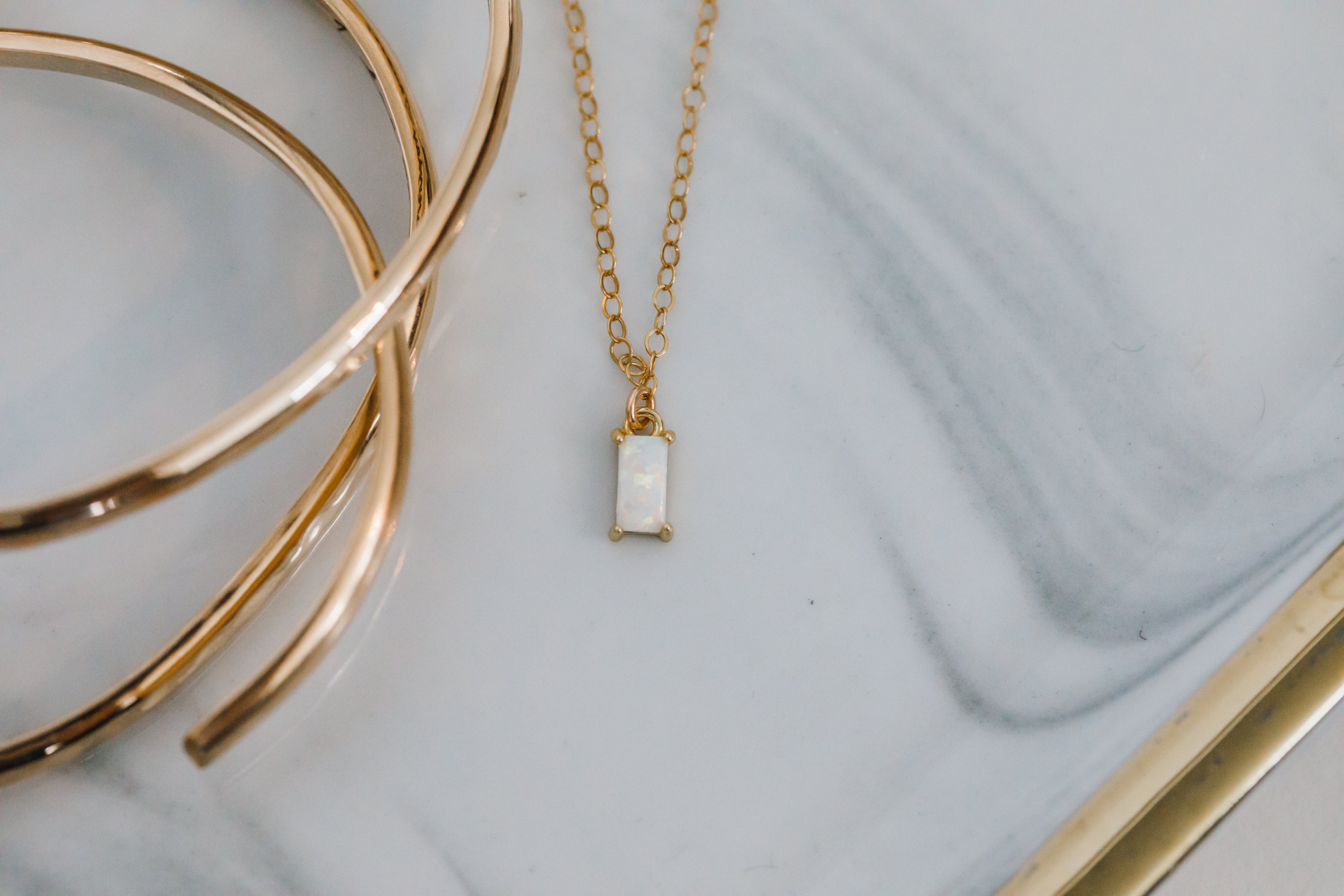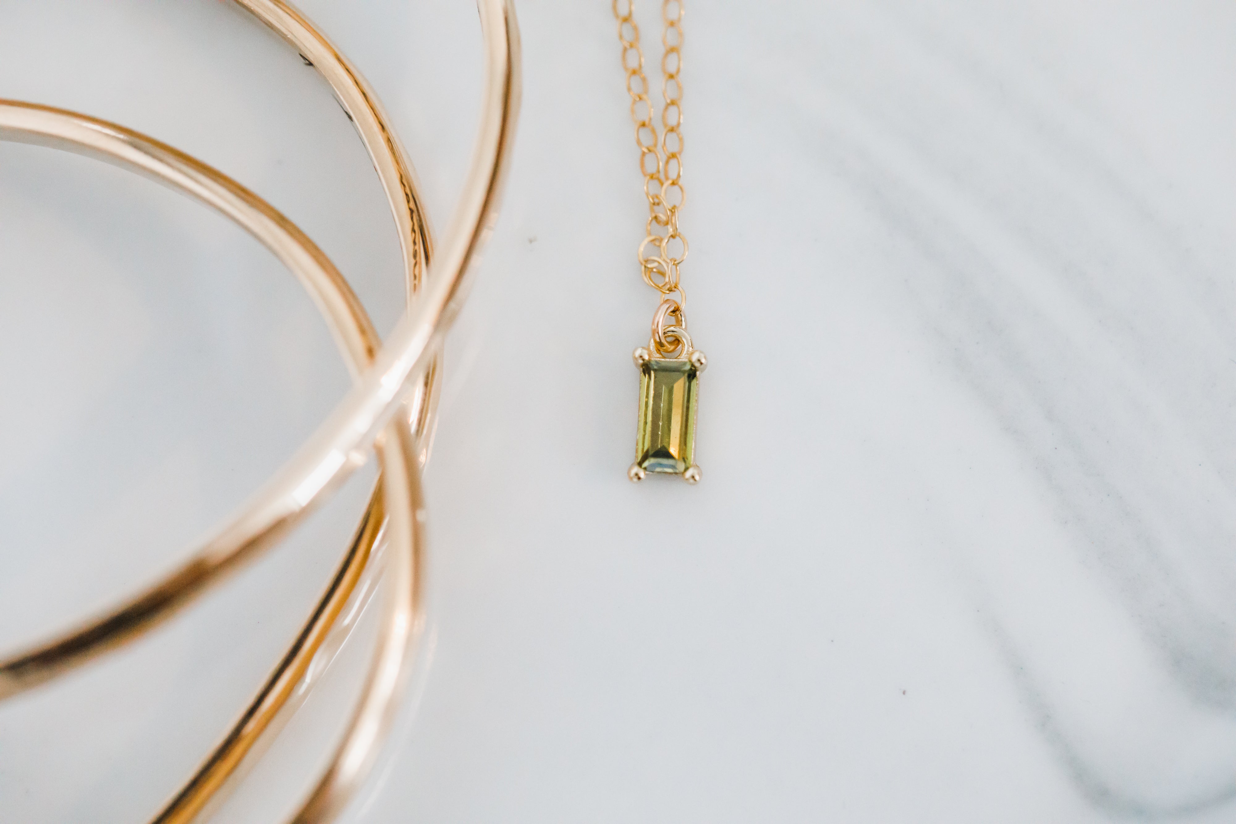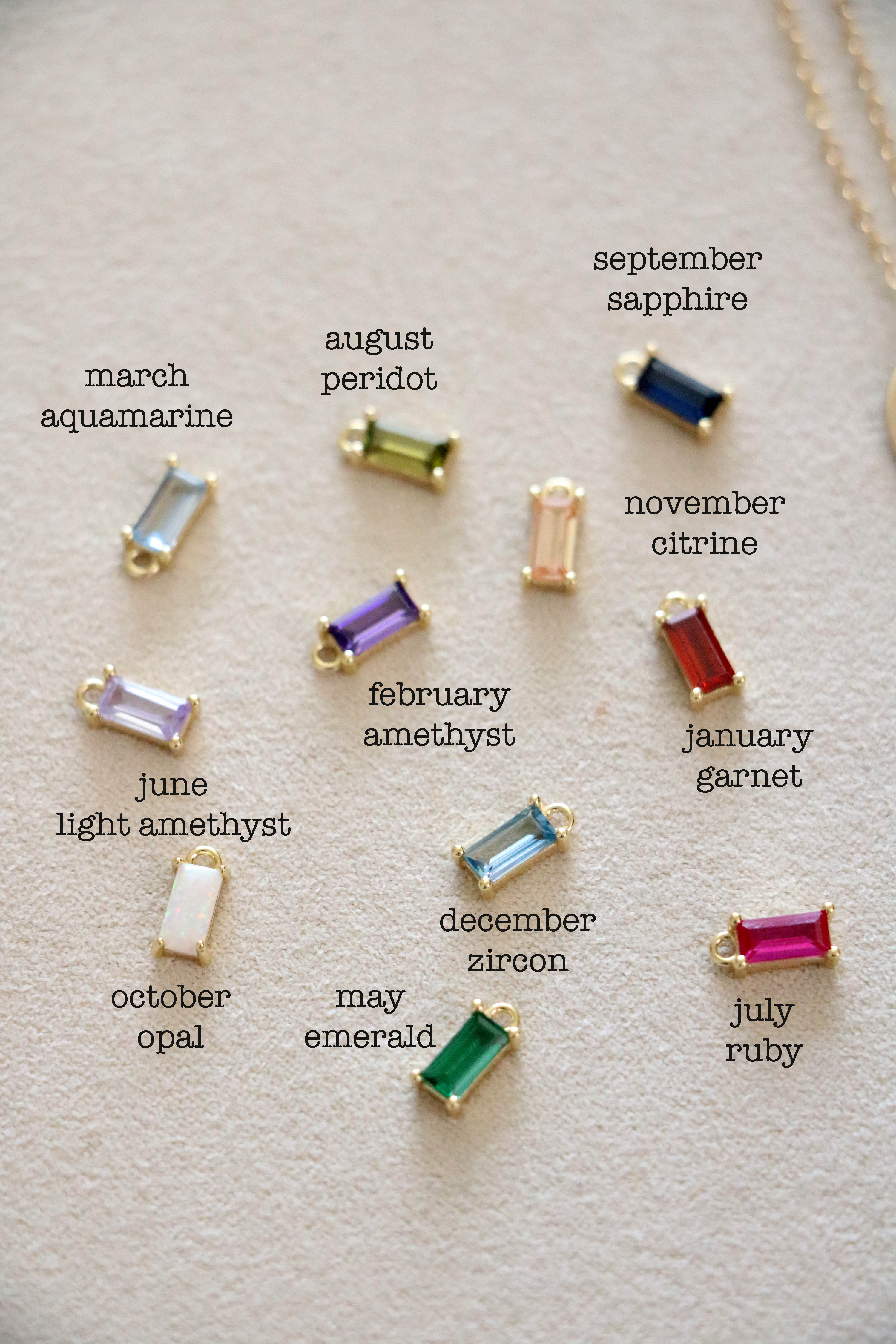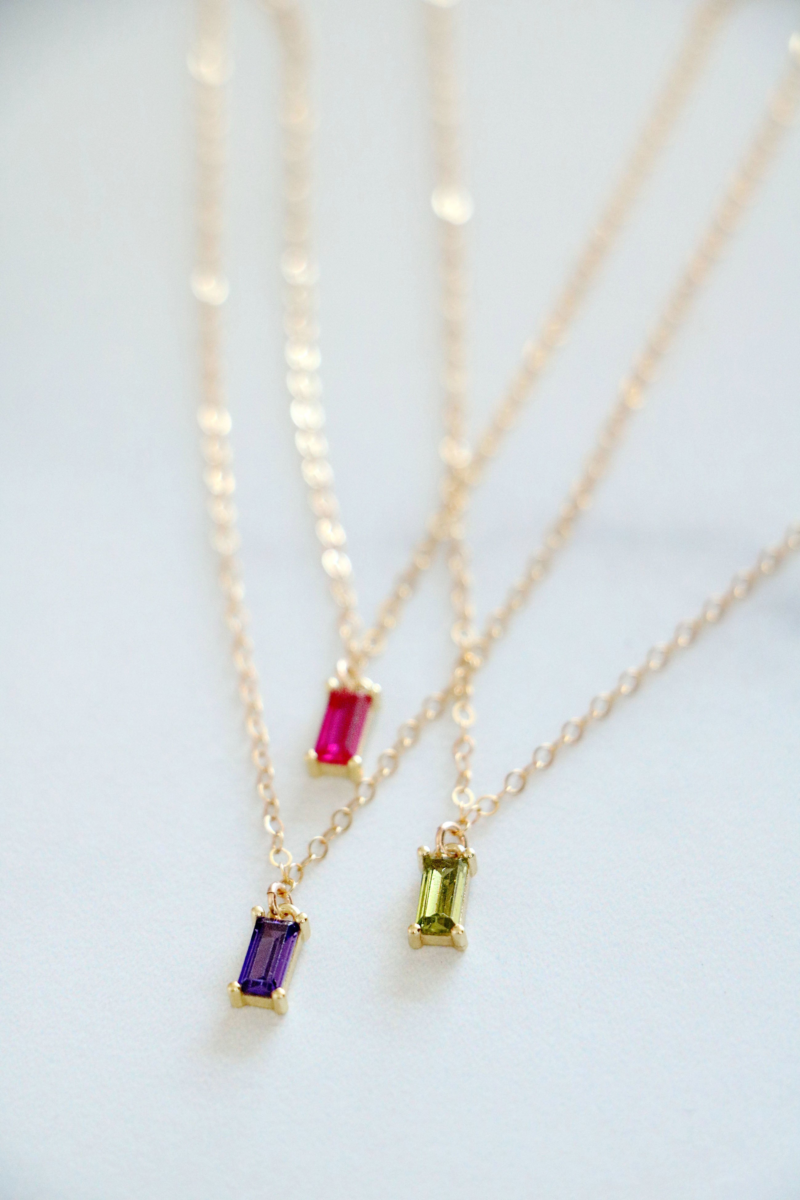 A solitaire baguette birthstone strung from a fine cable chain. Layering multiple necklaces together creates a modern stack with pops of color. Available in 14K gold filled.