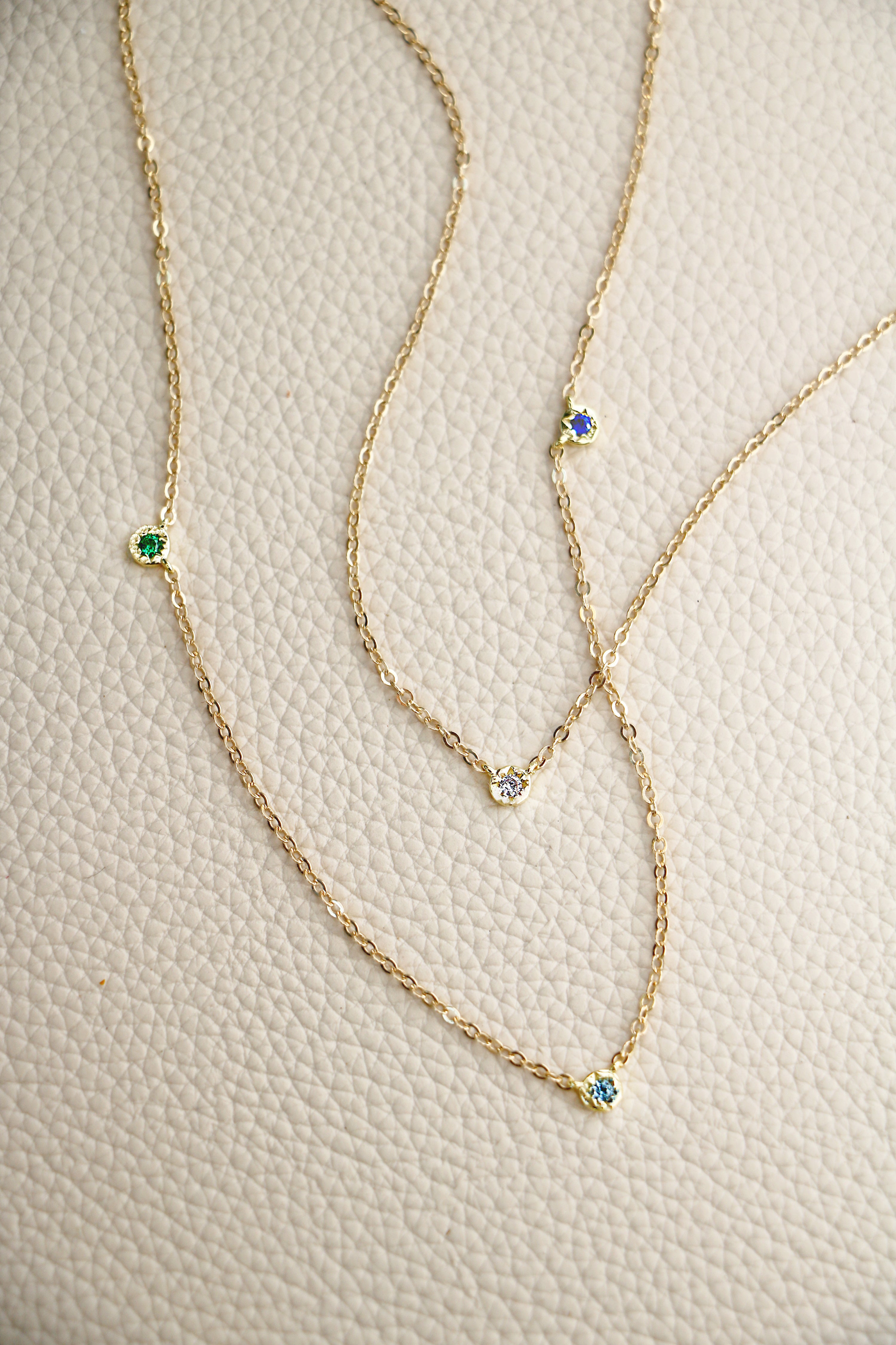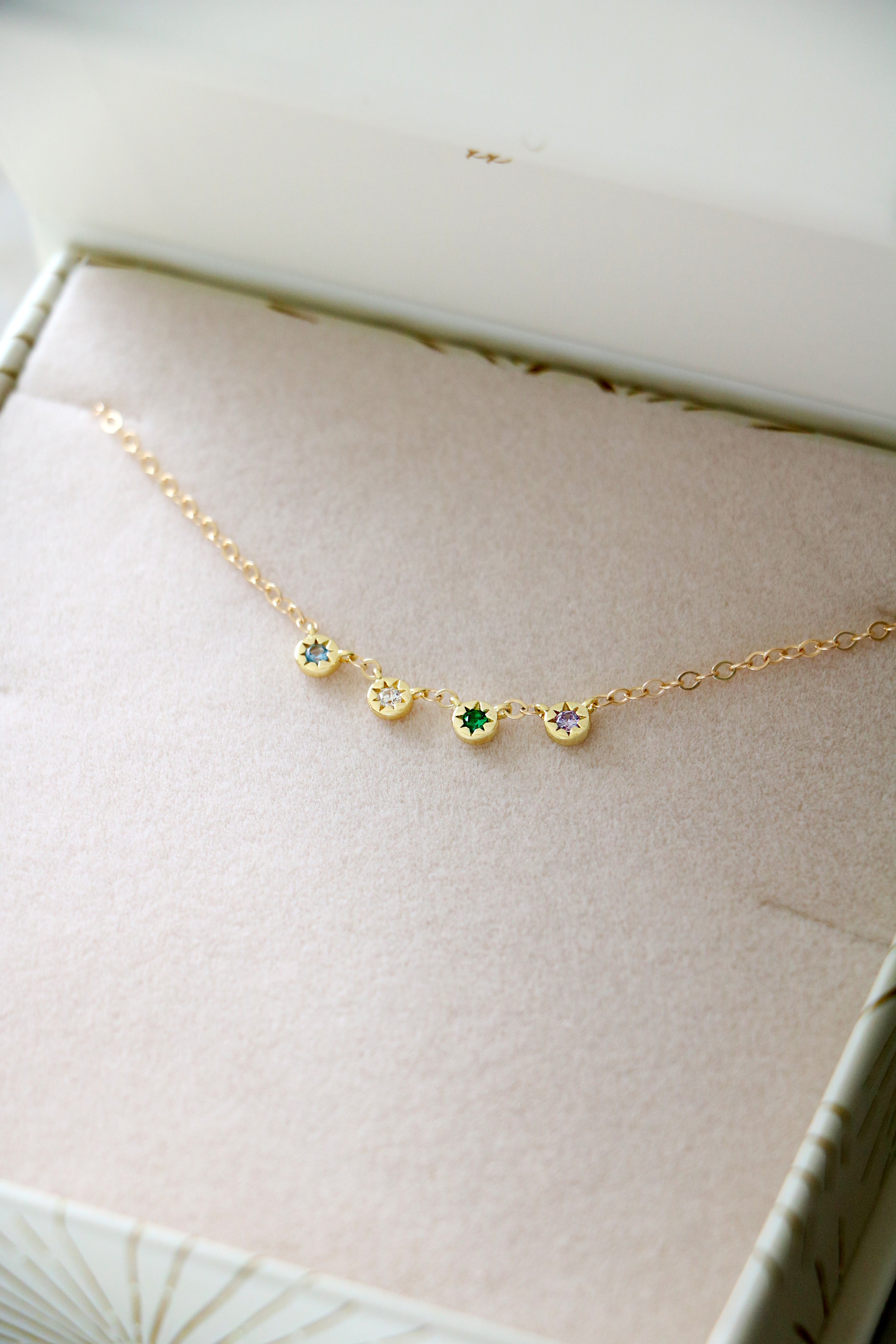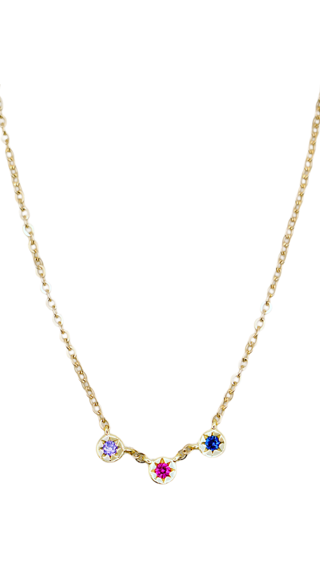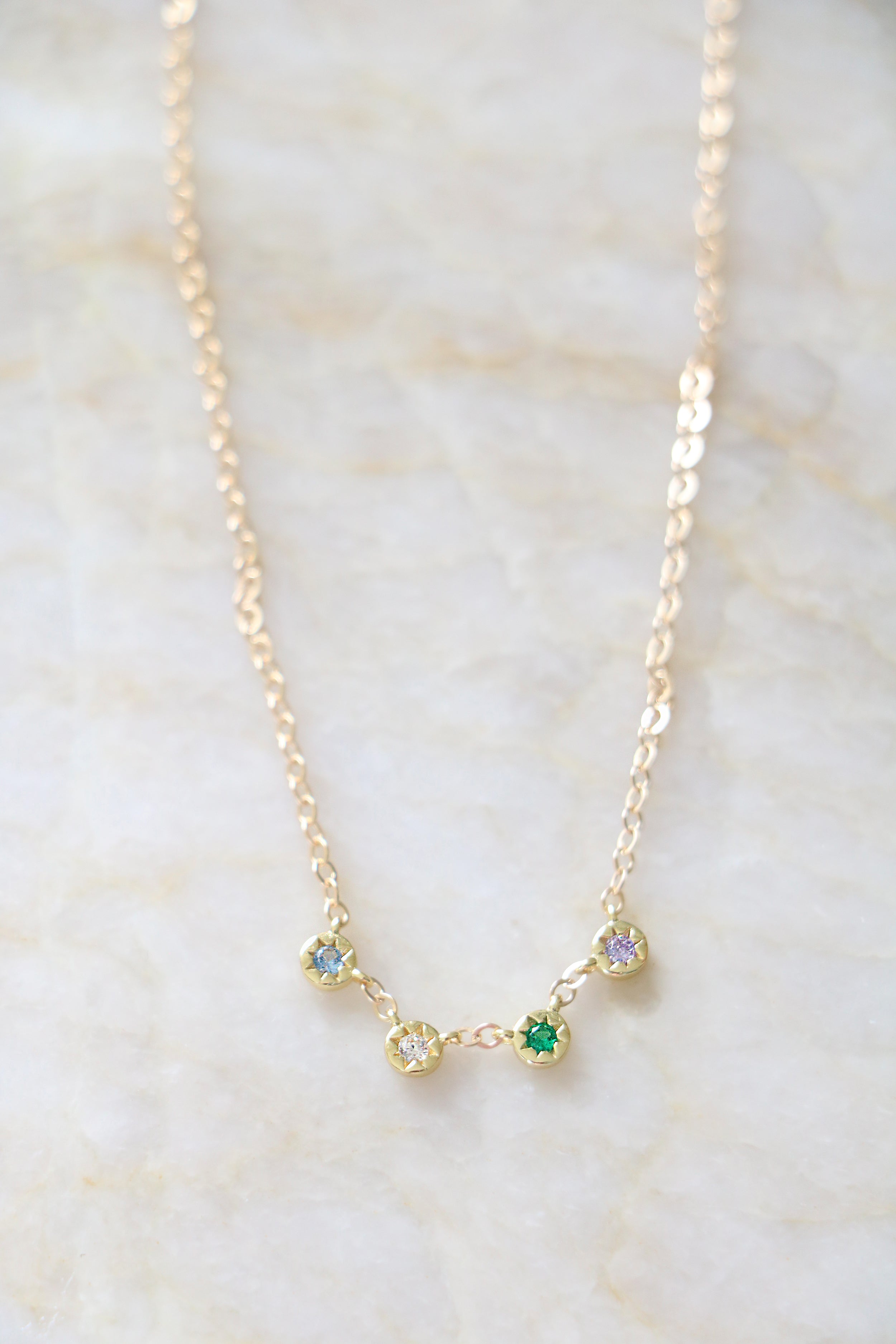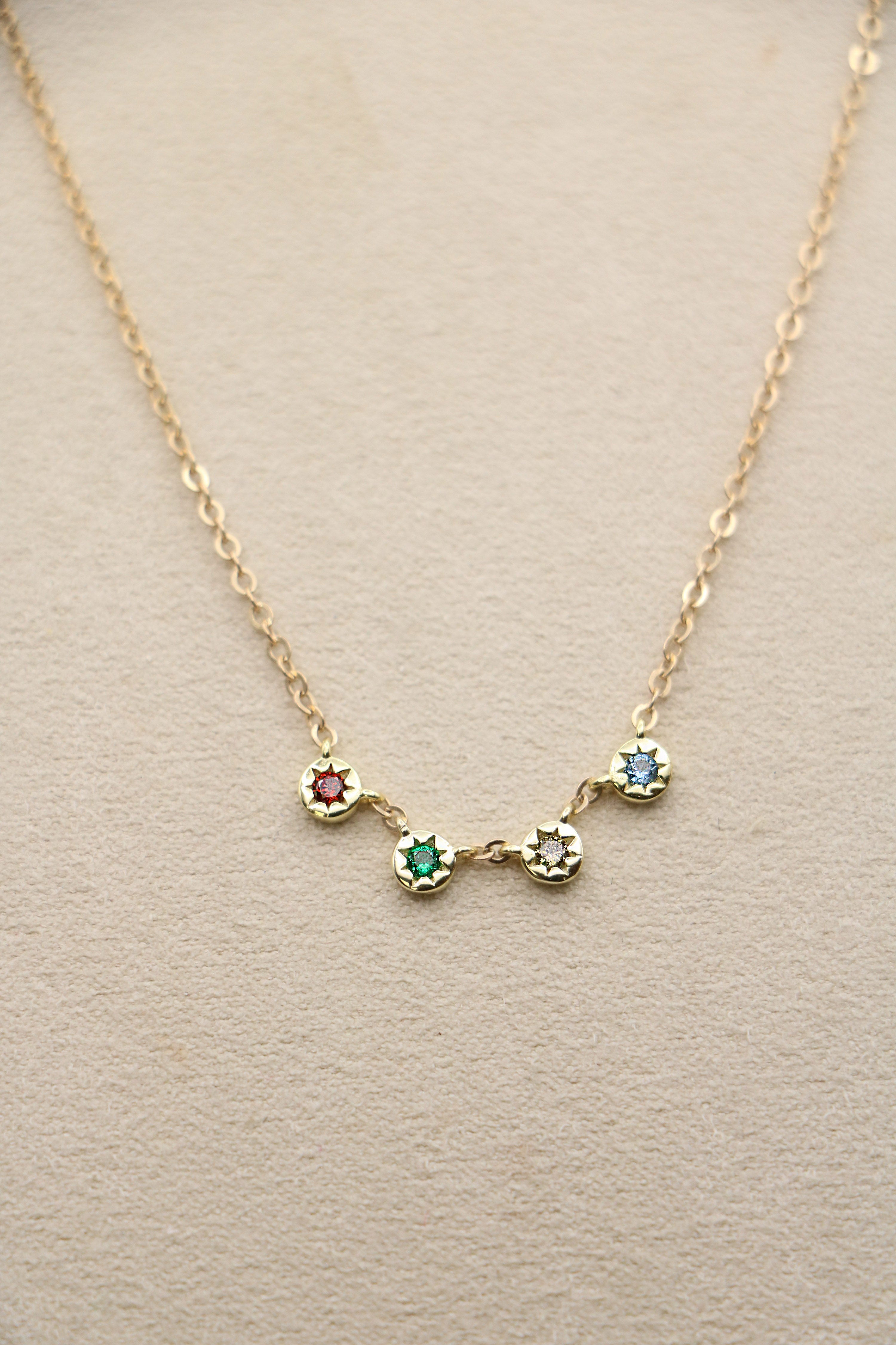 The prettiest little pops of color adorn a delicate cable chain. A birthstone of your choice is hand set in a tiny bezel with details of the sun. String one birthstone, or several in the chain, to create your unique piece. Available with up to 6 birthstones evenly spaced on the chain or clustered near the bottom. Cover photo shows clustered layout.