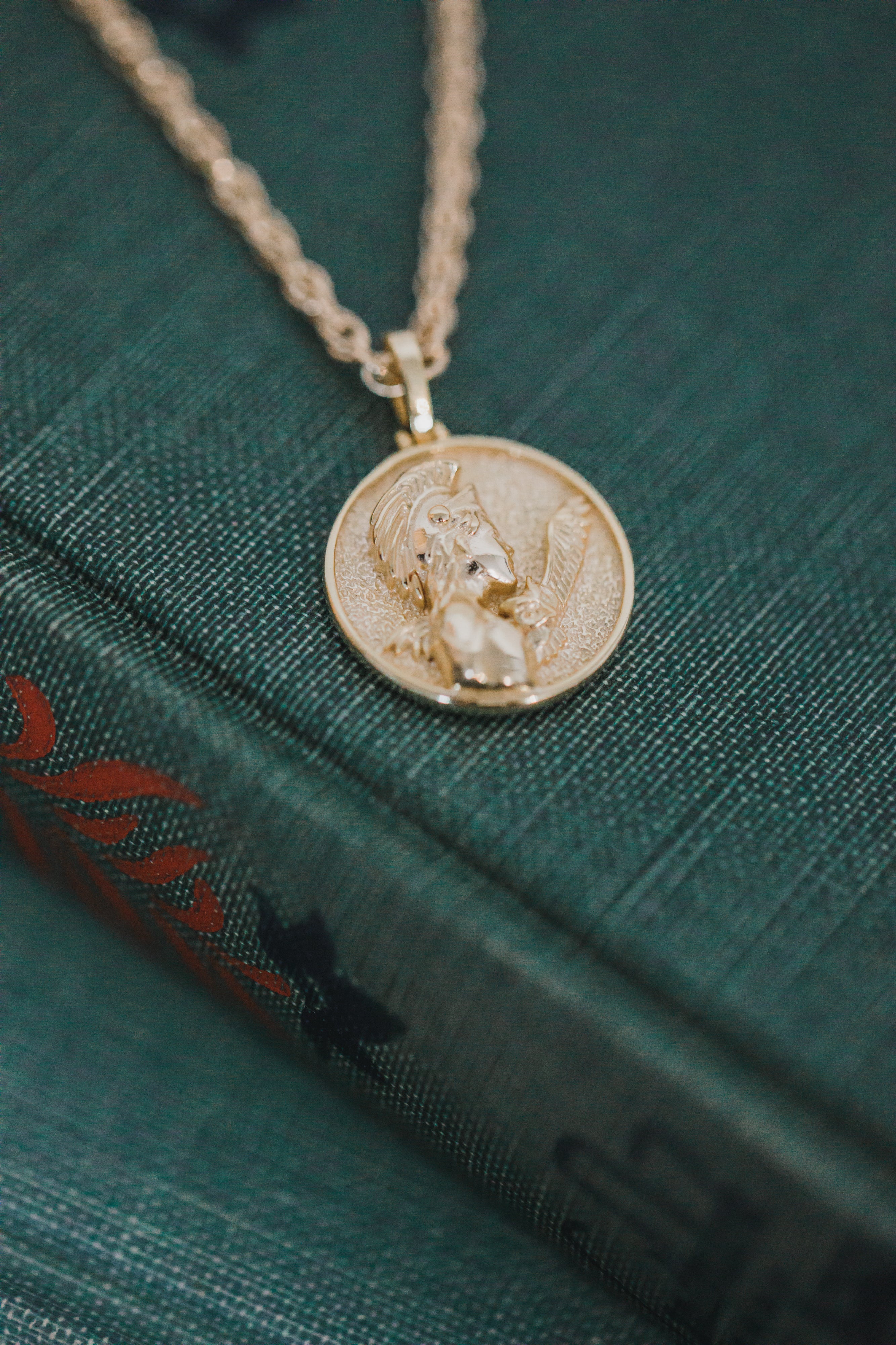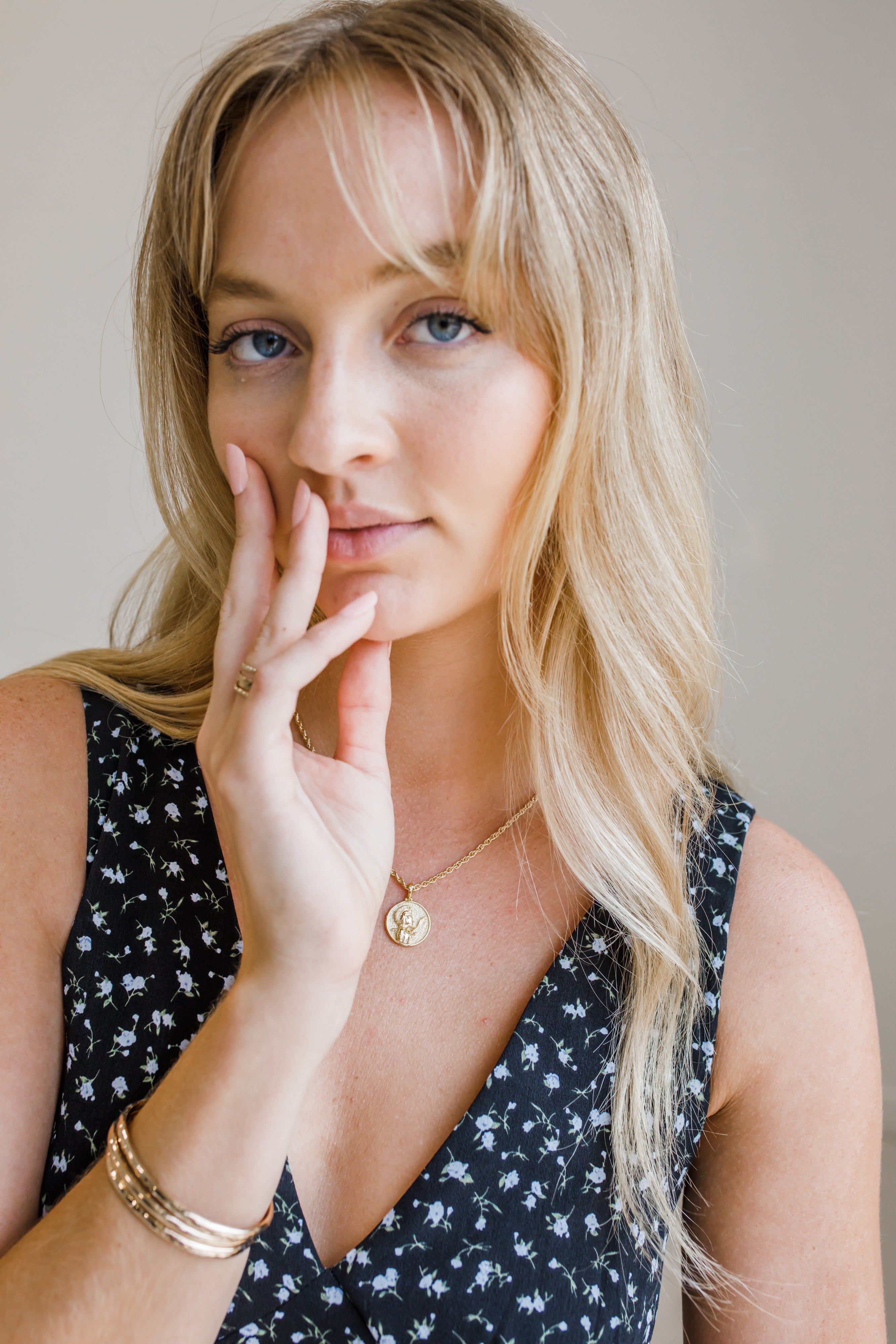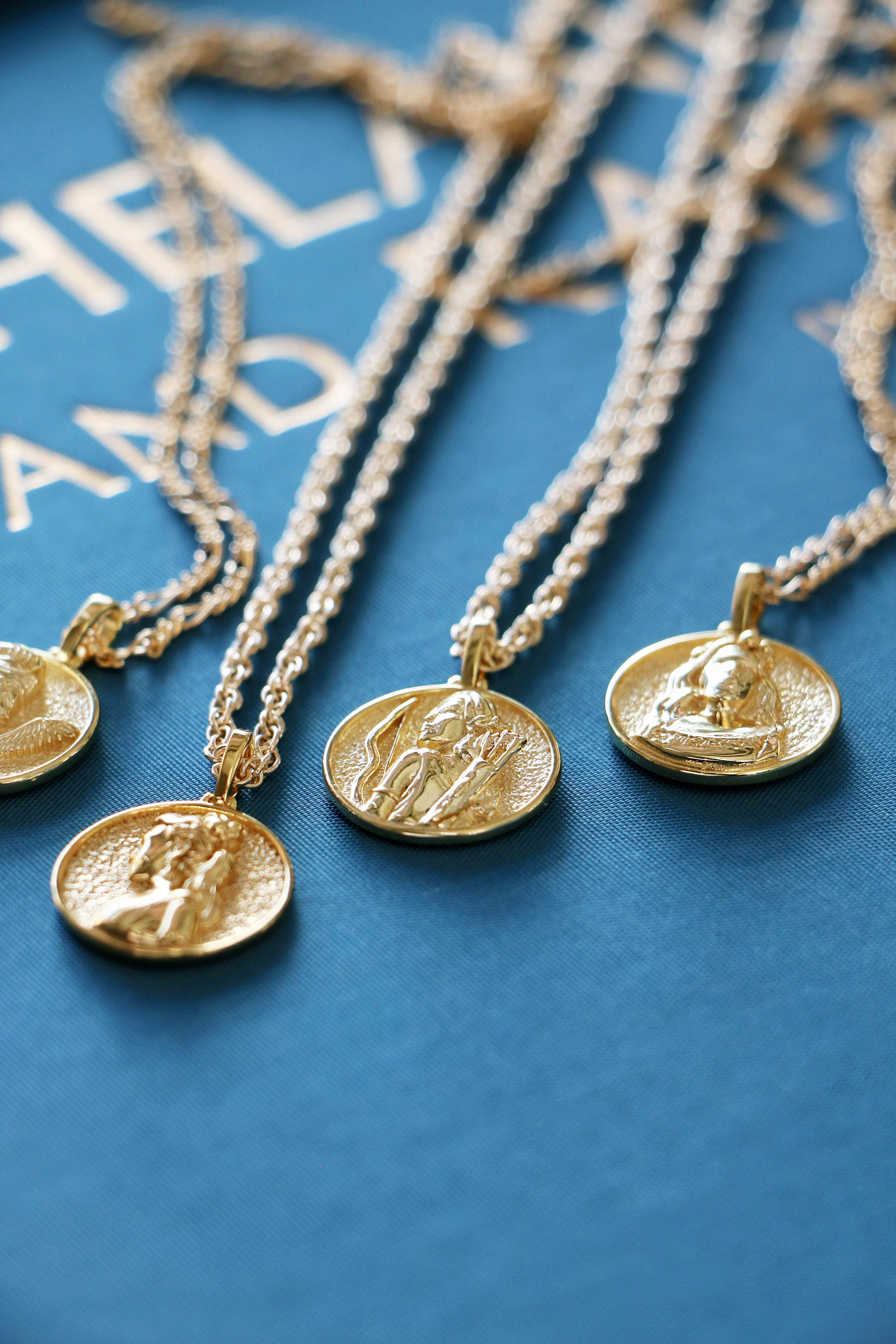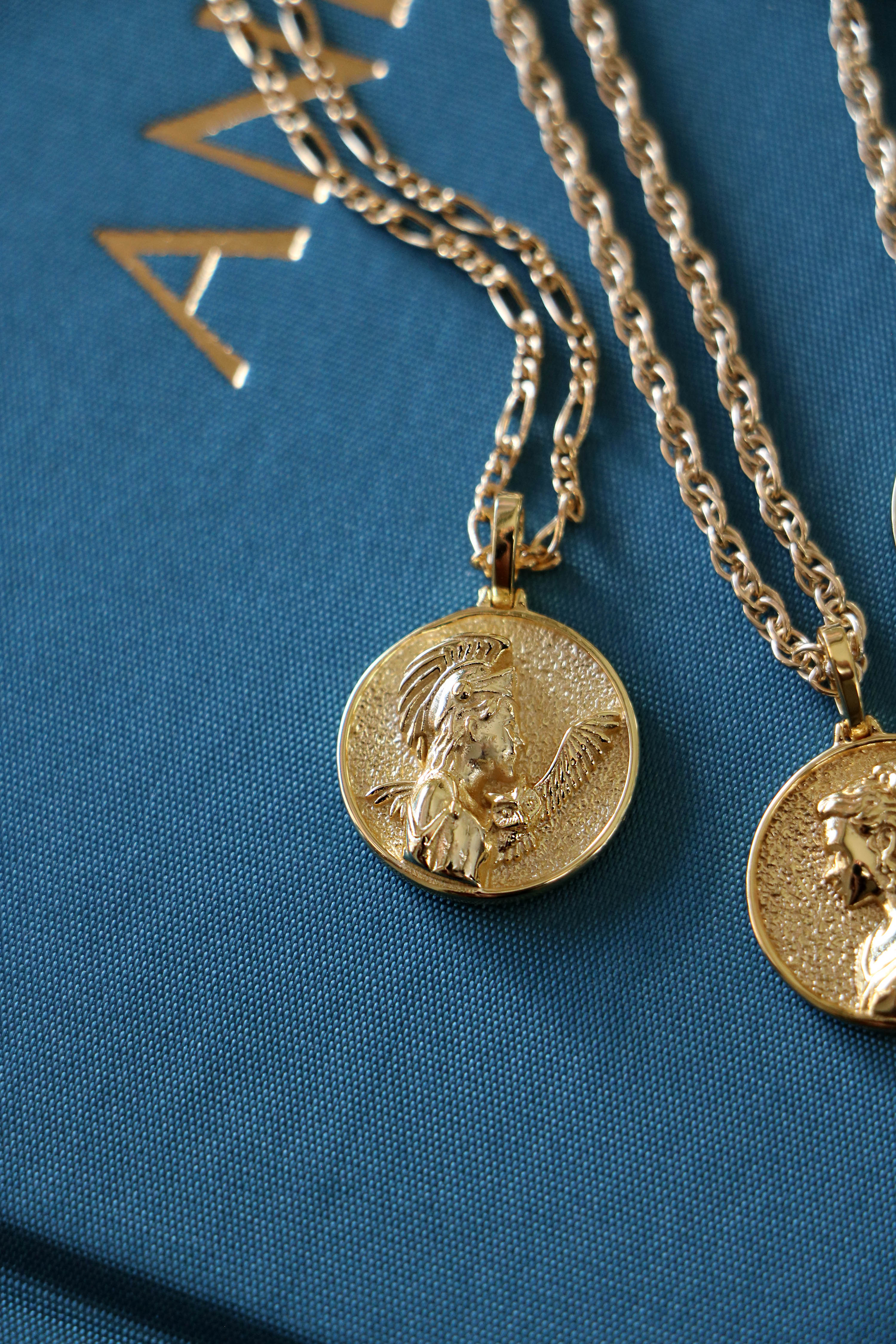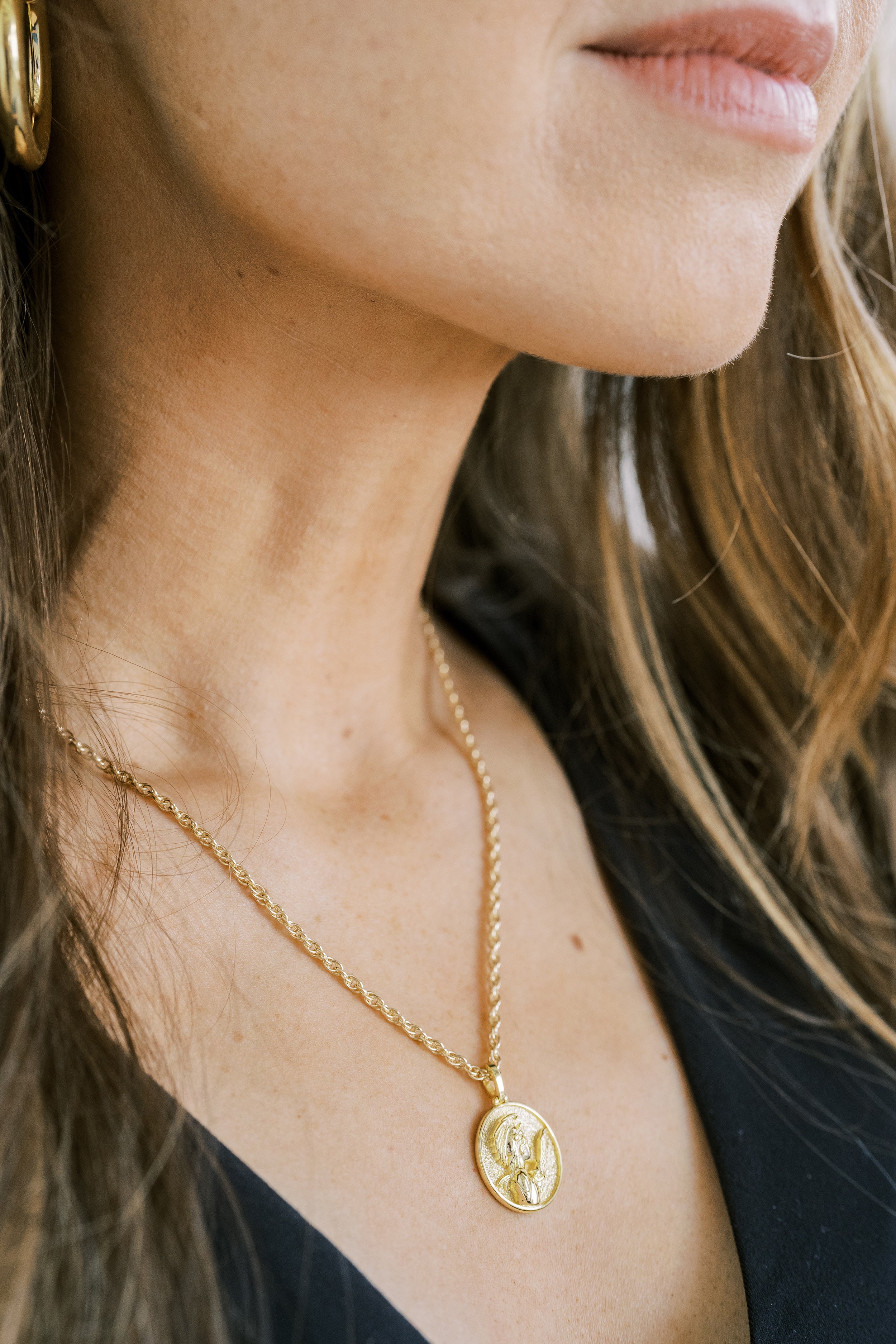 A beautiful hand-drawn goddess of your choice is cast on a sterling silver or gold vermeil pendant. The pendant has a beautiful vintage coin feel and is paired with your choice of double rope or Figaro chain. This necklace is perfect for layering with your favorite stack.