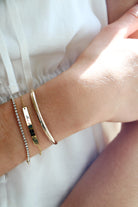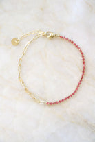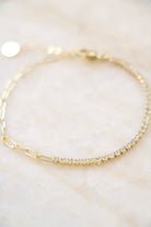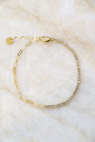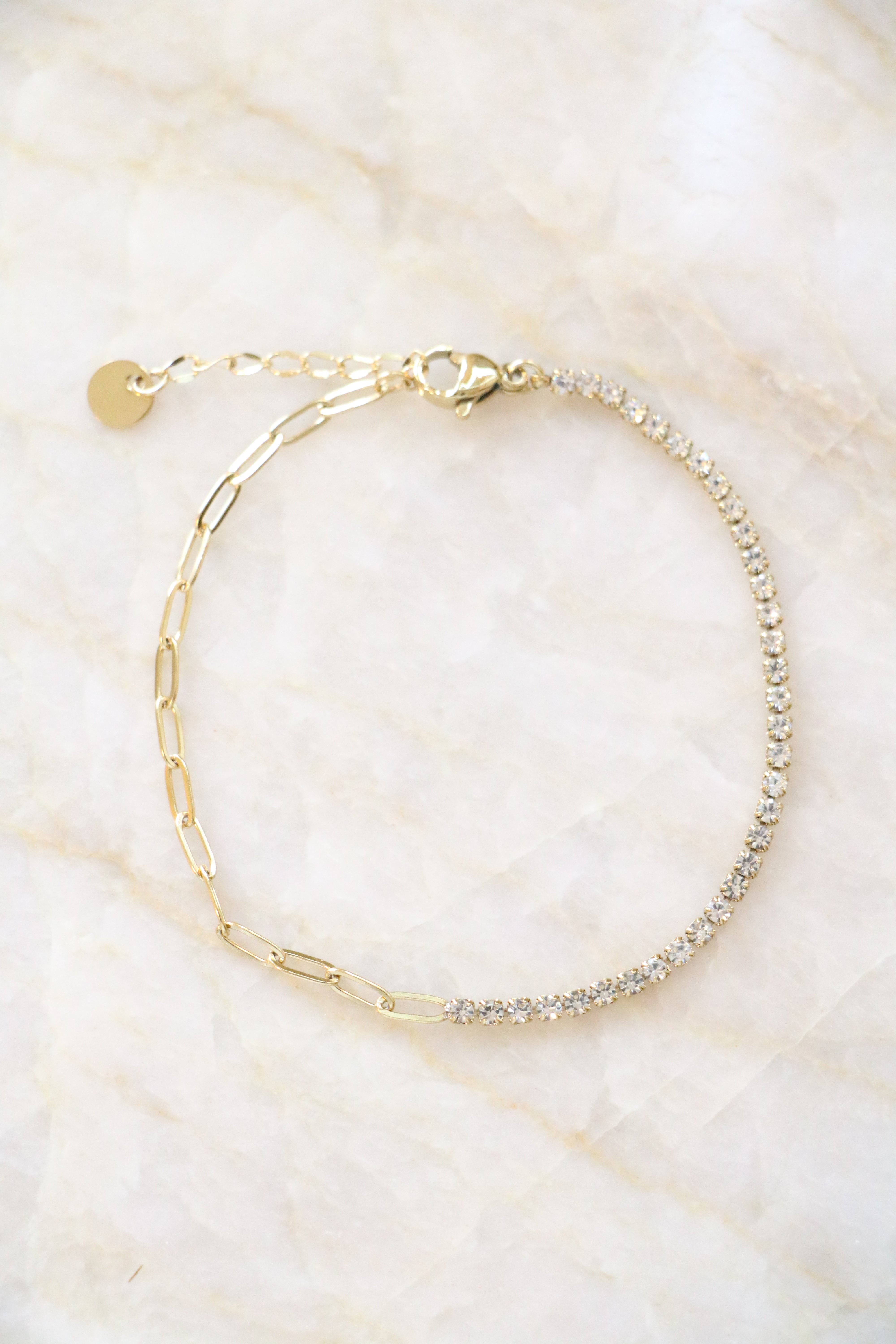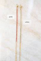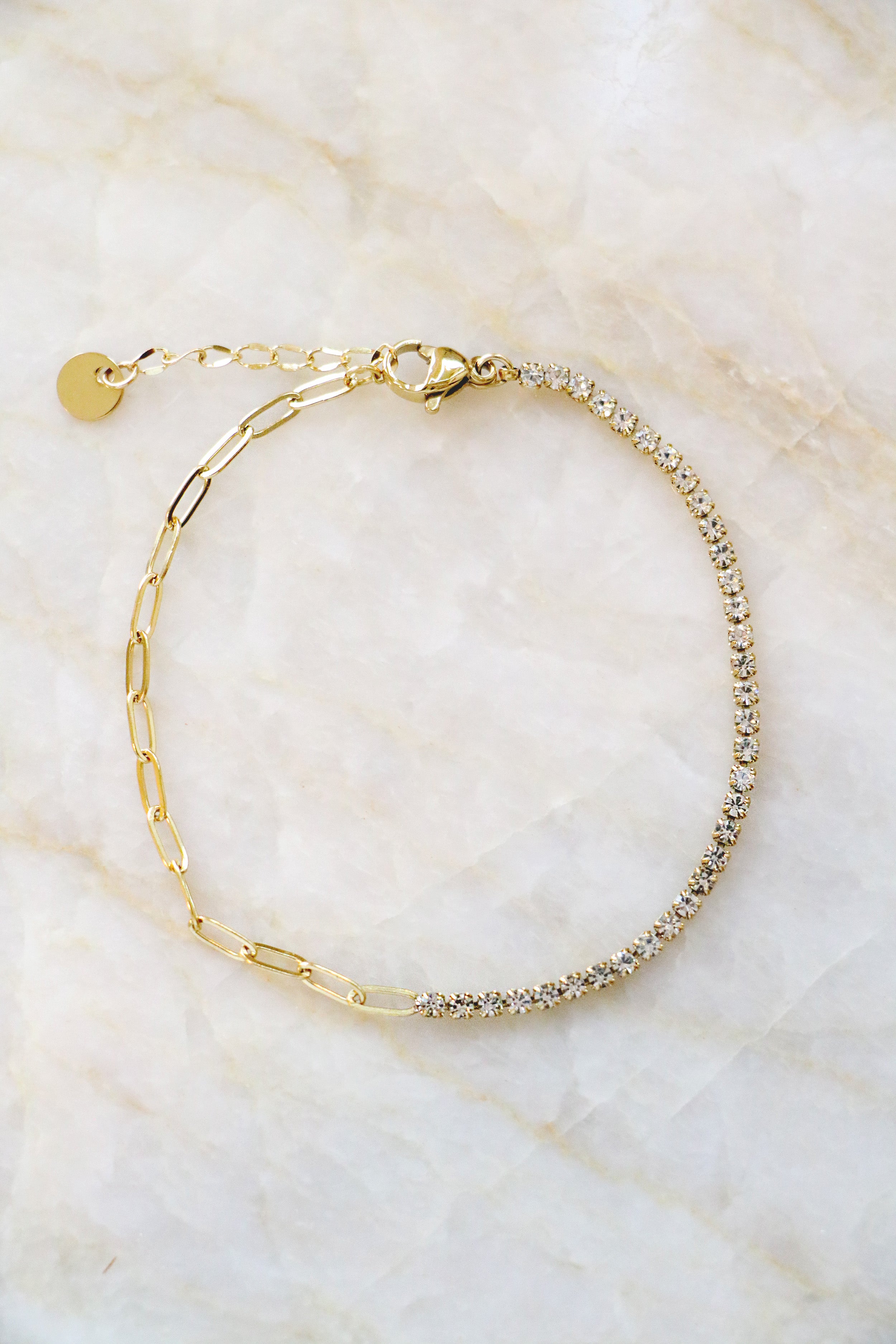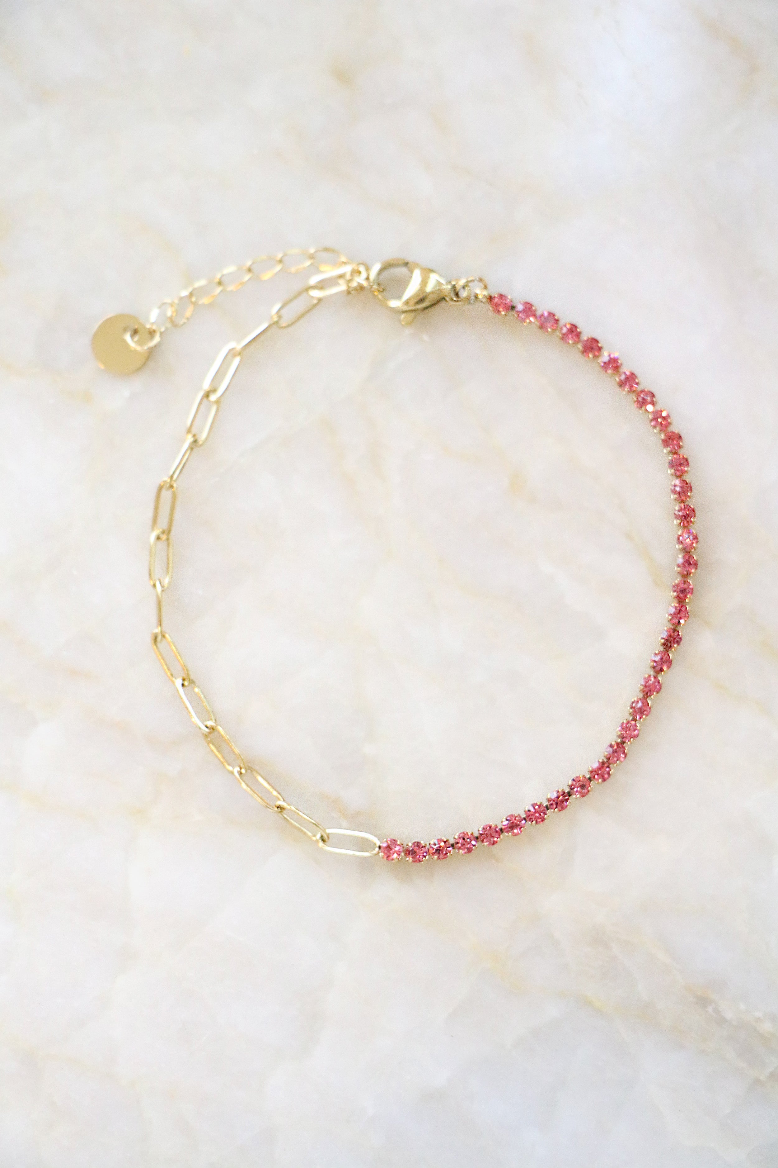 A single bracelet that can be worn two ways. Half the length is a classic cz tennis design while the other half is a modern paperclip chain. Available in two color ways: classic white and deep pink.