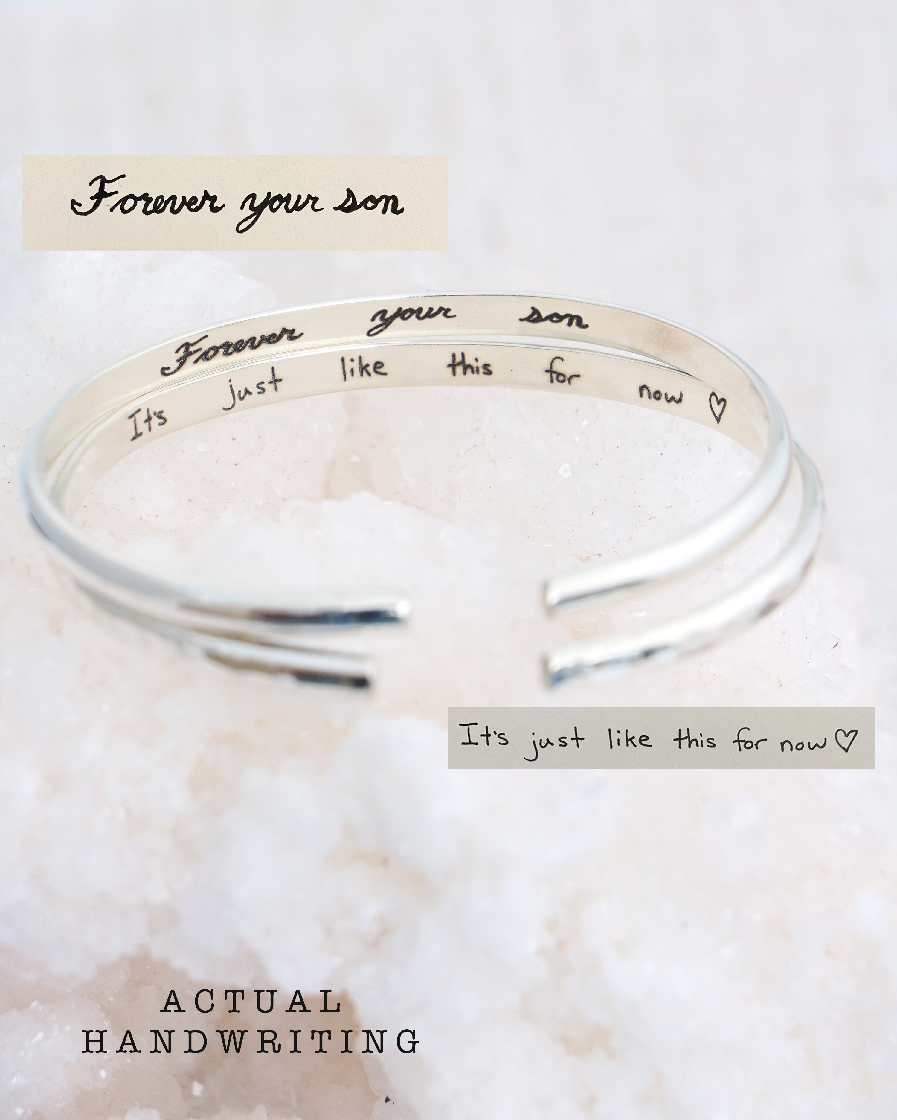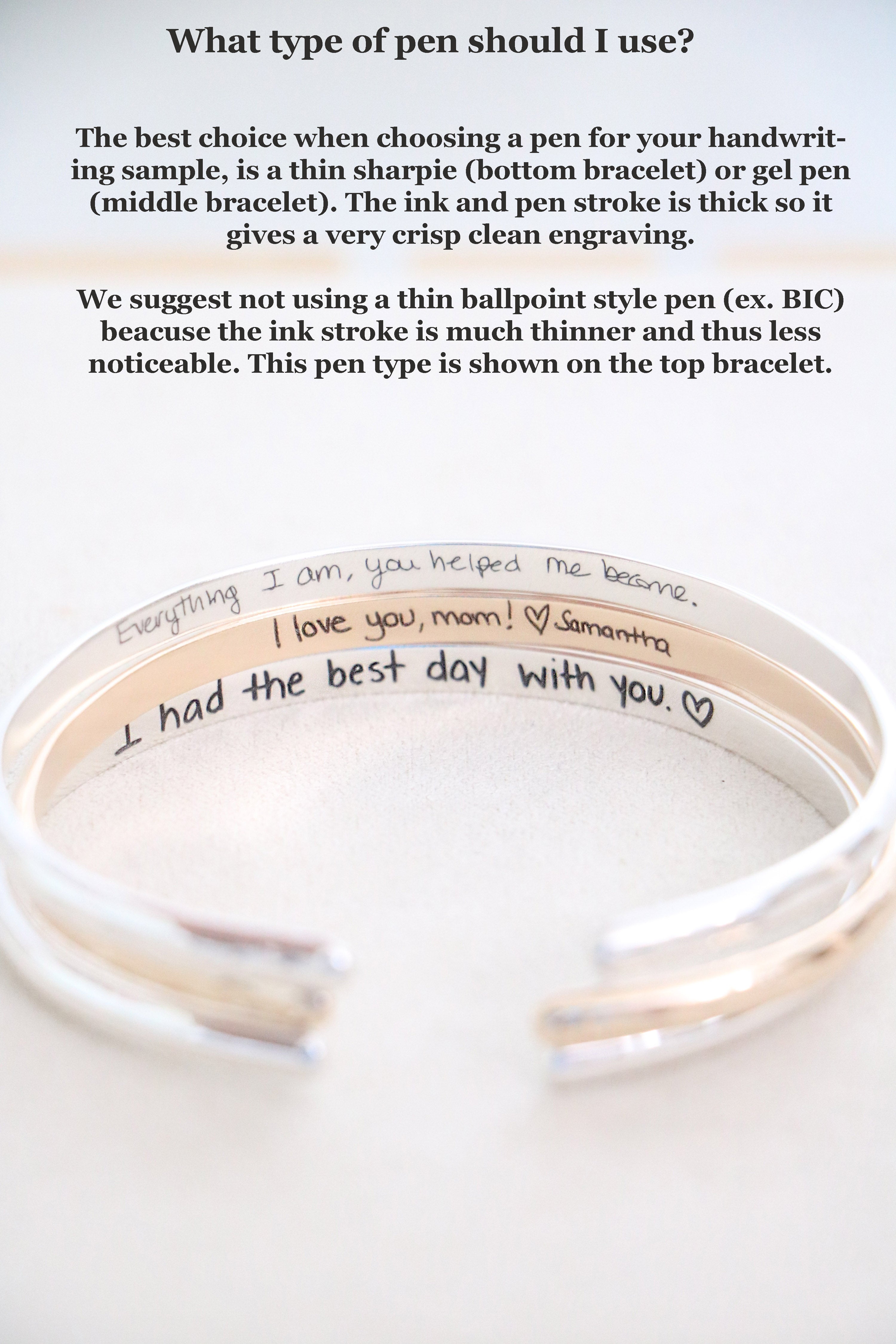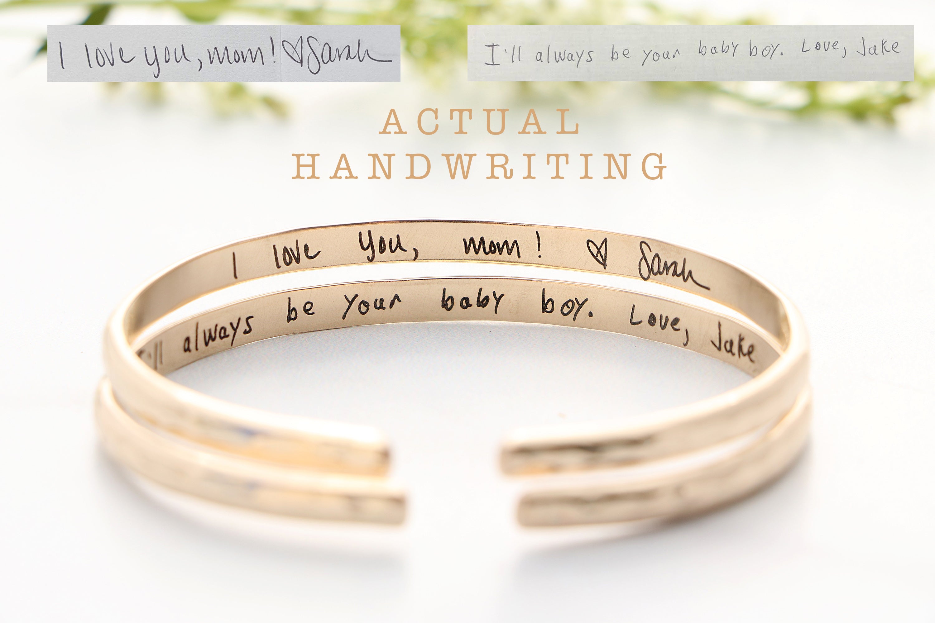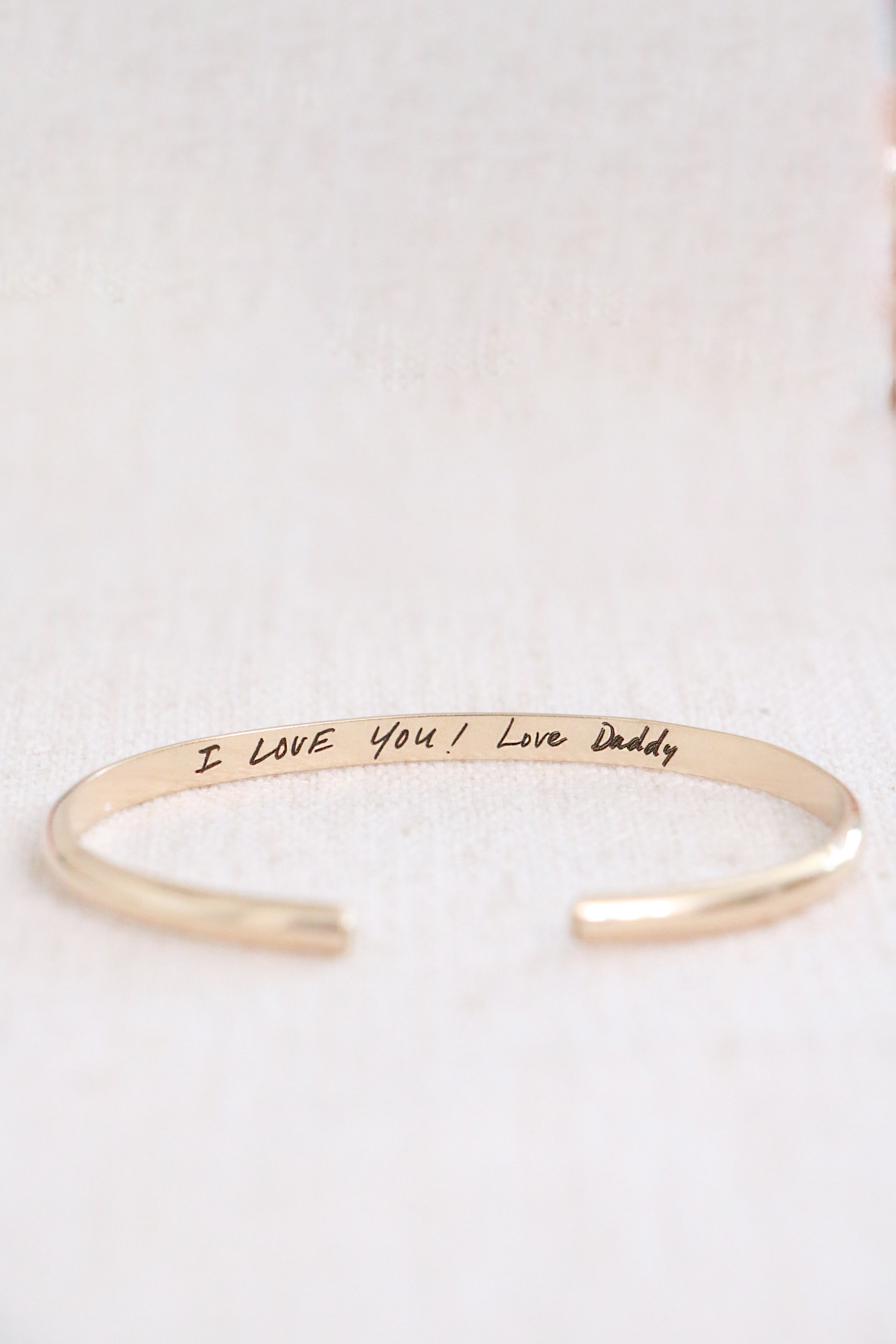 This cuff bracelet is the newest addition to our bracelet collection! The outside of the cuff is a rounded shape, while the inside can be personalized in so many ways. Choose your favorite phrase, names, special date to be engraved in a standard cursive or print font, or choose your actual handwriting to be engraved. Bracelet is made from solid sterling silver or 14K yellow gold filled.
