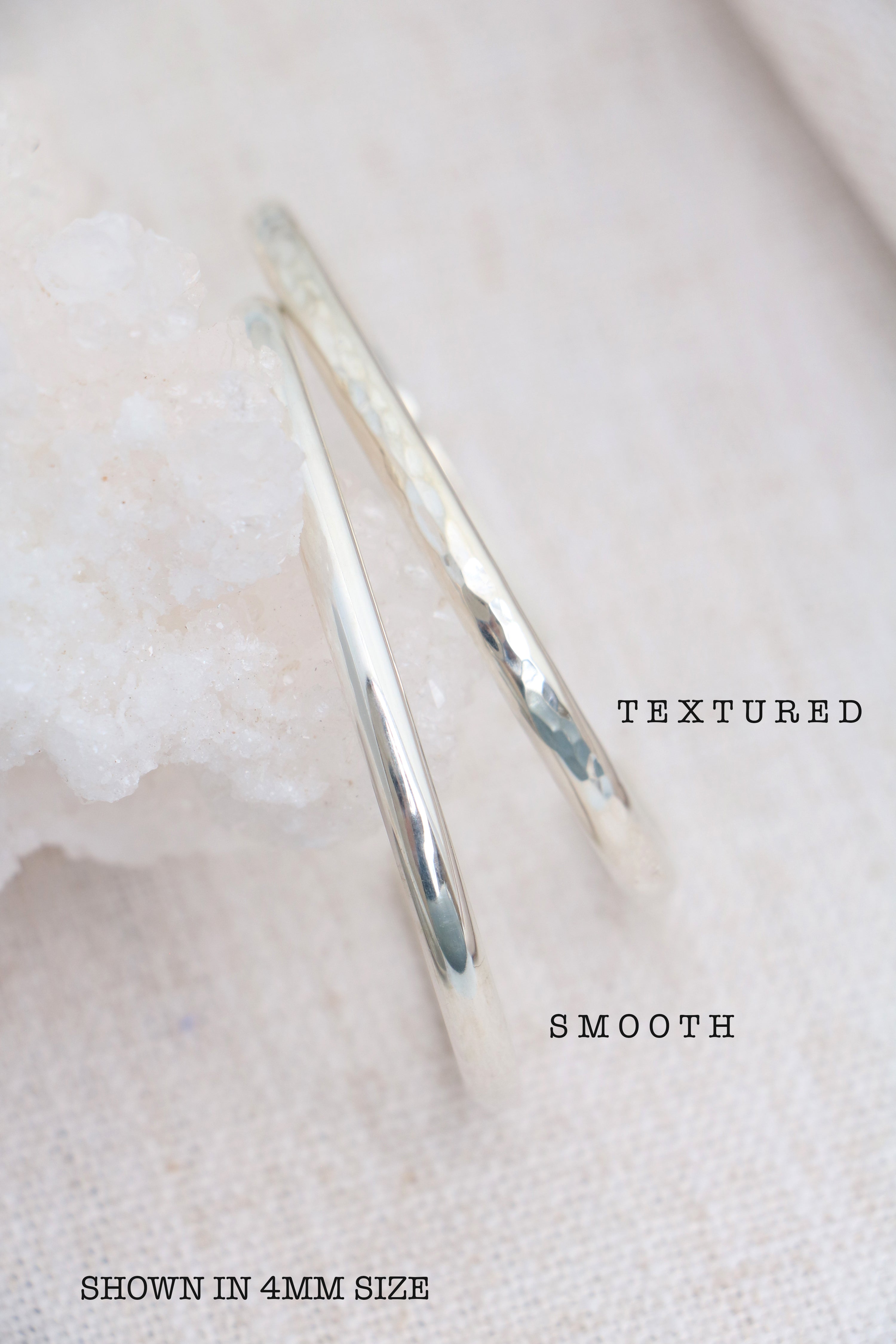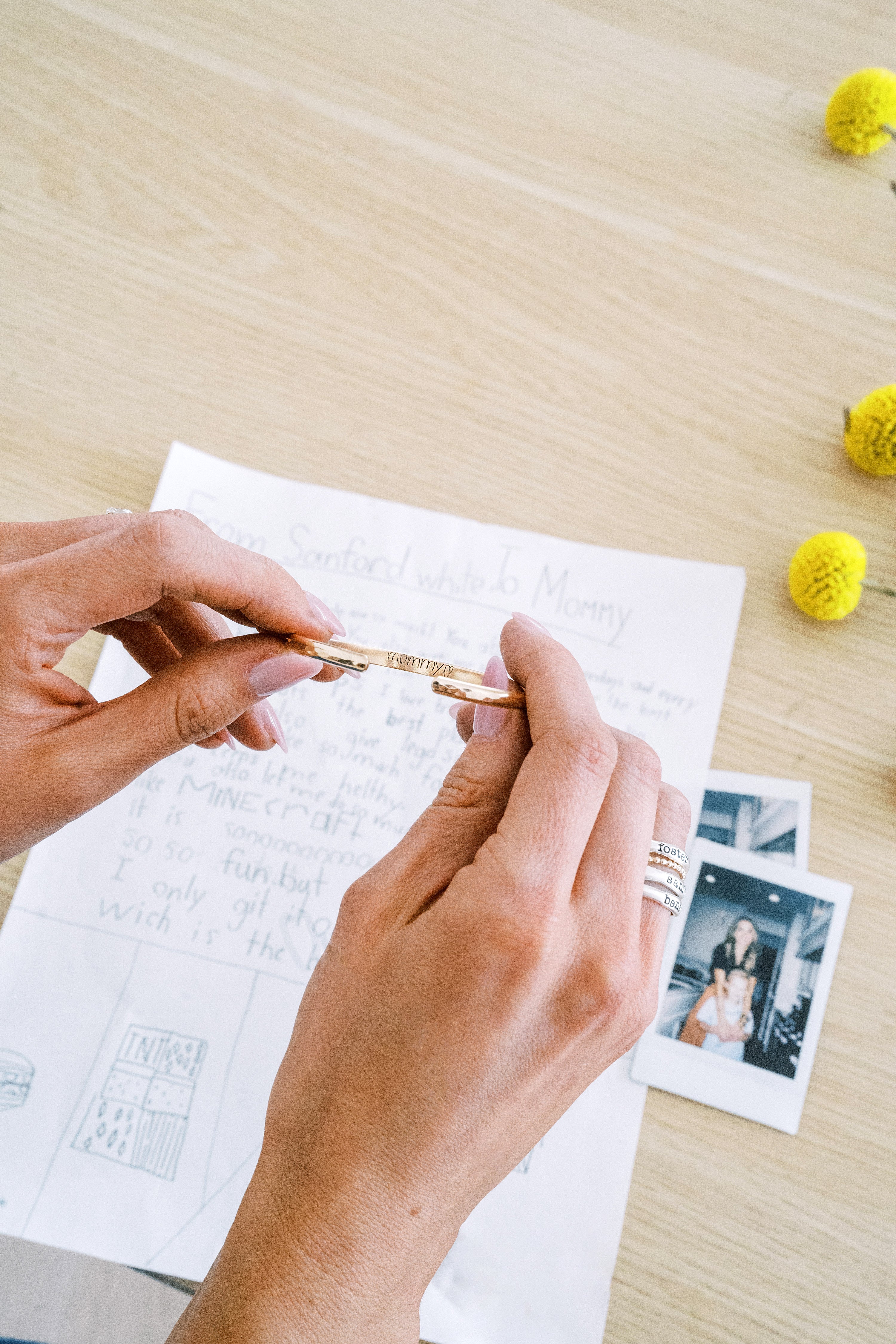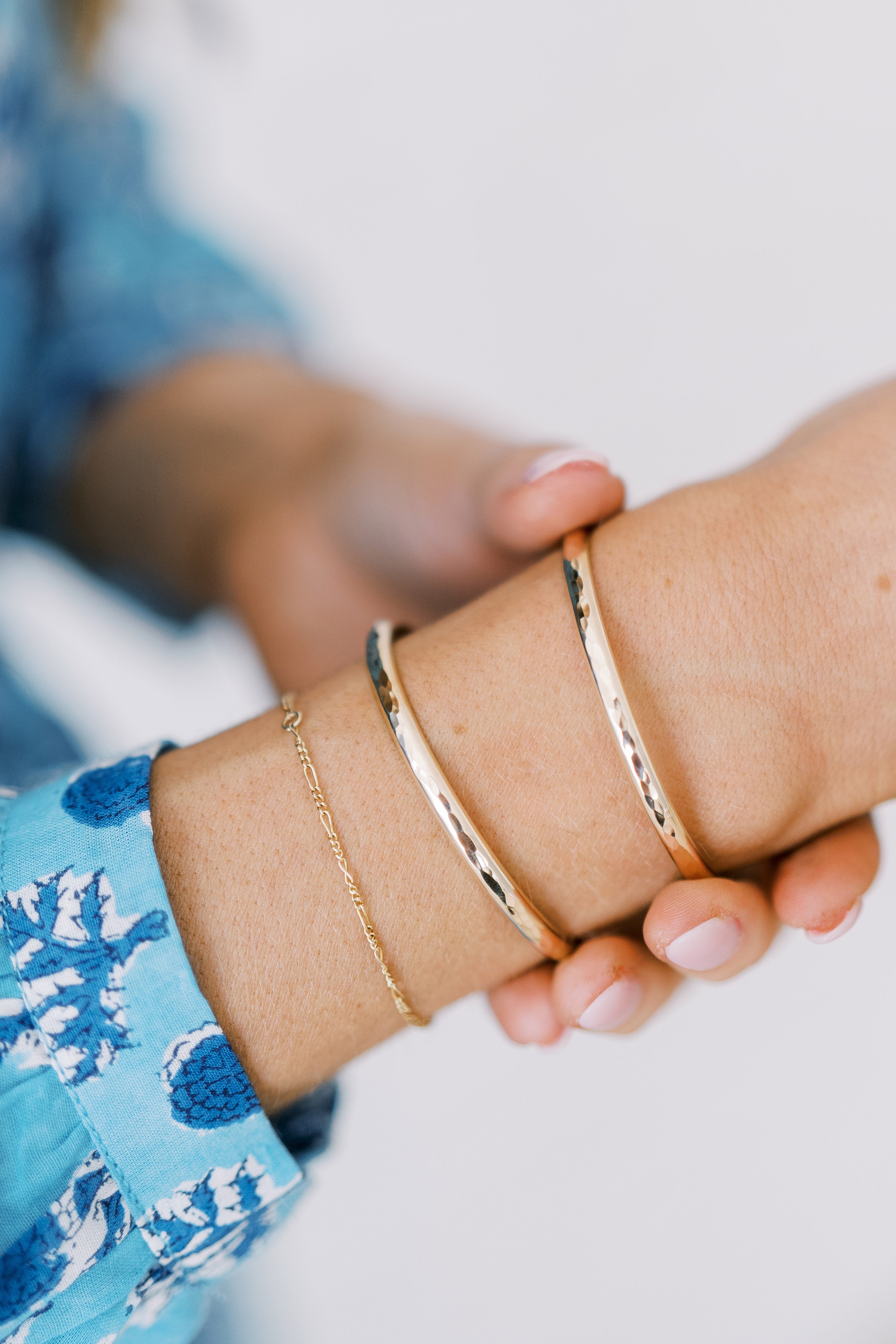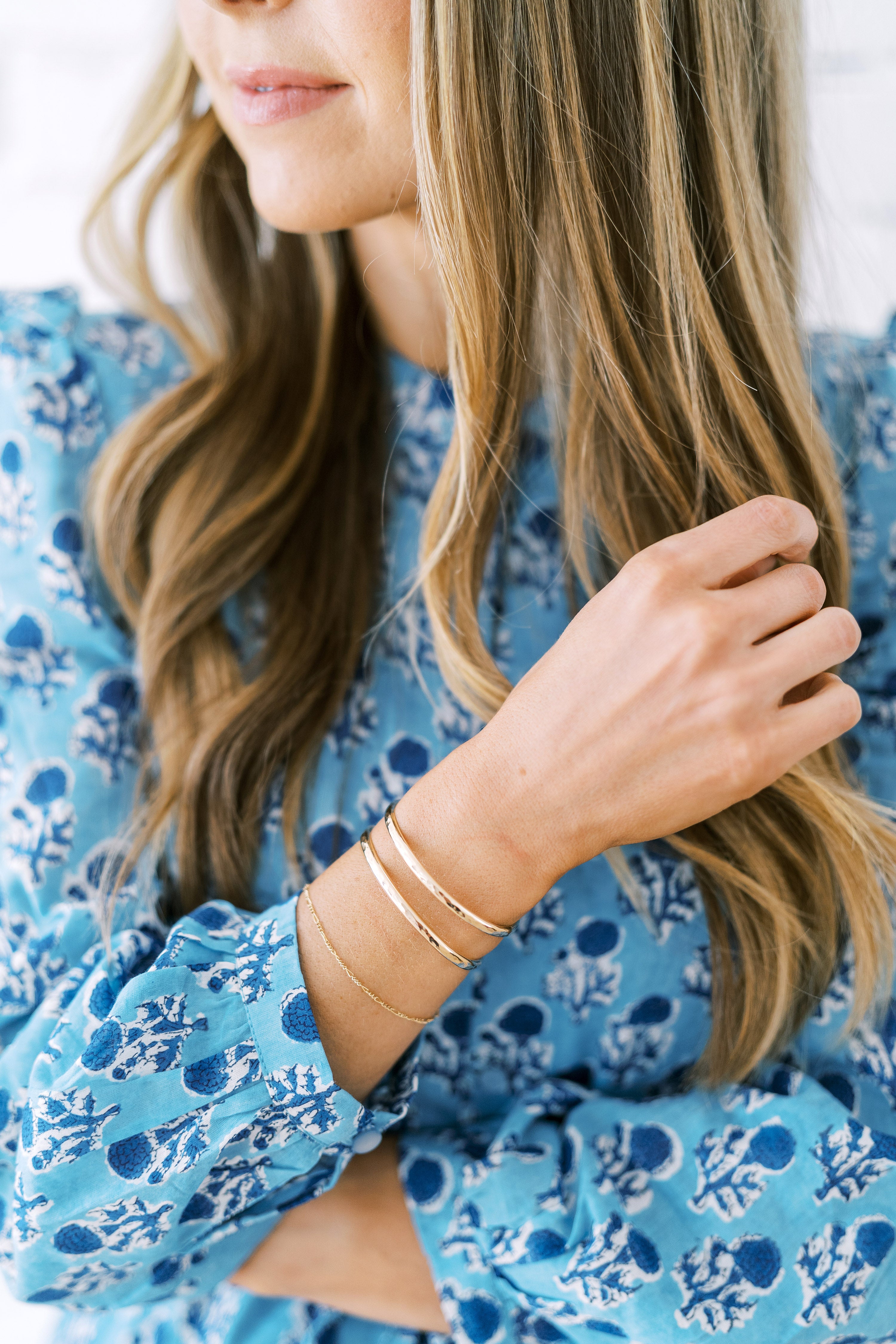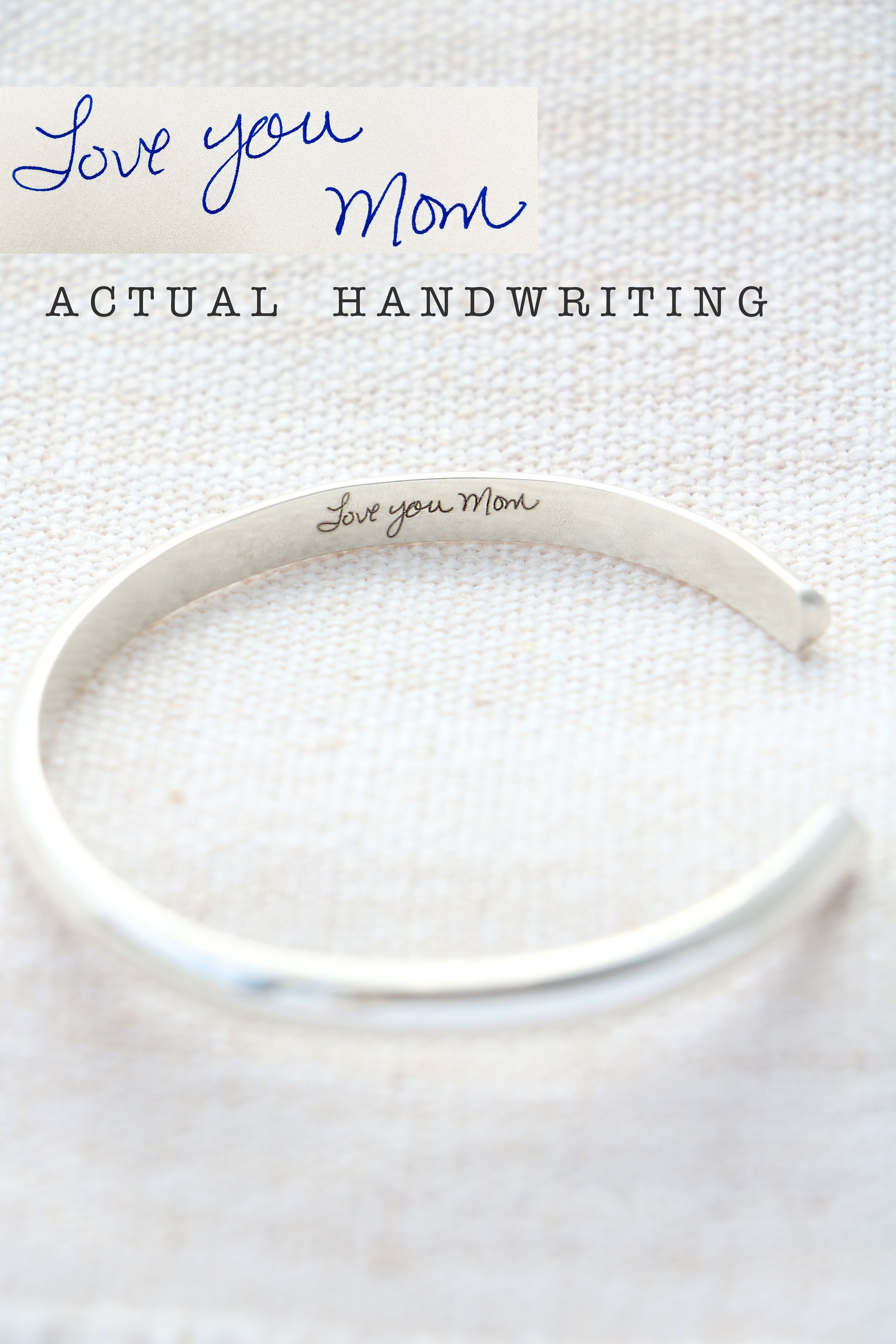 This cuff bracelet is the newest addition to our bracelet collection! The outside of the cuff is a rounded shape, while the inside can be personalized in so many ways. Choose your favorite phrase, names, special date to be engraved in a standard cursive or print font, or choose your actual handwriting to be engraved. Bracelet is made from solid sterling silver or 14K yellow gold filled.