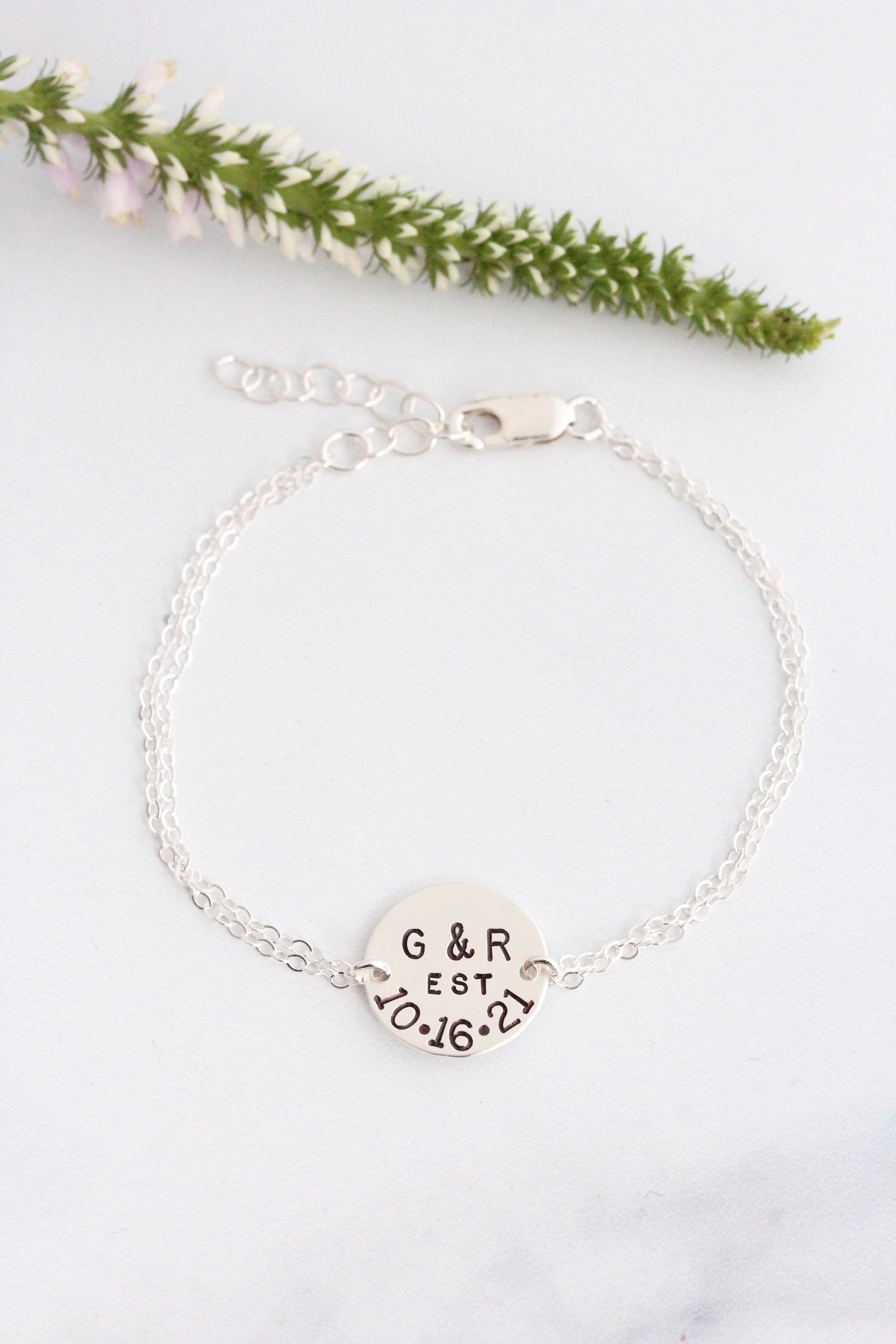 This bracelet features a 5/8" solid sterling silver disc that is hand stamped with the initials of you and your loved one and your special date. This bracelet comes with a double stranded sterling silver cable chain and a 1/2" adjustable length.