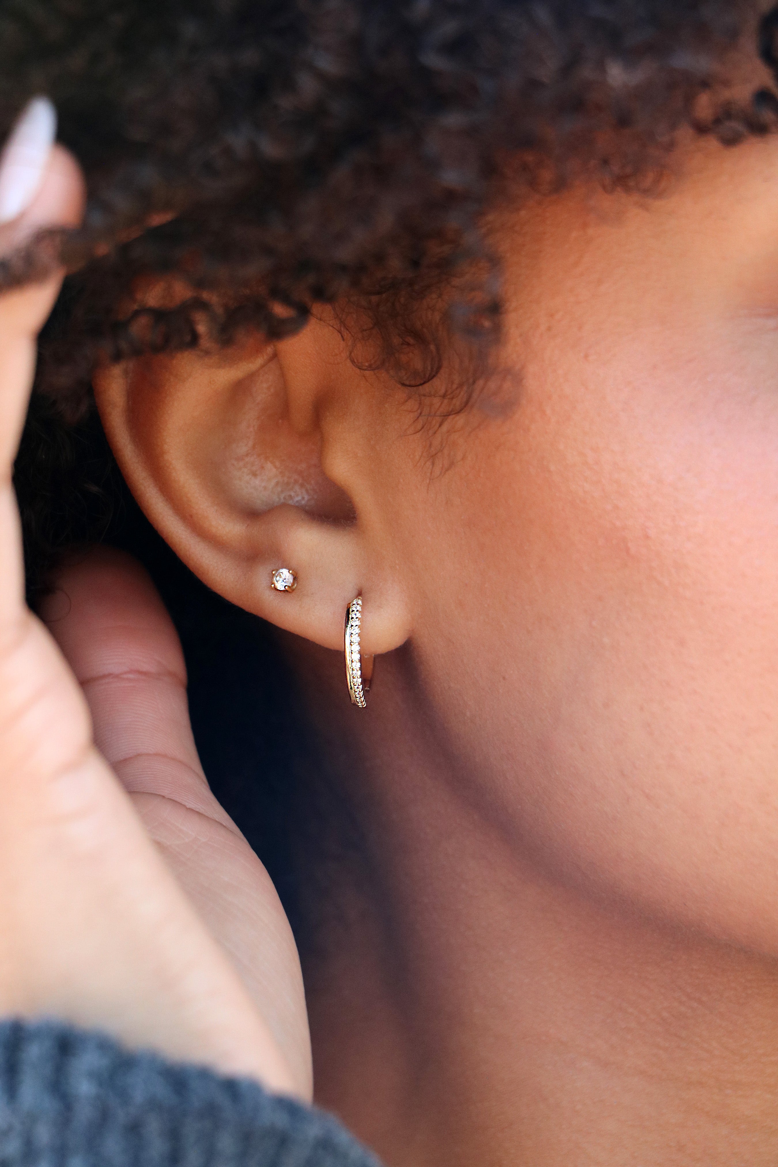A traditional style hoop but elevated in stye, with a double-wide loop. One loop has a mirror shiny finish, the other loop is studded with white cz stones. These are the perfect hoops for a more elegant affair but also look great paired with jeans.