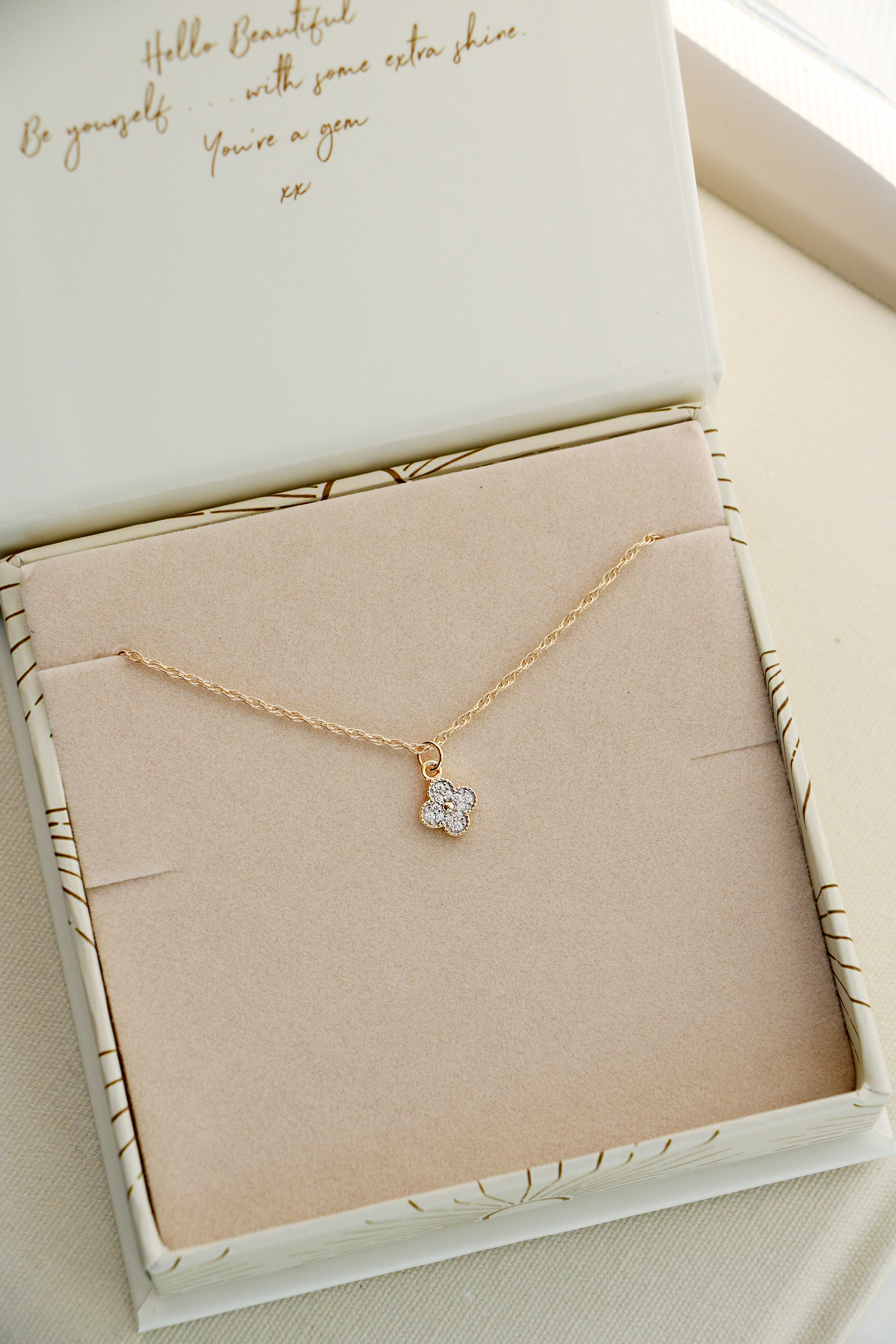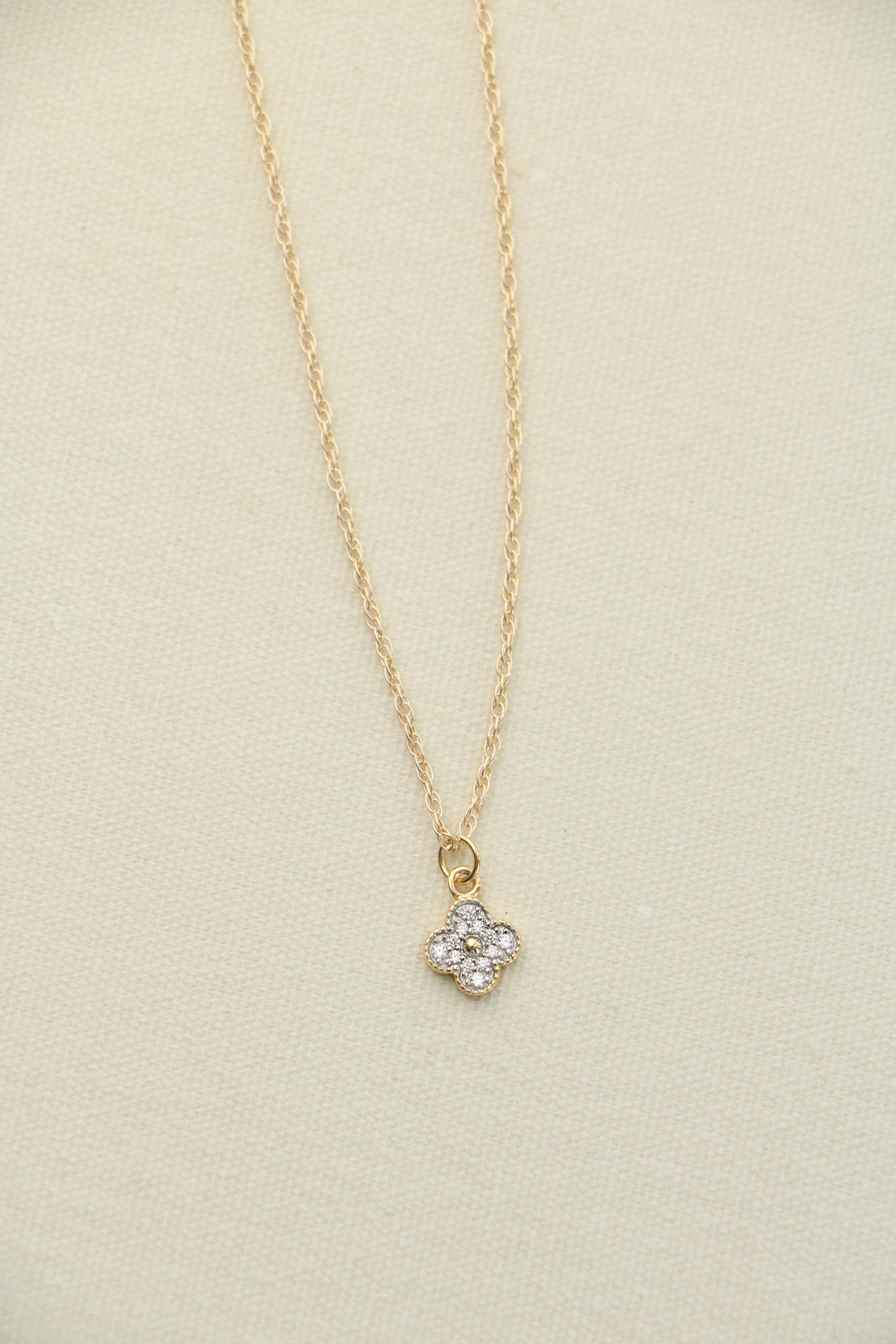 A tiny clover charm is studded with several white cubic zirconia. The dainty size makes it perfect for layering with your other favorite chains.