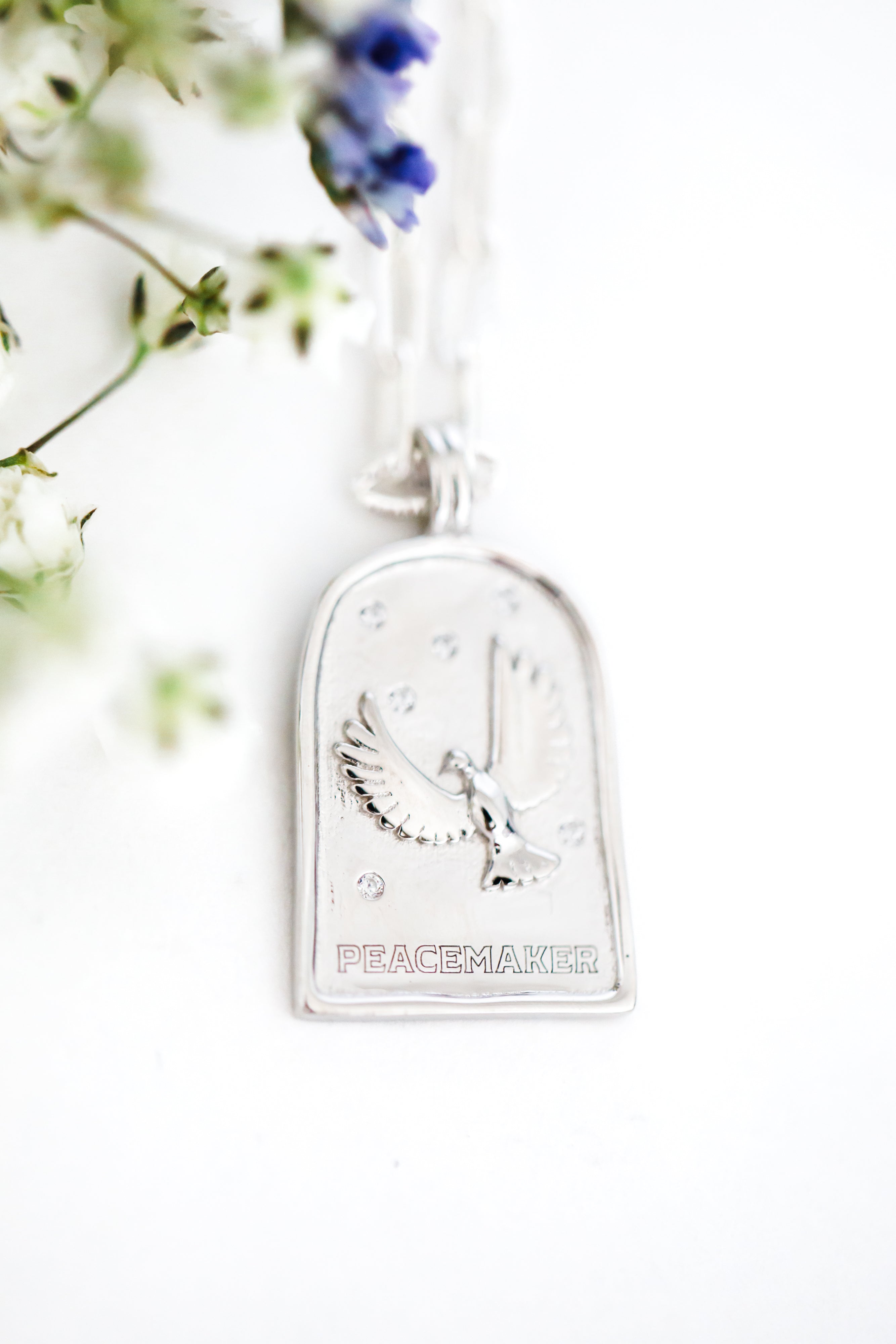 Type nine is illustrated by a dove with outstretched wings detailed with hand set white cz stones. The arched pendant measures approximately 18mm and is solid sterling silver or 14K gold vermeil. Hung from your choice of sterling silver or gold filled chain.