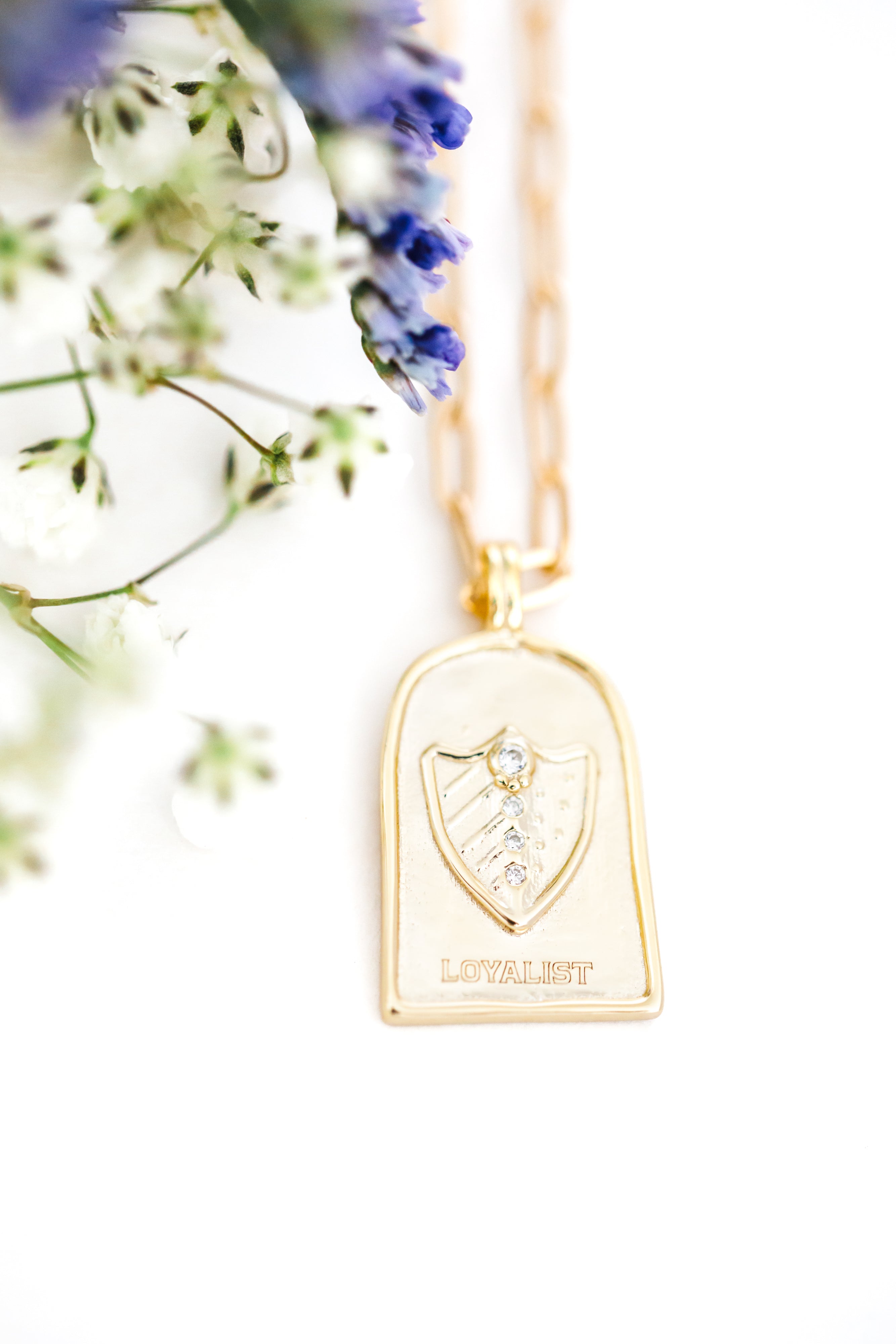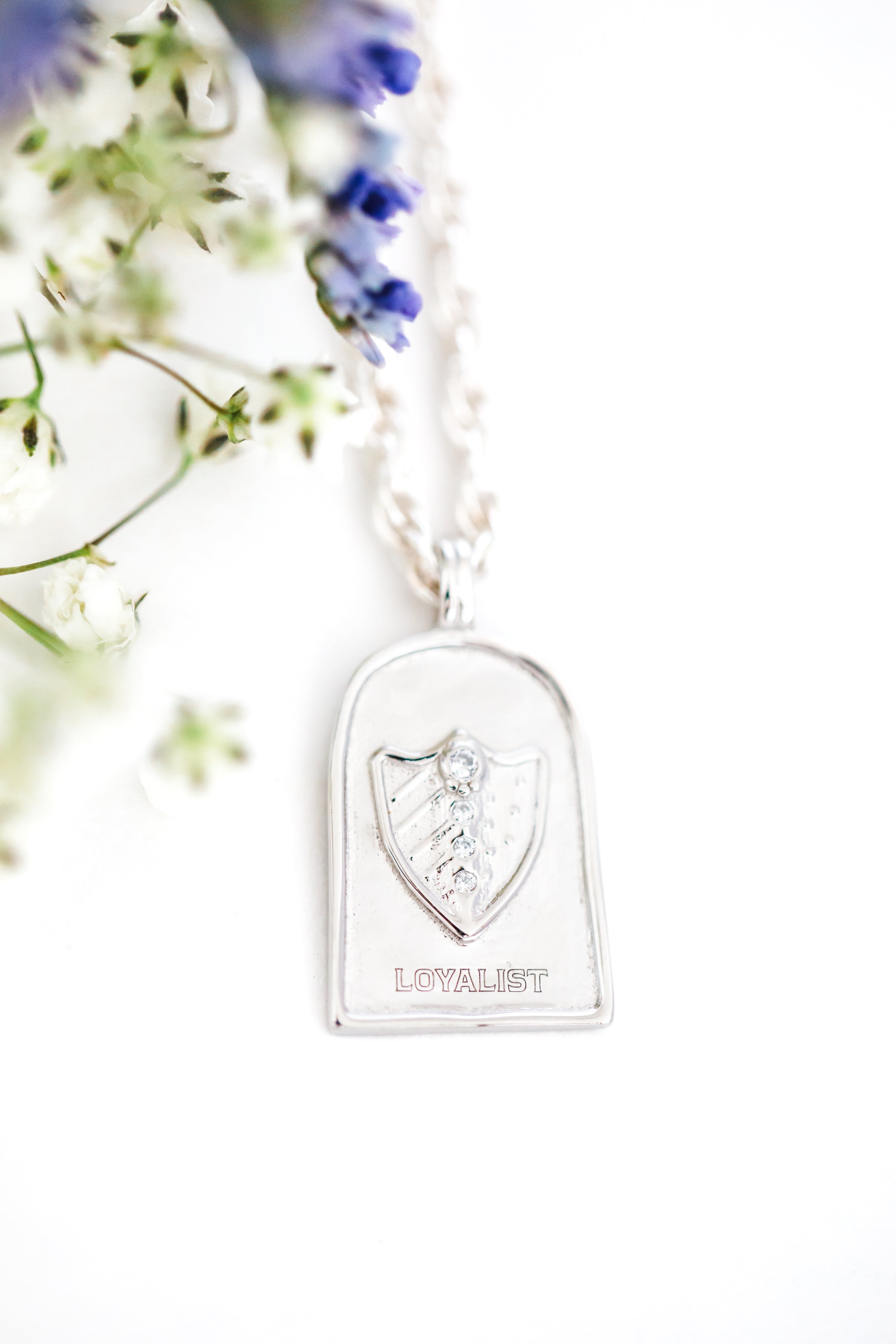 Type six is illustrated by a trusted shield, hand set with white cz stones. The arched pendant measures approximately 18mm and is solid sterling silver or 14K gold vermeil. Hung from your choice of sterling silver or gold filled chain.