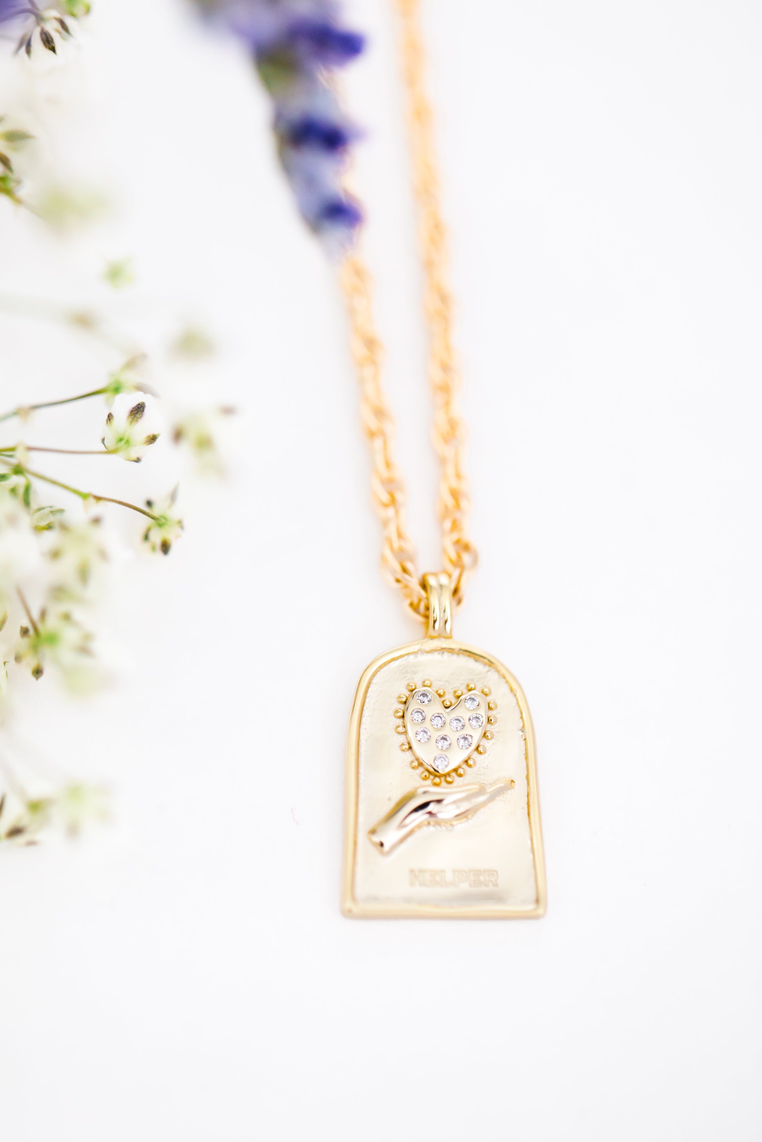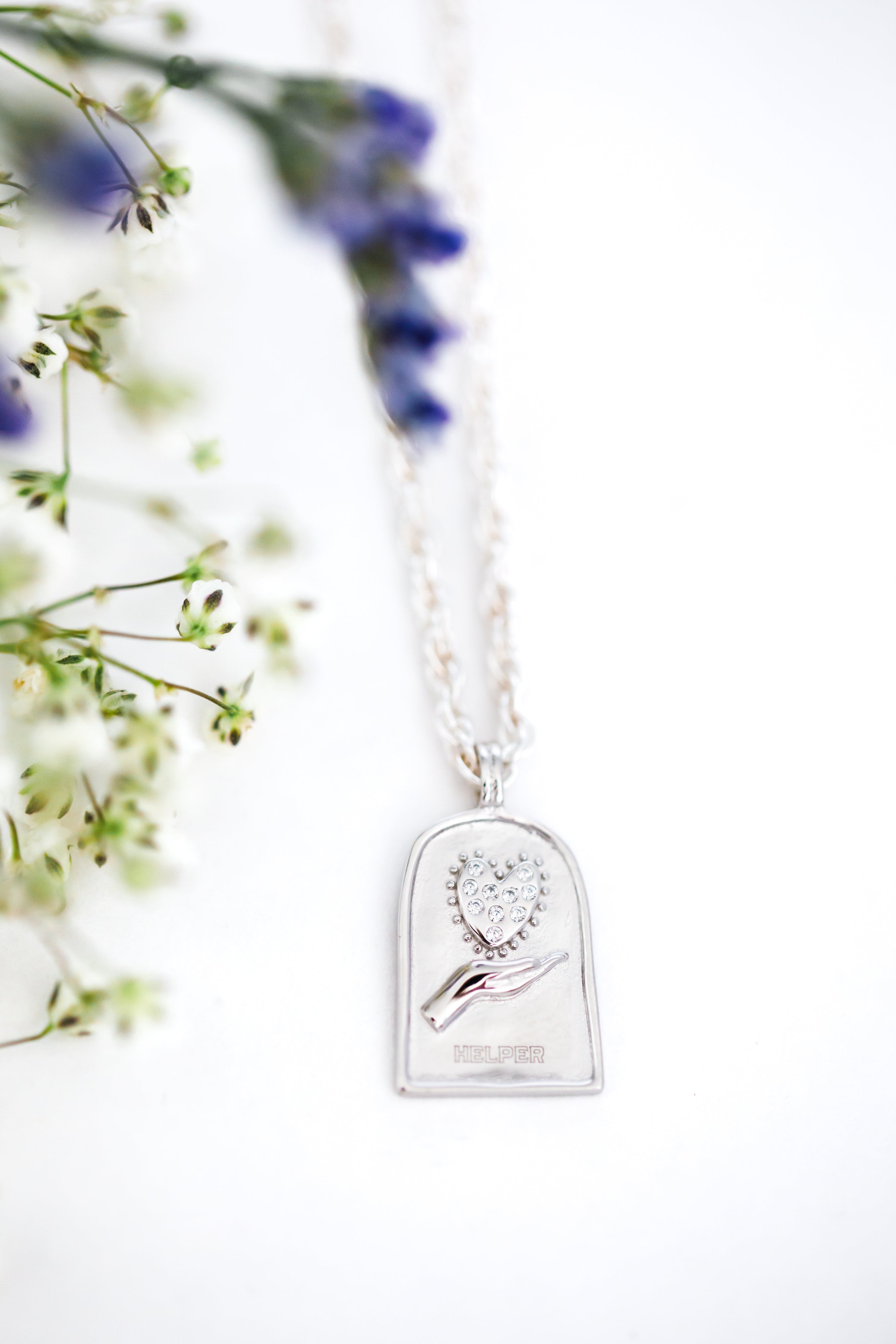 Type two is illustrated by outstretched hands holding a heart. The heart is hand set with several white cz stones. The arched pendant measures approximately 18mm and is solid sterling silver or 14K gold vermeil. Hung from your choice of sterling silver or gold filled chain.