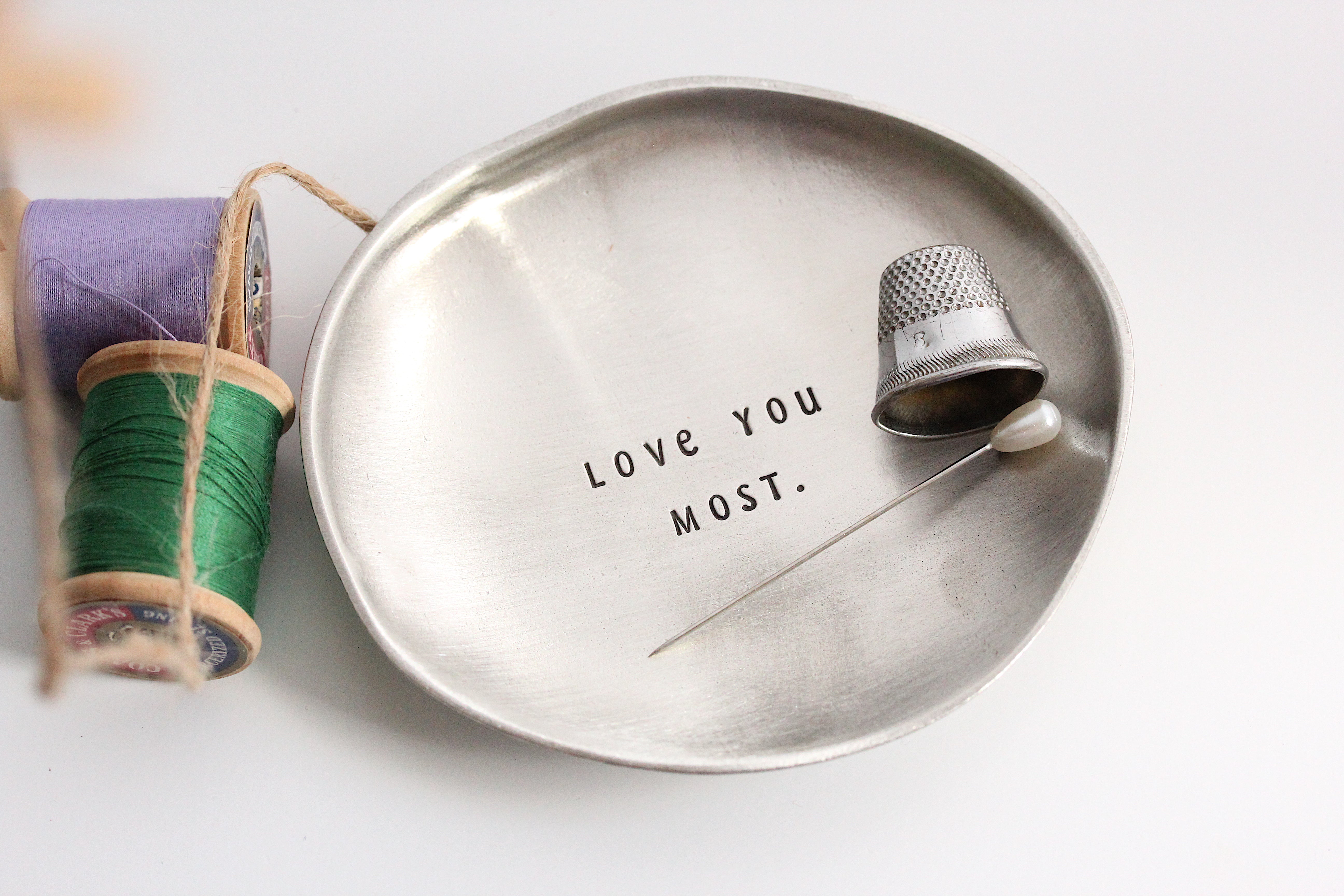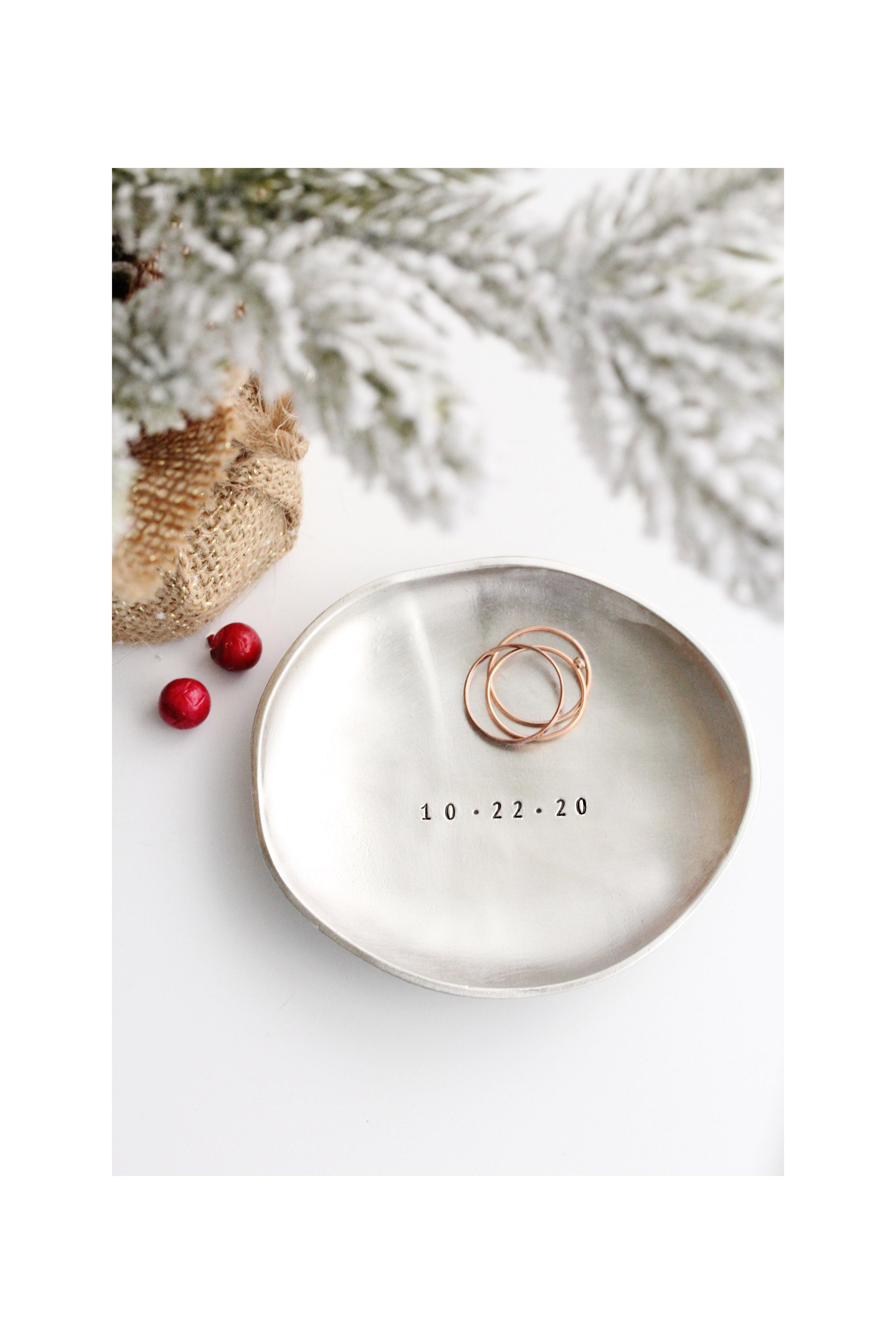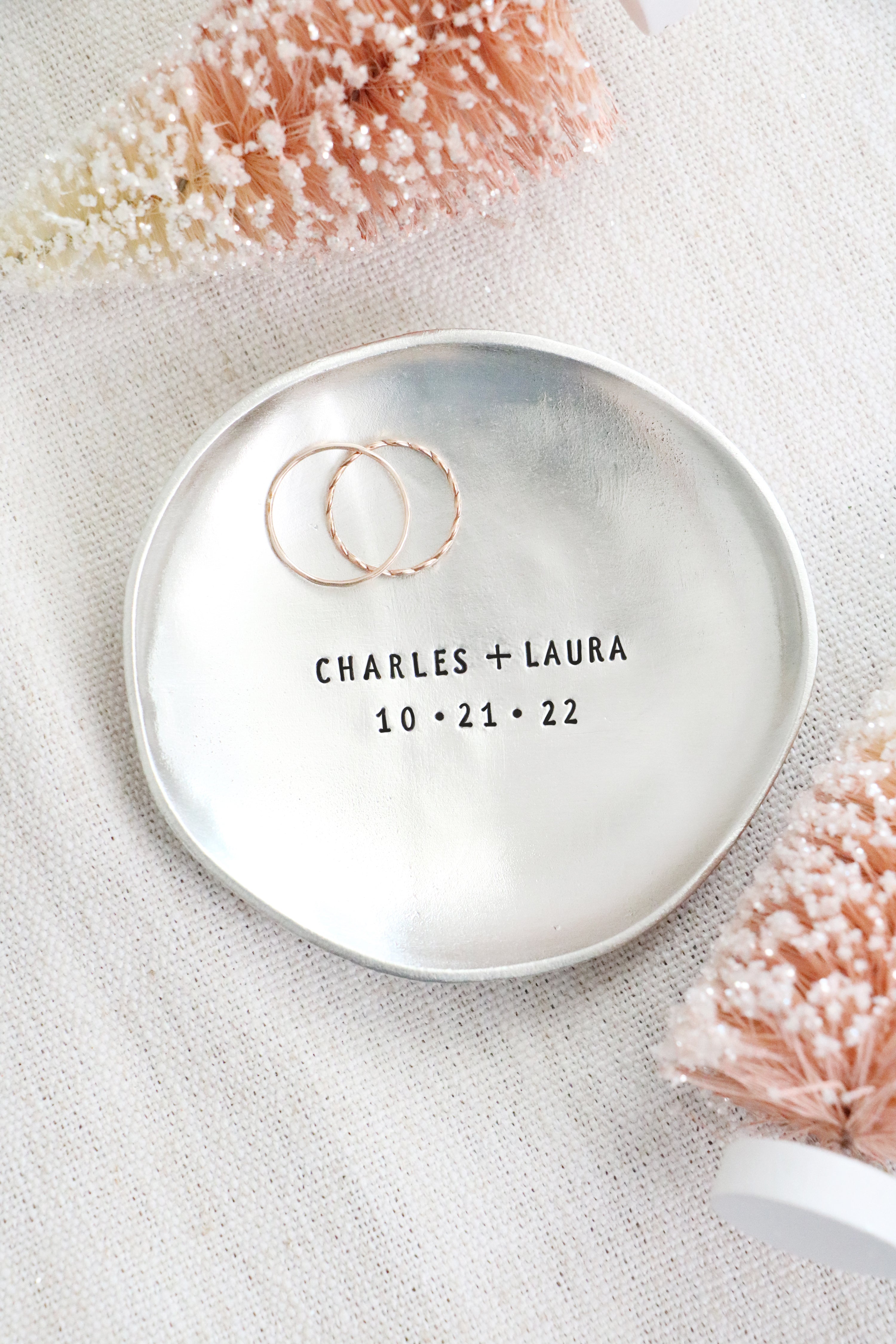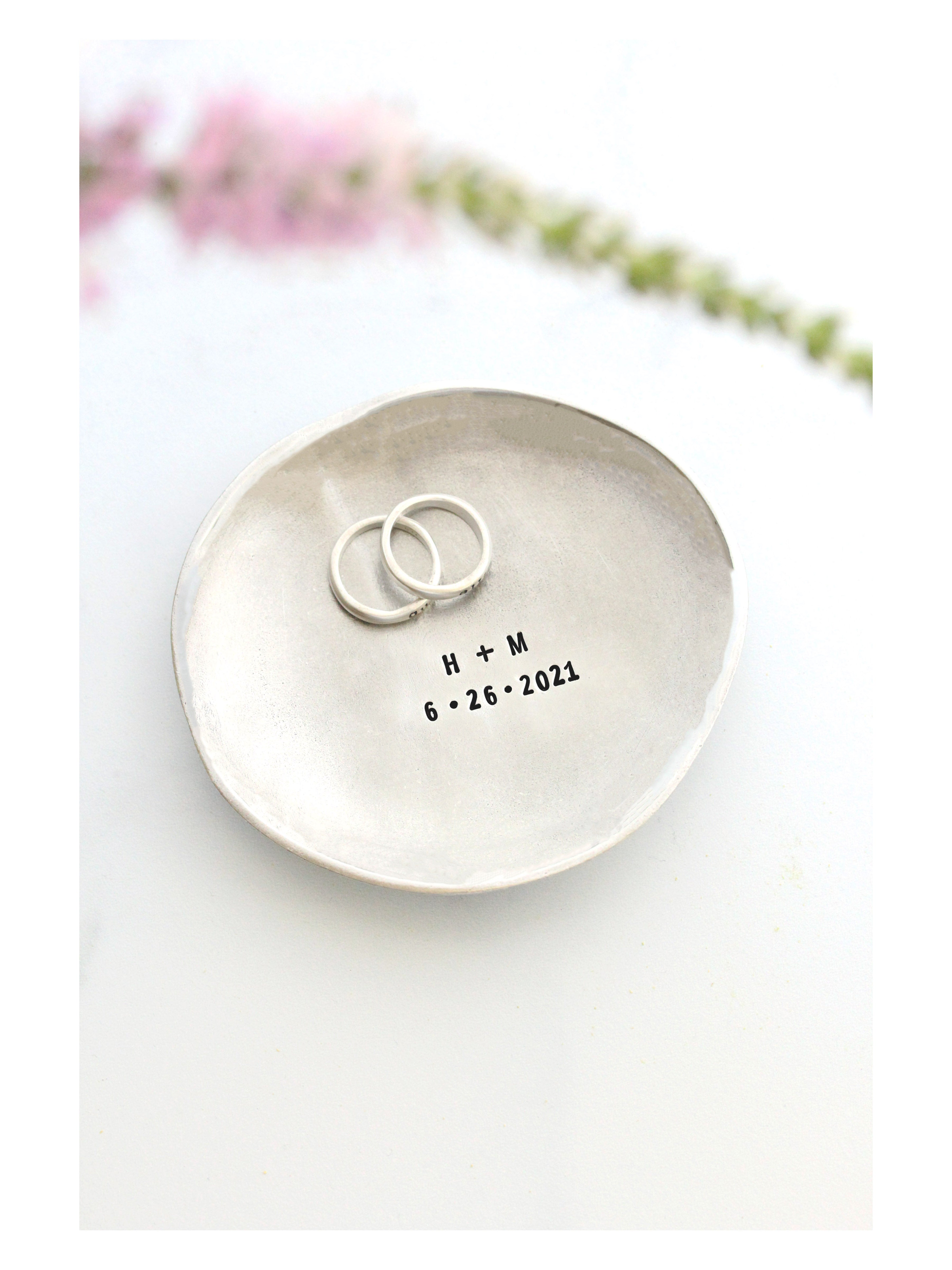 This beautiful dish is handsculpted and cast in fine silver pewter. Customize up to three lines of text with 10 characters per line. Pewter metal is a gorgeous bright white metal that will last forever and never tarnishes, so no maintenance is needed. Each dish is approximately 3.75 inches at its widest and has a very good weight.