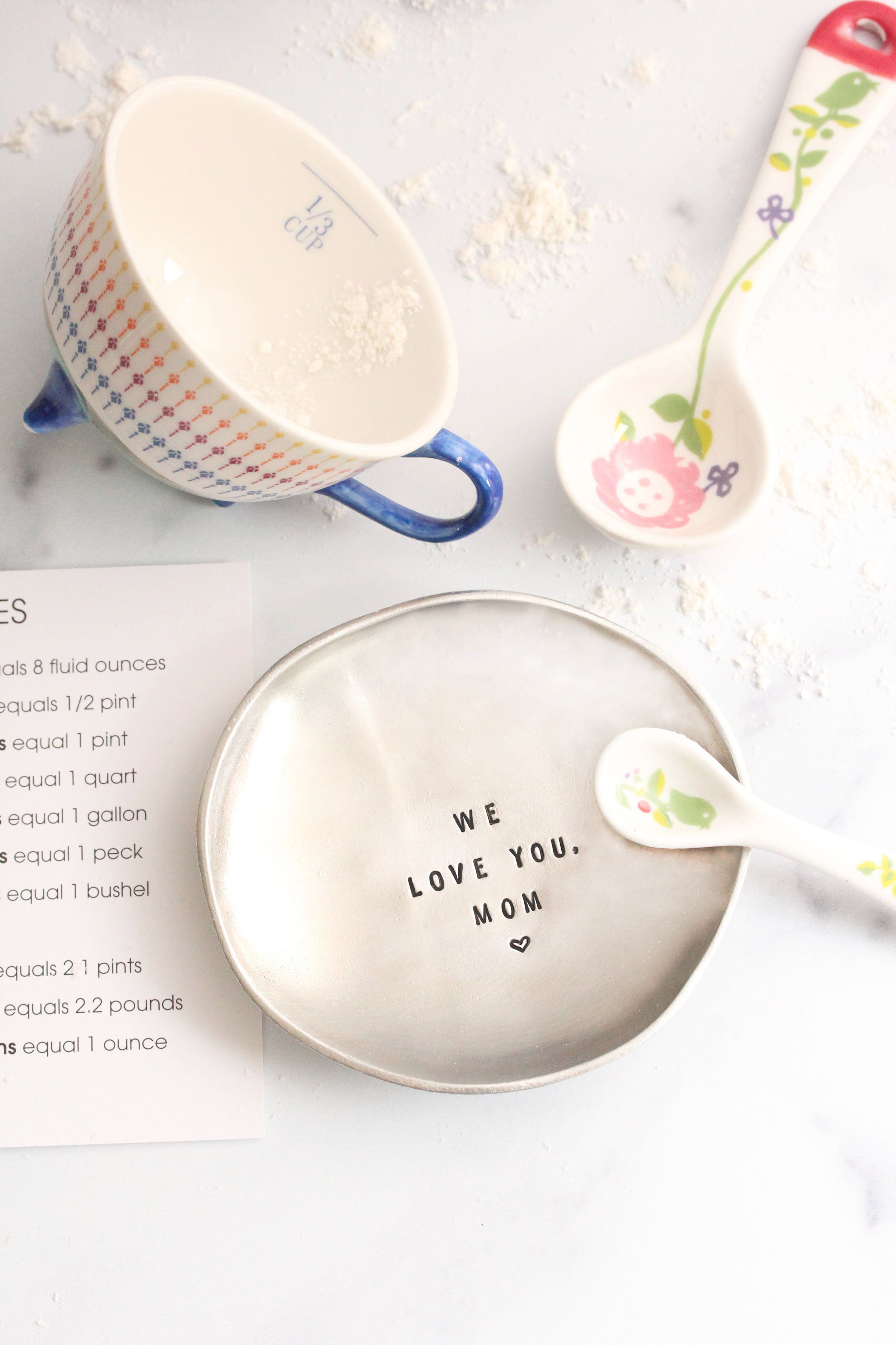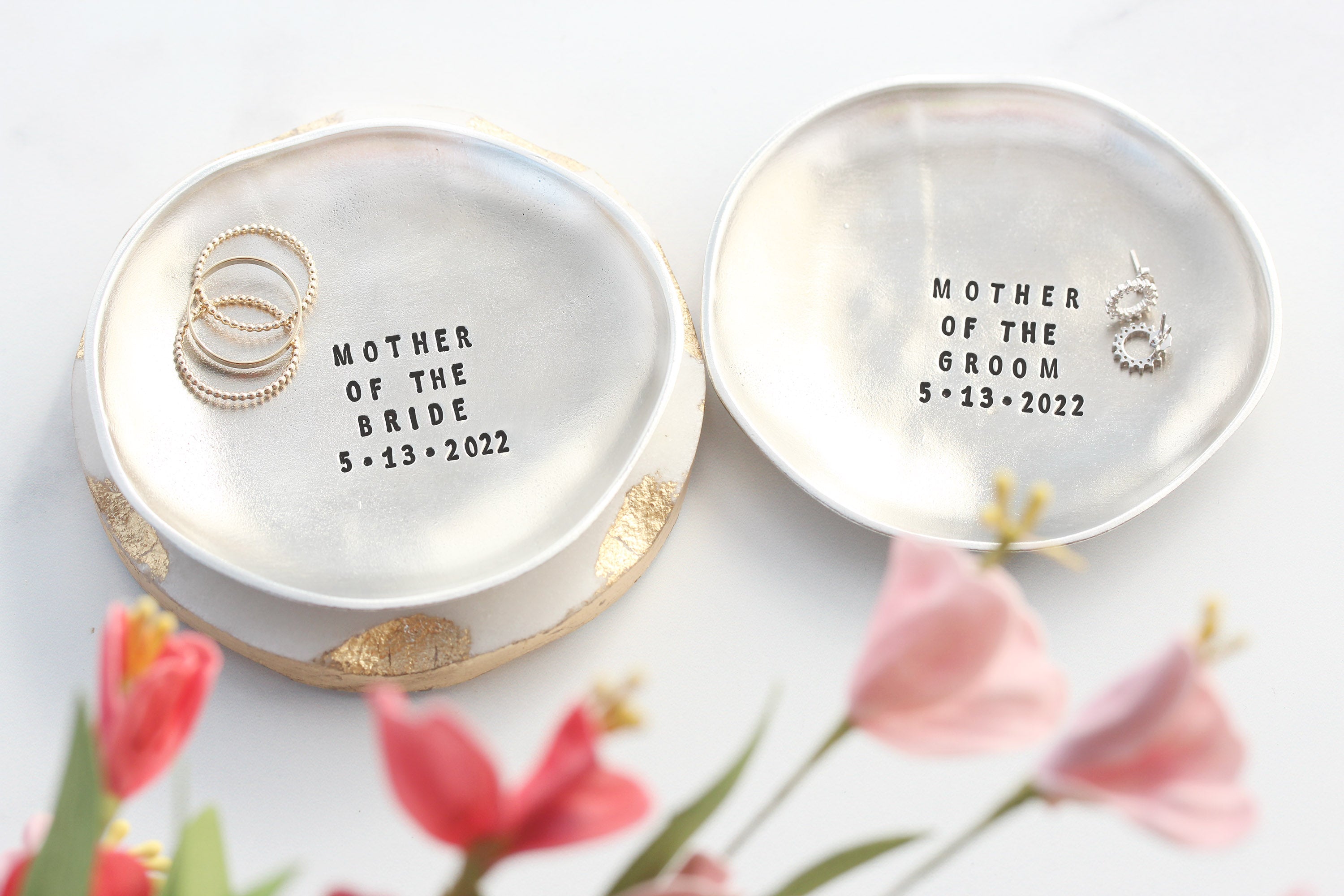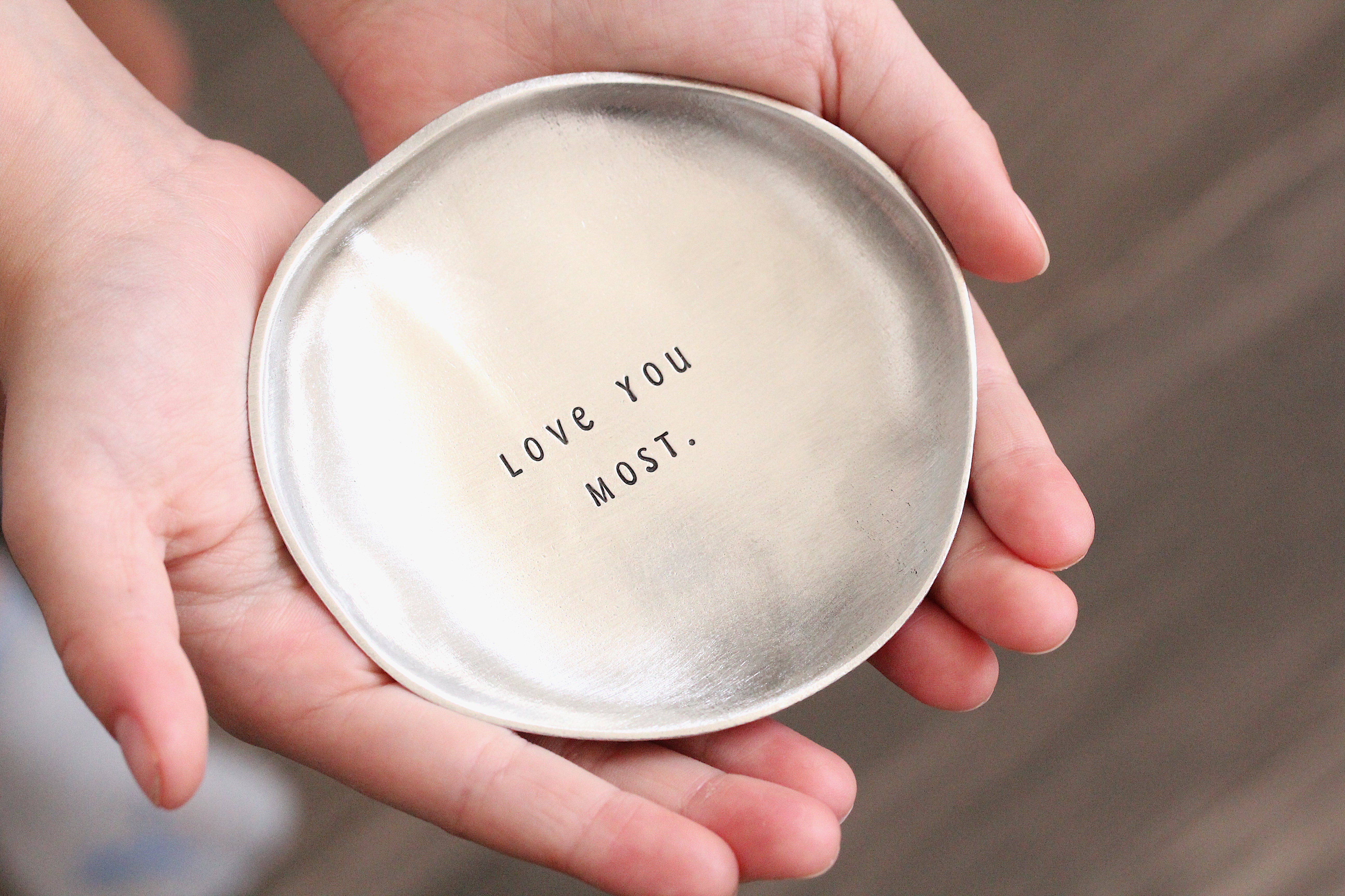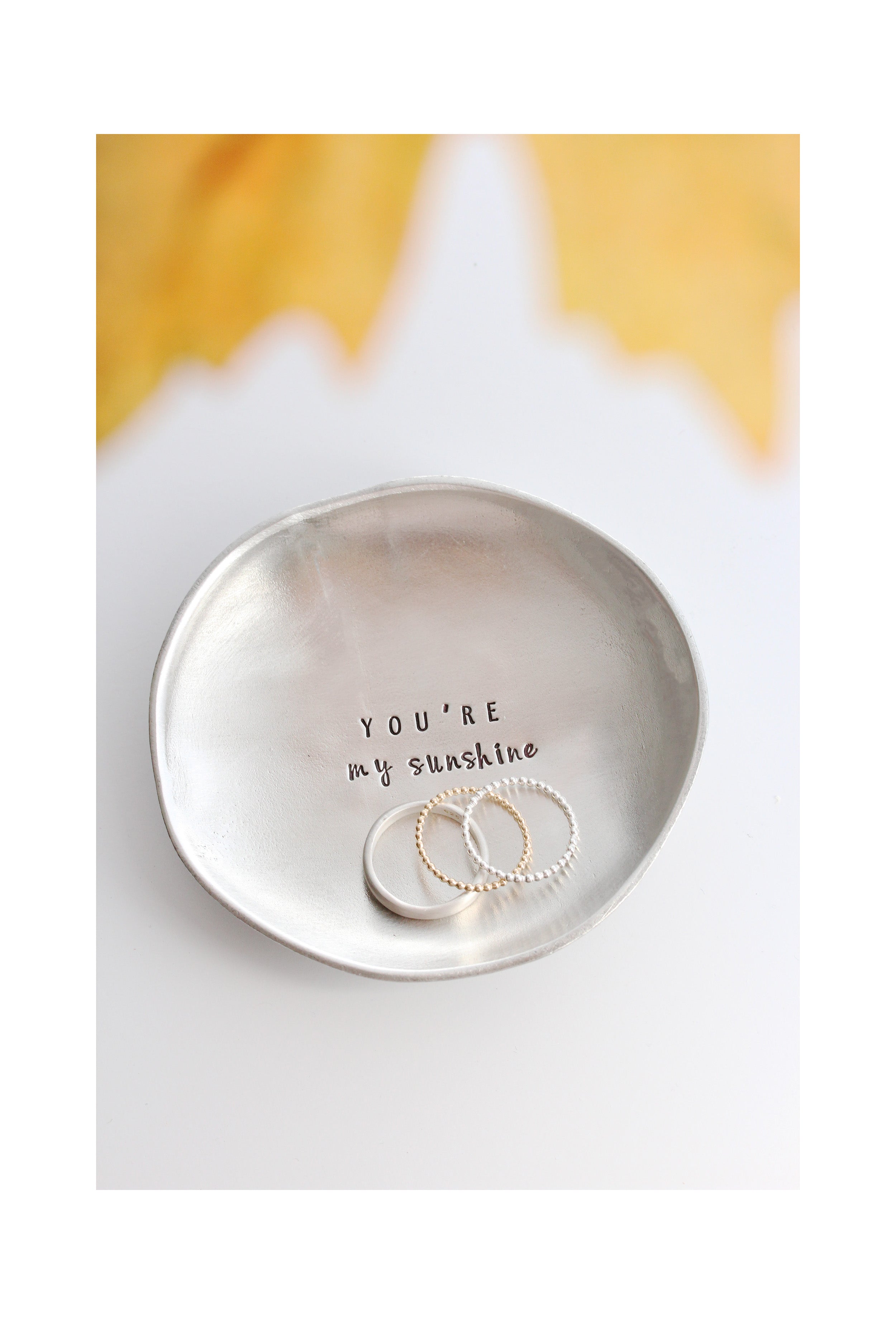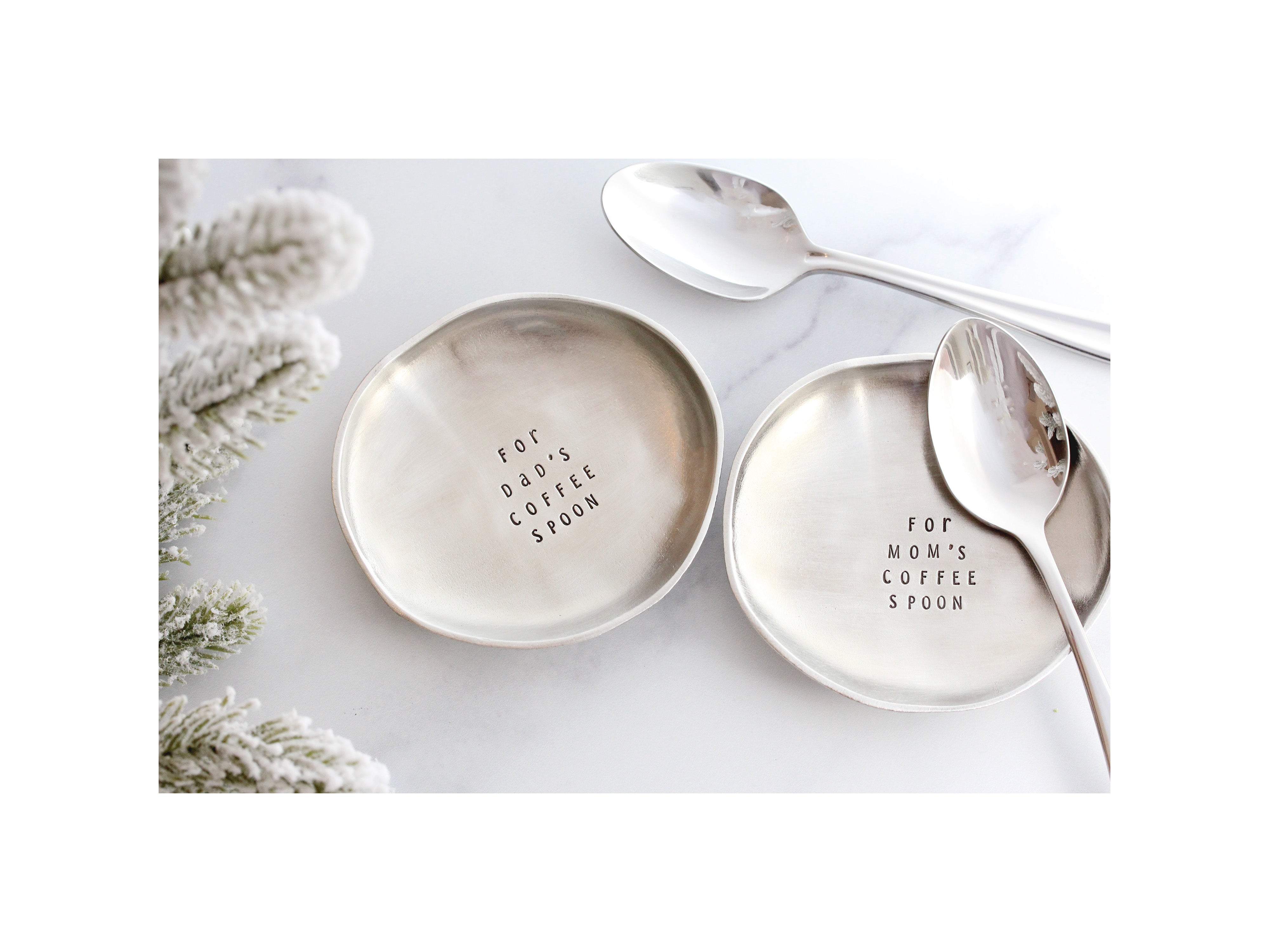 This beautiful dish is handsculpted and cast in fine silver pewter. Customize up to three lines of text with 10 characters per line. Pewter metal is a gorgeous bright white metal that will last forever and never tarnishes, so no maintenance is needed. Each dish is approximately 3.75 inches at its widest and has a very good weight.