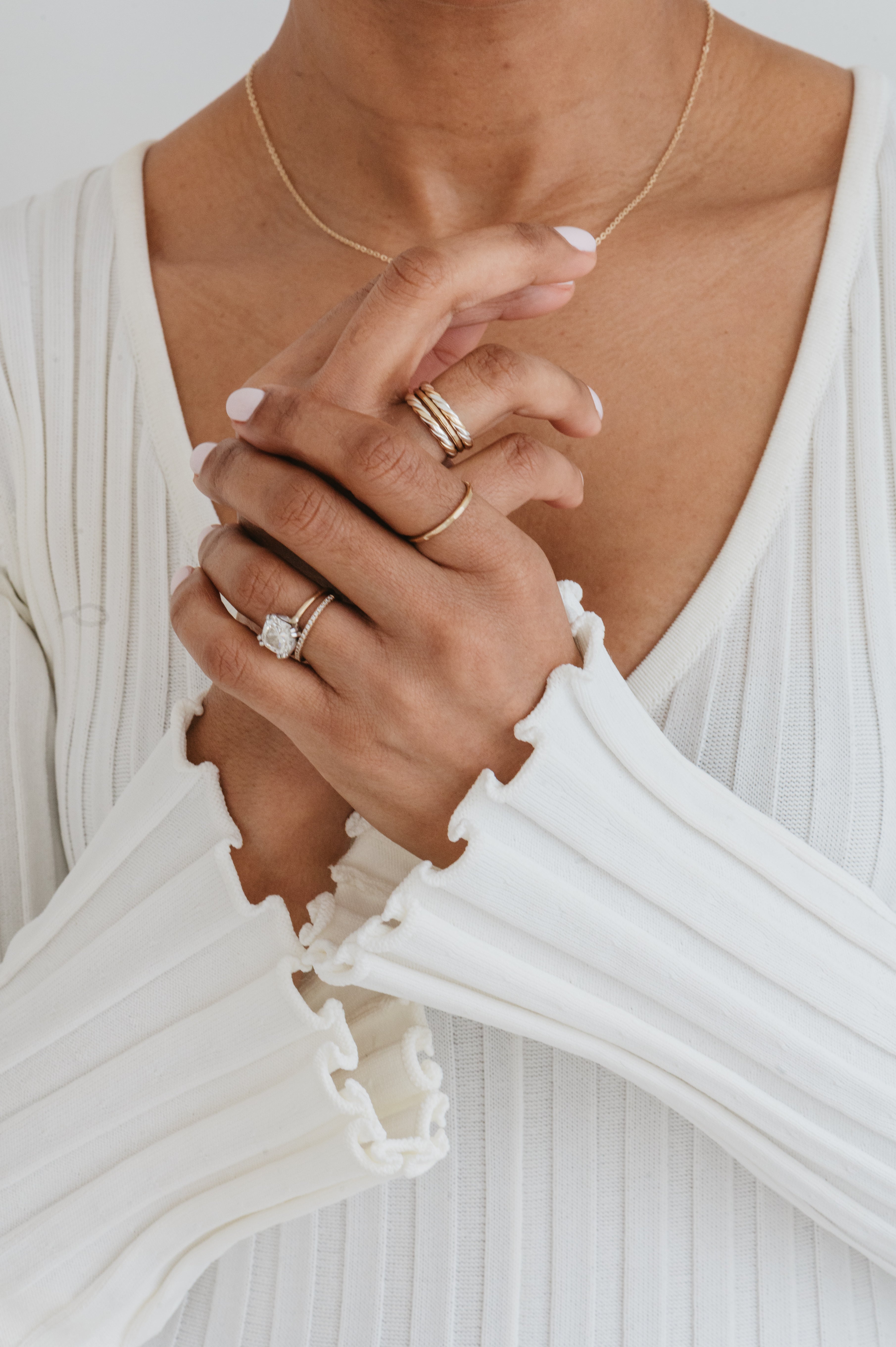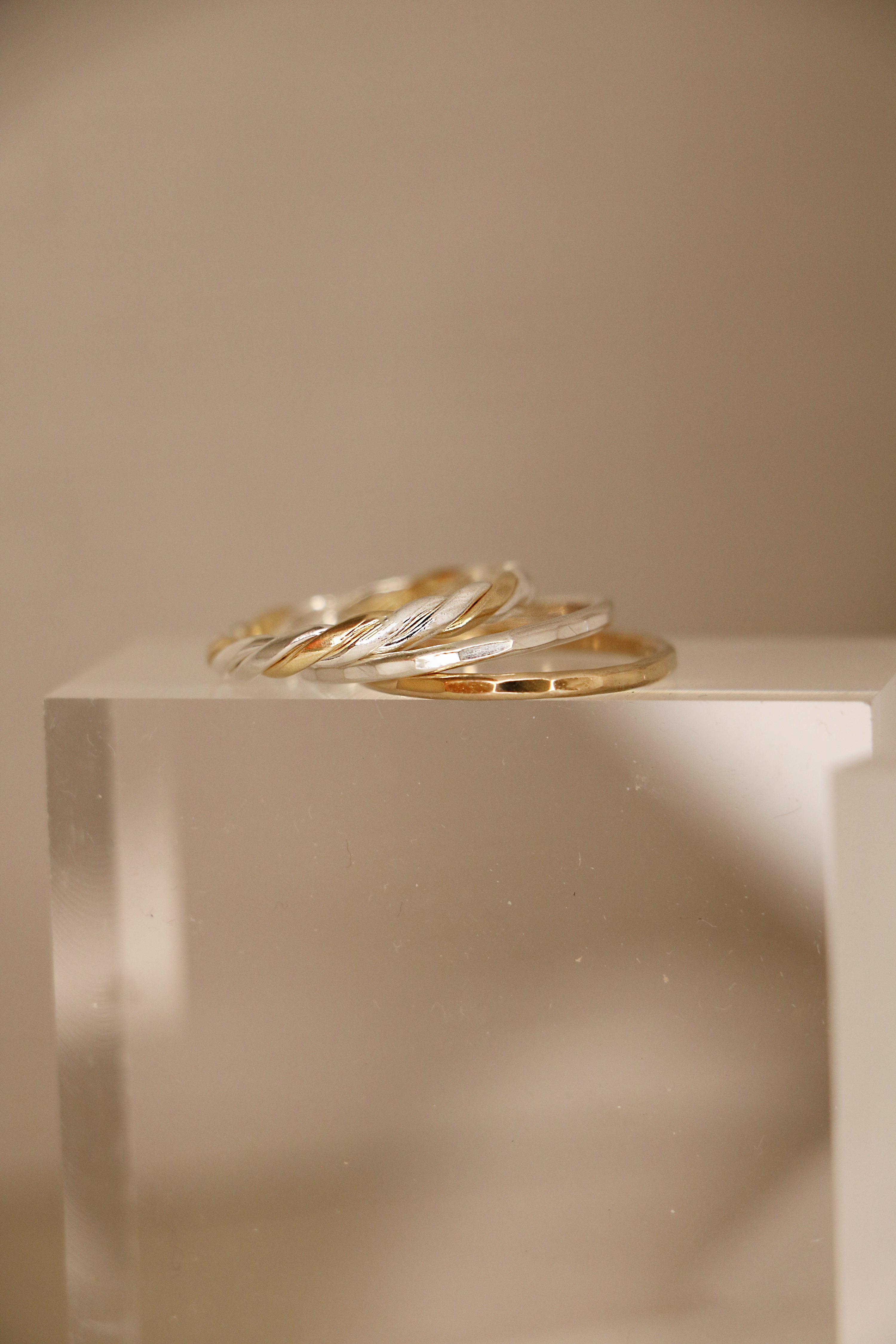 Gold and silver wires intertwine to become one seamless design in this twist ring. This two-toned ring is a great way to easily and effortlessly mix gold and silver. This ring looks great alone or stacked with your favorites. Available in sizes 5-9.