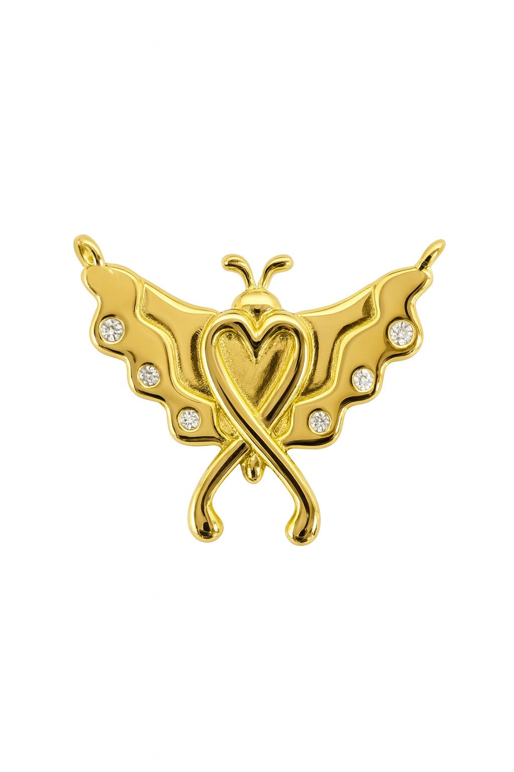 Beautifully unique, the butterfly has long been an international symbol for Down Syndrome. This butterfly is hand-drawn and set with 6 beautiful cz stones. The body of the butterfly delicately forms an awareness ribbon in the shape of a heart. Hung from a 14K gold filled chain.