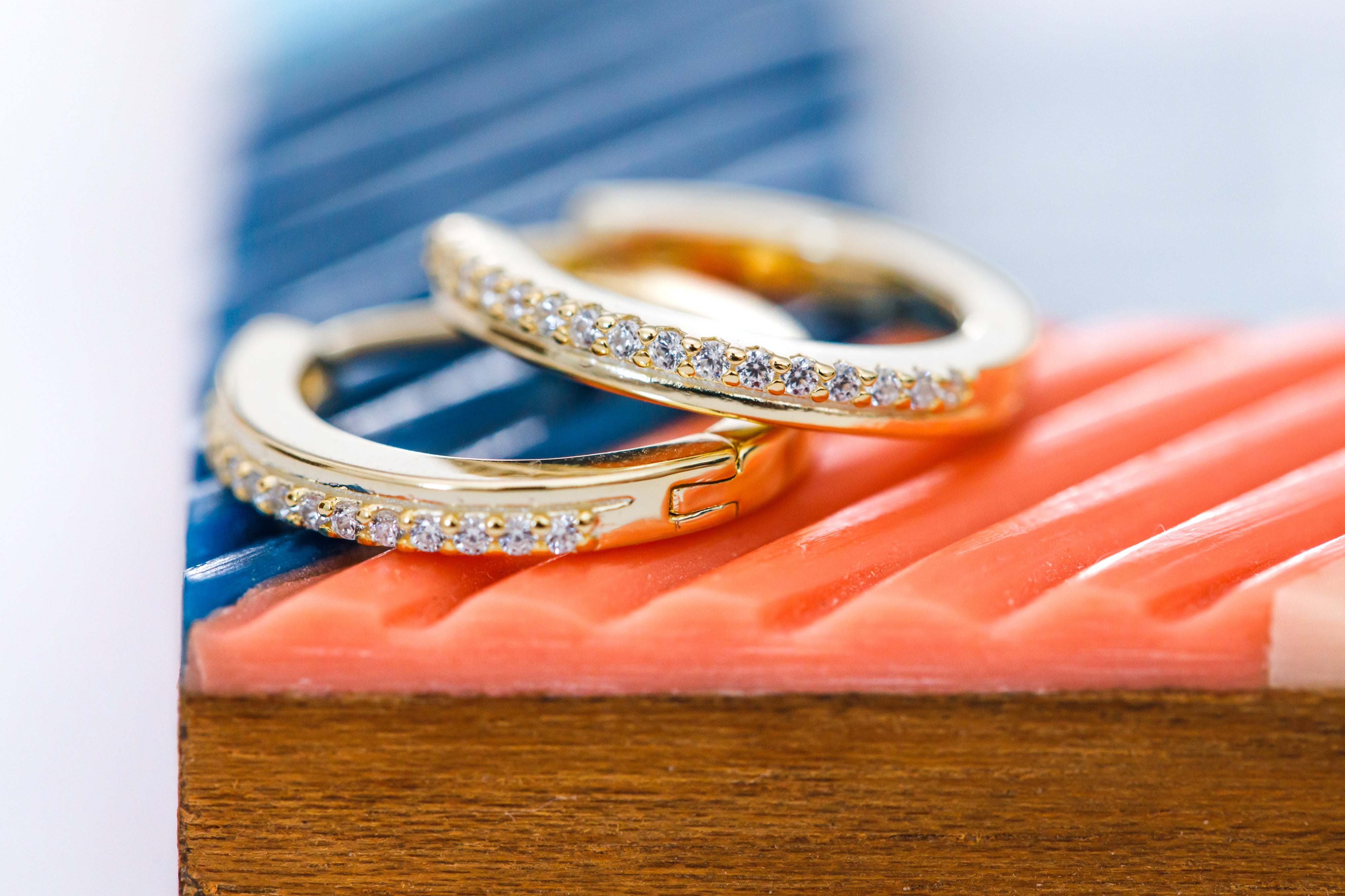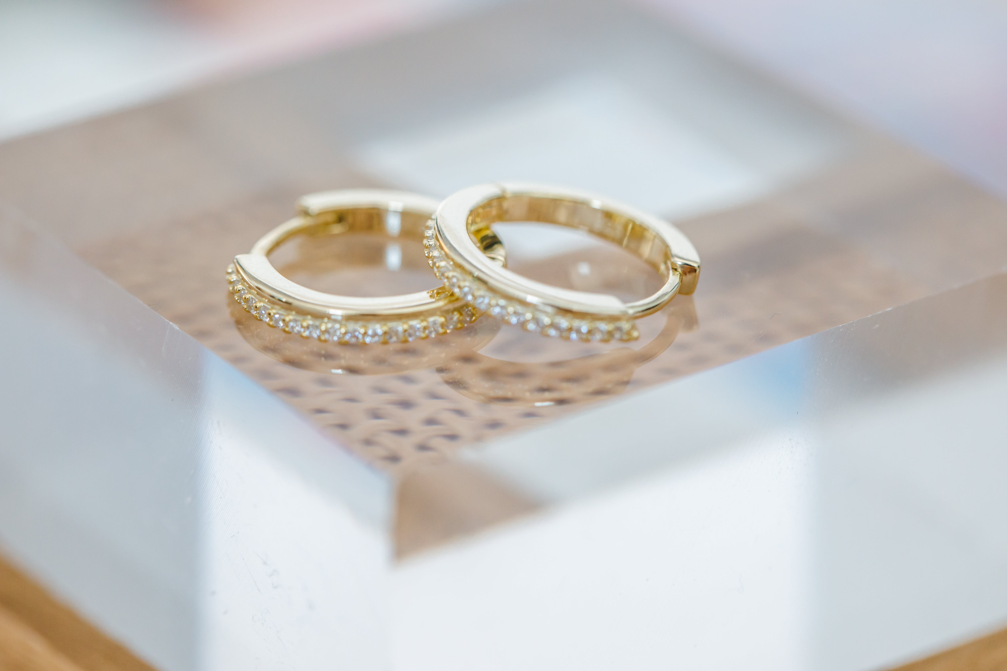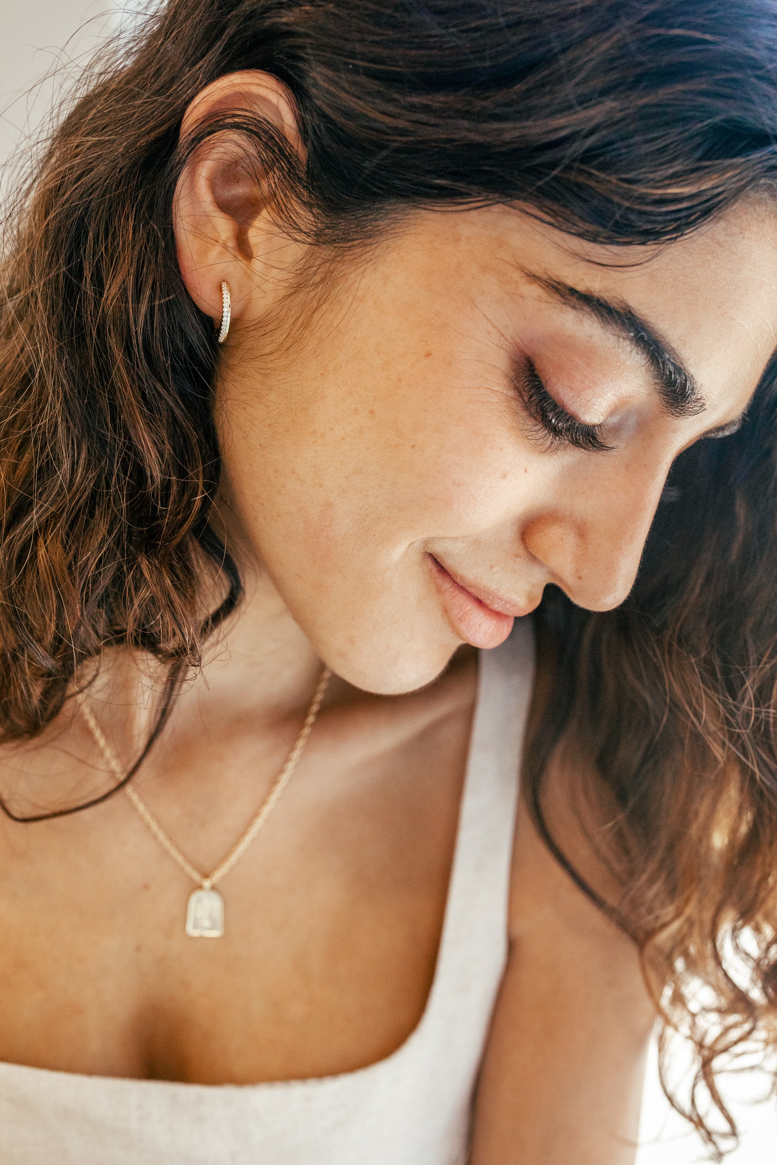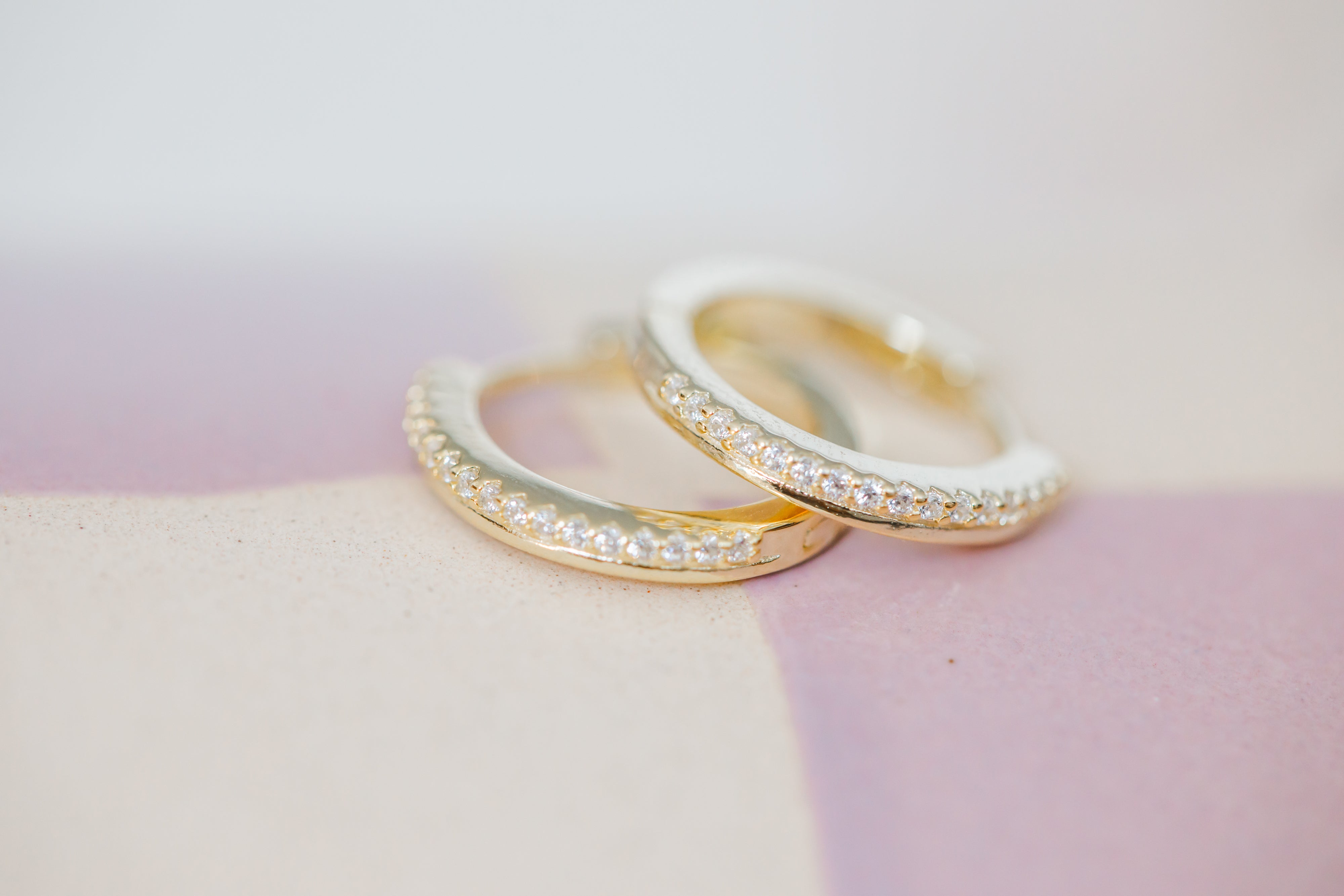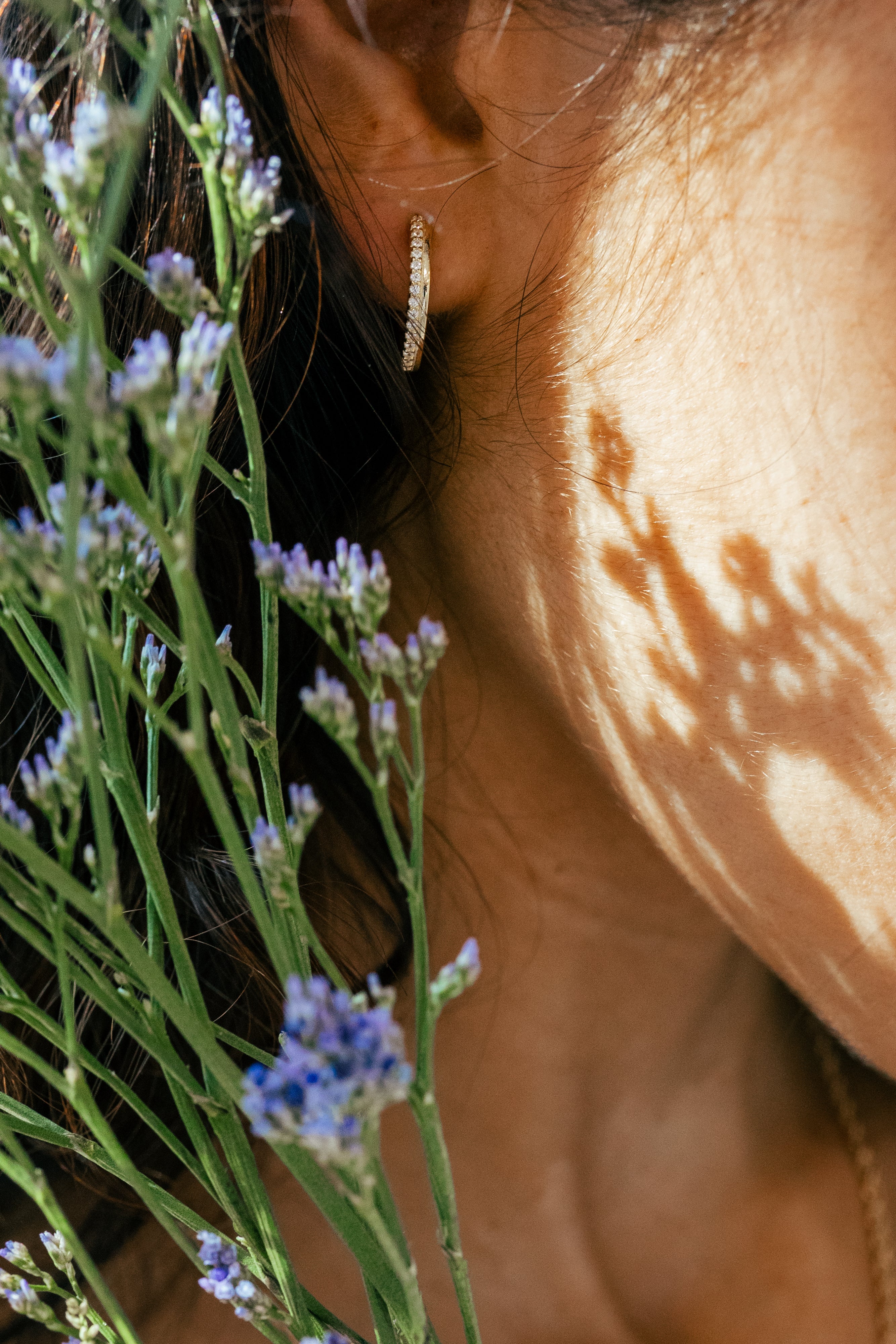 A traditional style hoop but elevated in stye, with a double-wide loop. One loop has a mirror shiny finish, the other loop is studded with white cz stones. These are the perfect hoops for a more elegant affair but also look great paired with jeans.