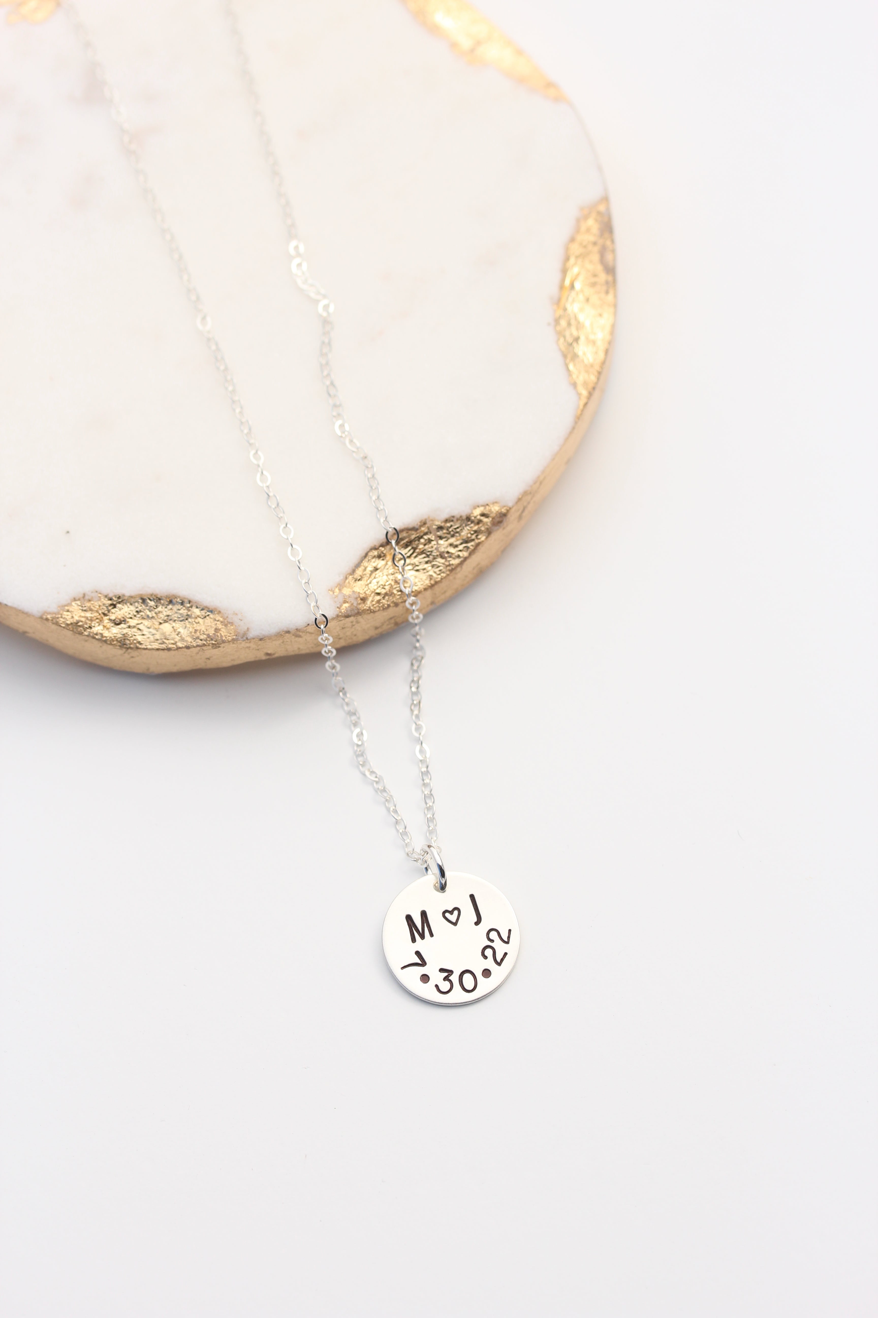 This necklace features a beautiful handstamped disc in your choice of sterling silver or 14K gold filled. Stamped on the disc is you and your loved one's initials along with your anniversary date. This is a classic keepsake you will cherish for years to come.