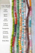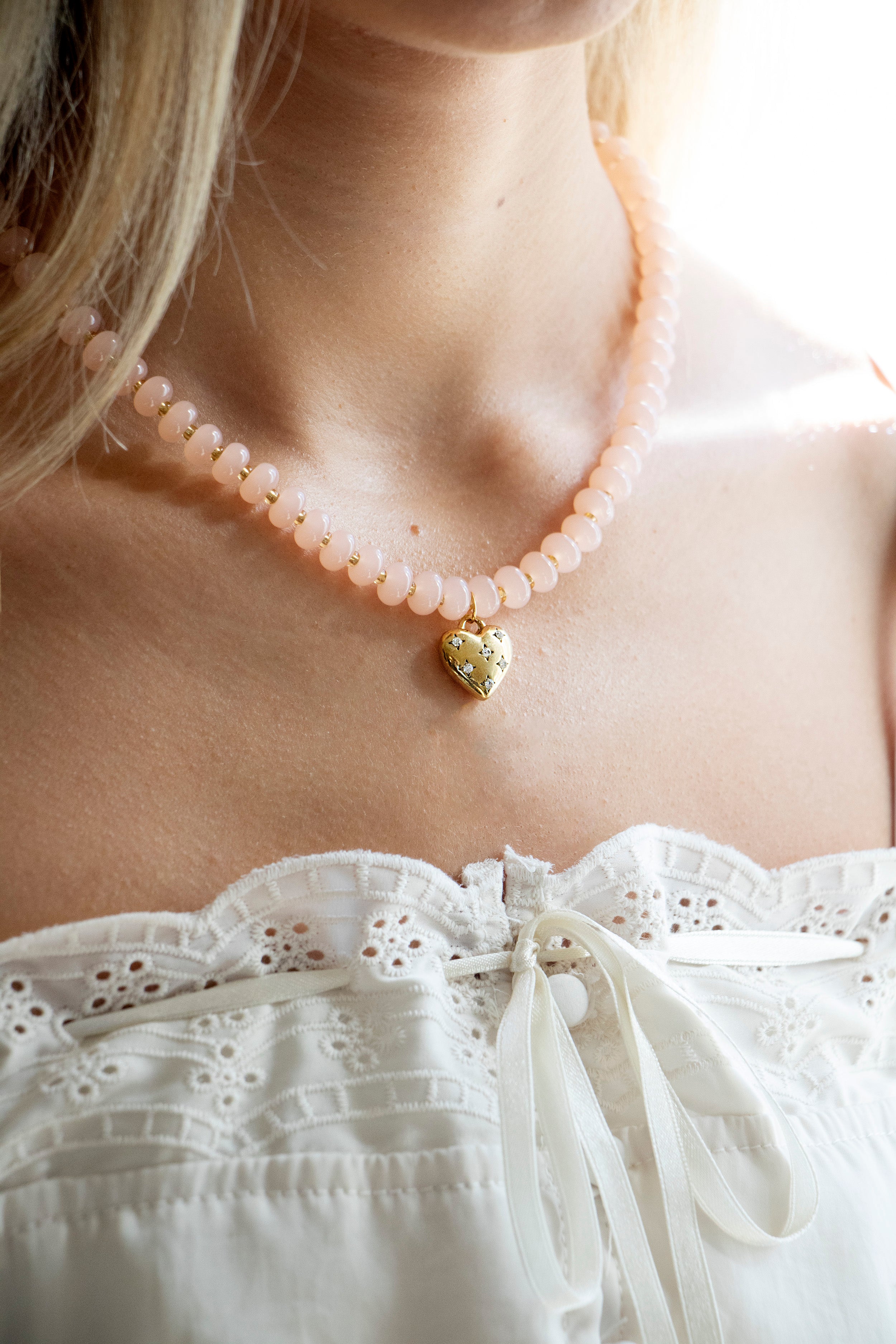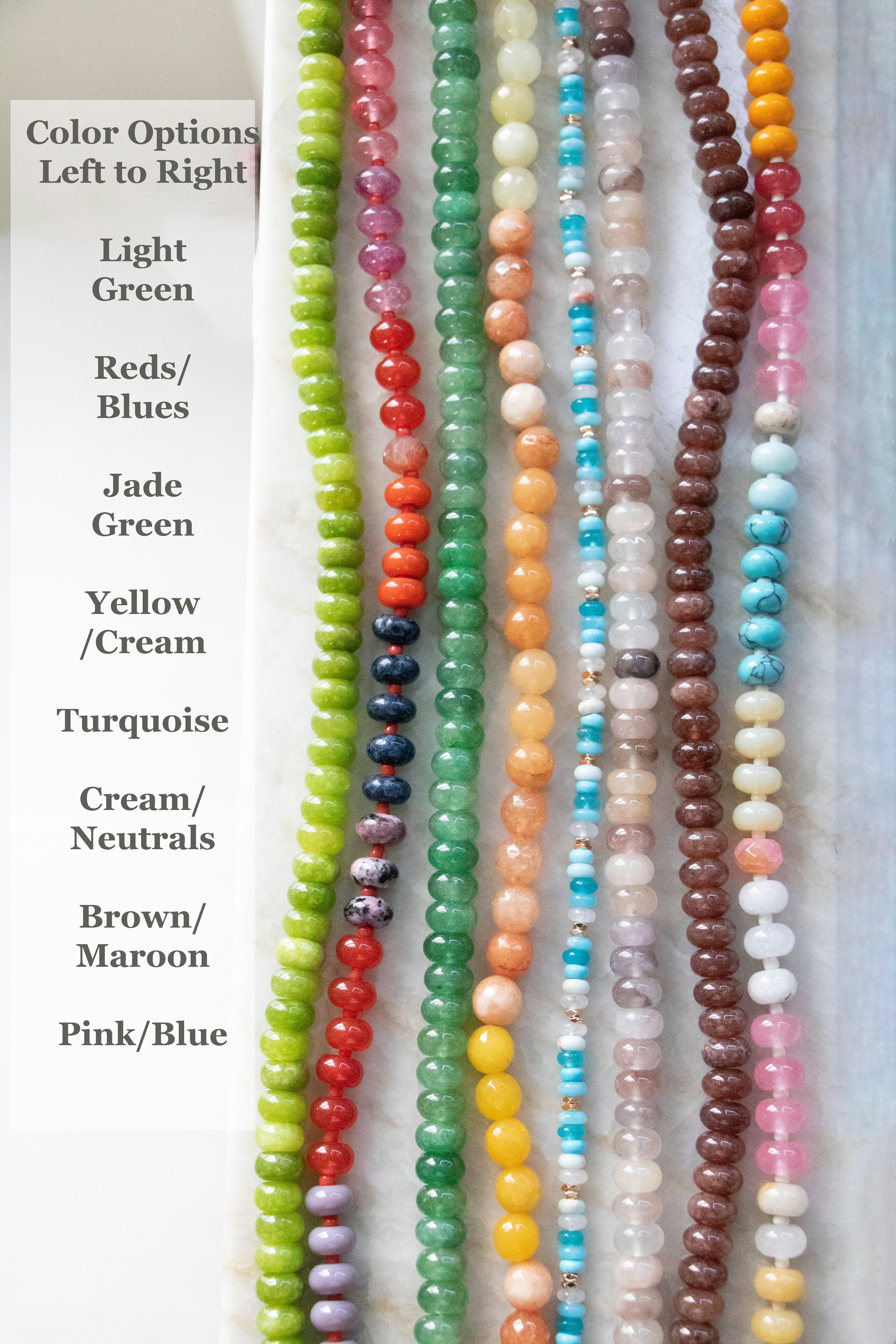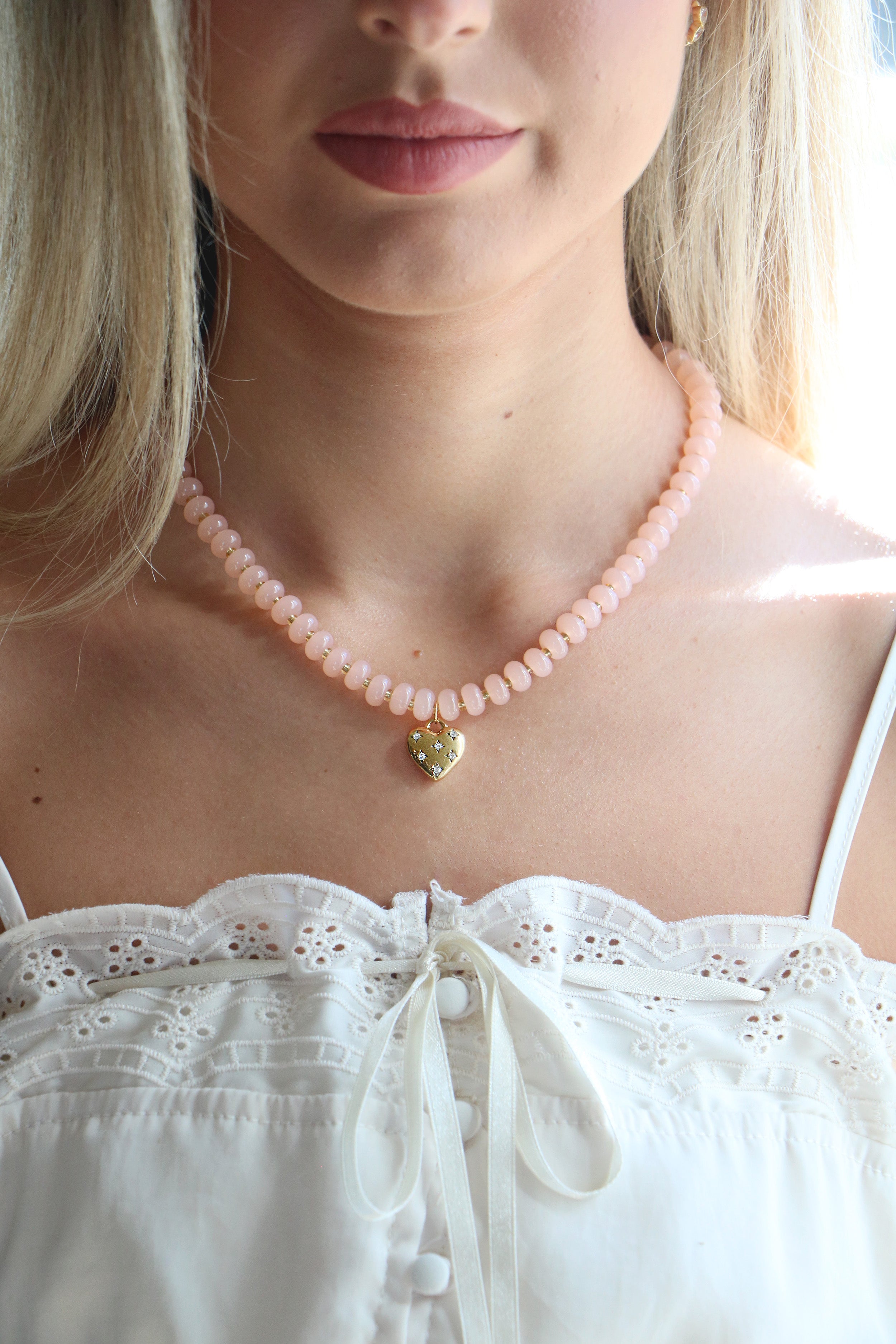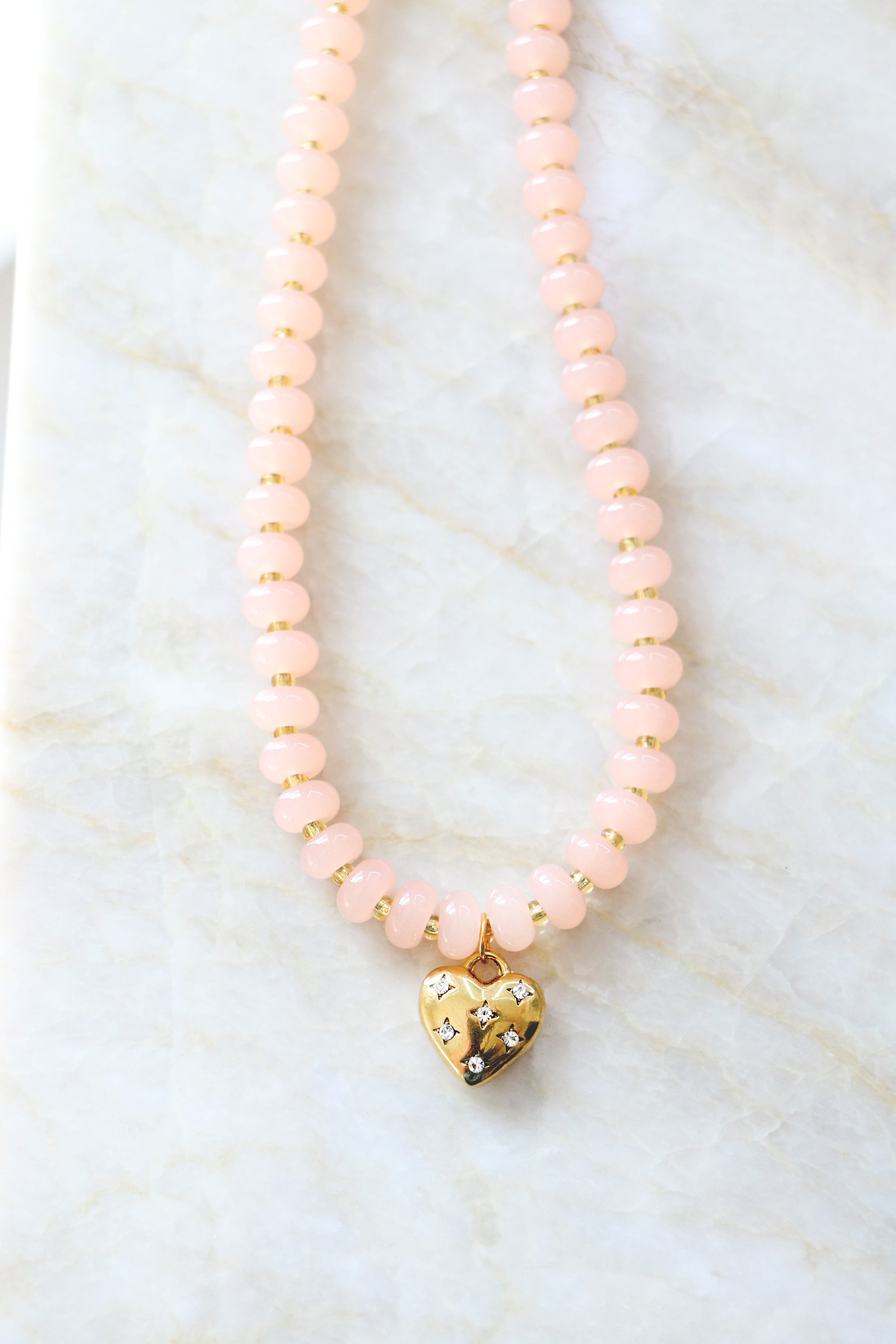 A fun statement necklace for any occassion. Assorted beads create the base for layering with so many different colors and textures. A gold puff heart is studded with tiny cz crystals and sits stationary on the necklace. Total length is adjustable 17"-20".