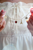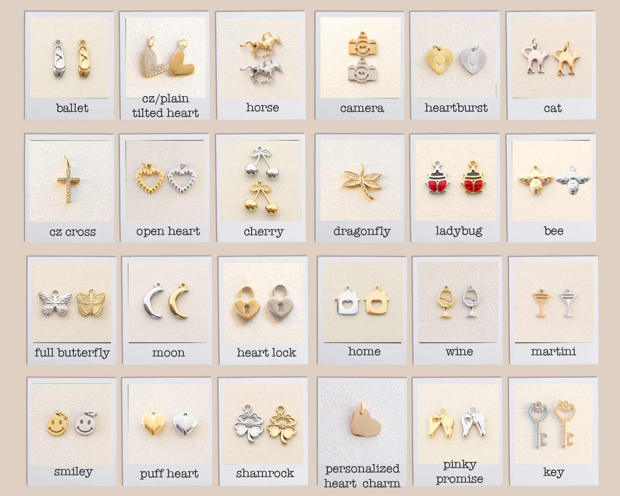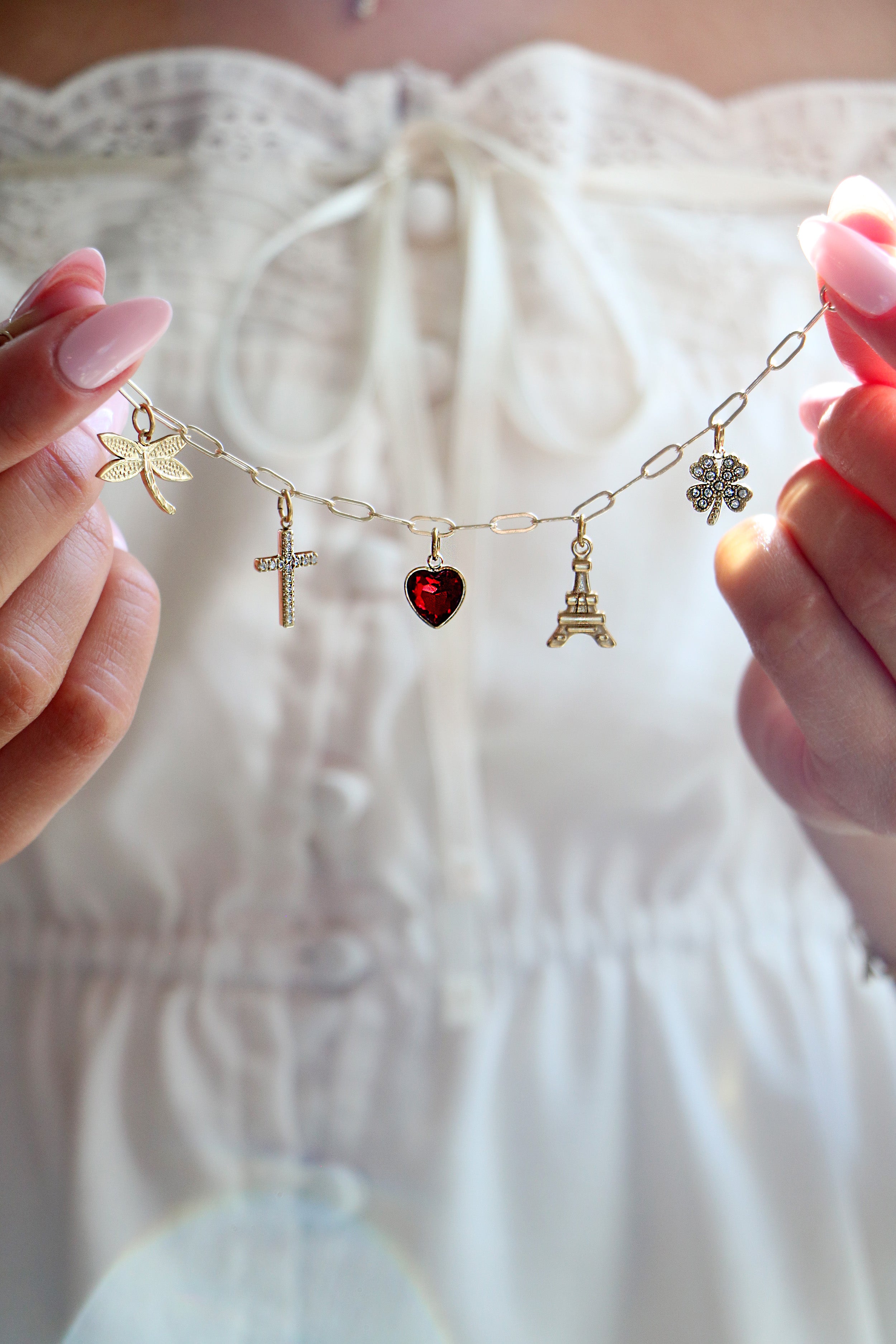 A personalized necklace made just for you. Chose the charms of your choice! Choose between two types: the front clasp style which allows adding and removing charms at any time, the standard style uses charms permanently stationed on the chain. You can also purchase without any charms, to add your own!