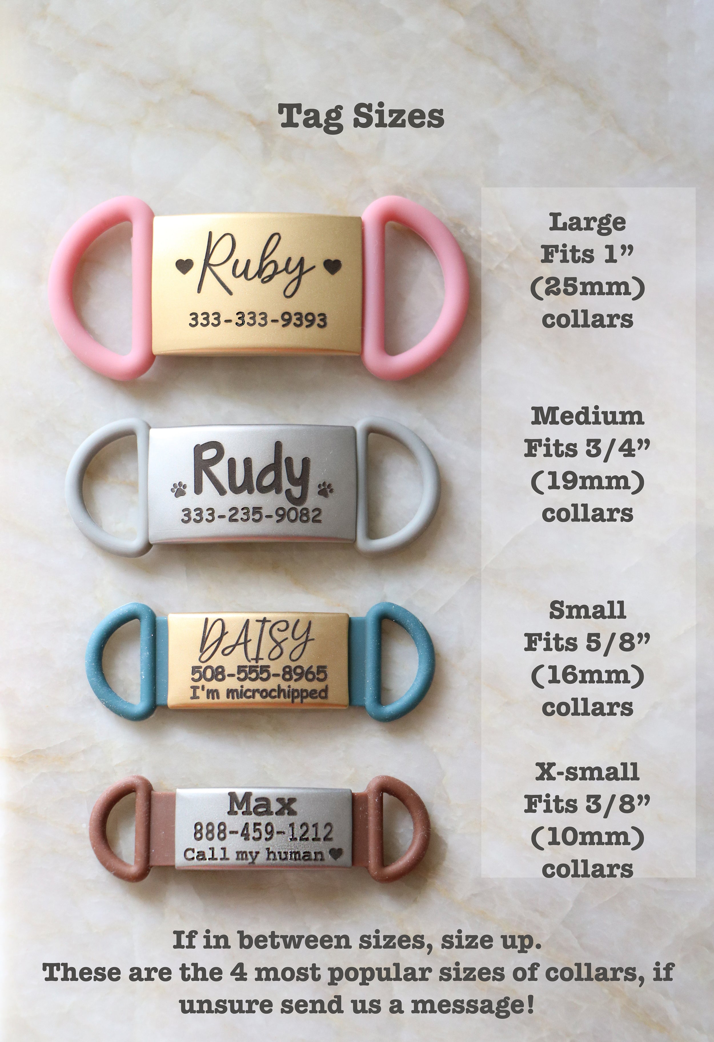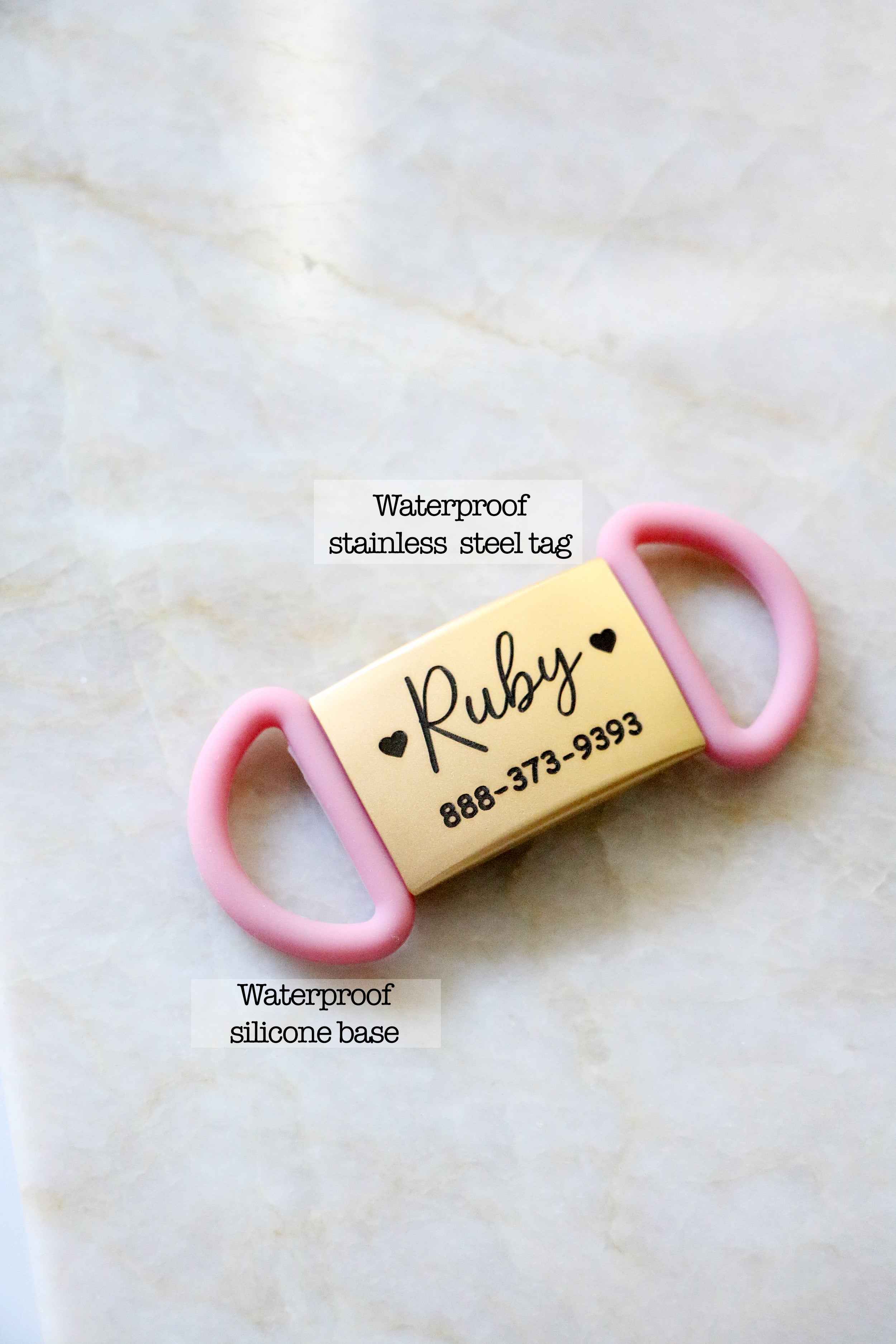 Made from high quality stainless steel and silicone, these tags are completely waterproof so they will not rust and can withstand all your pet's adventures. Simply choose the size, color, and font at checkout.