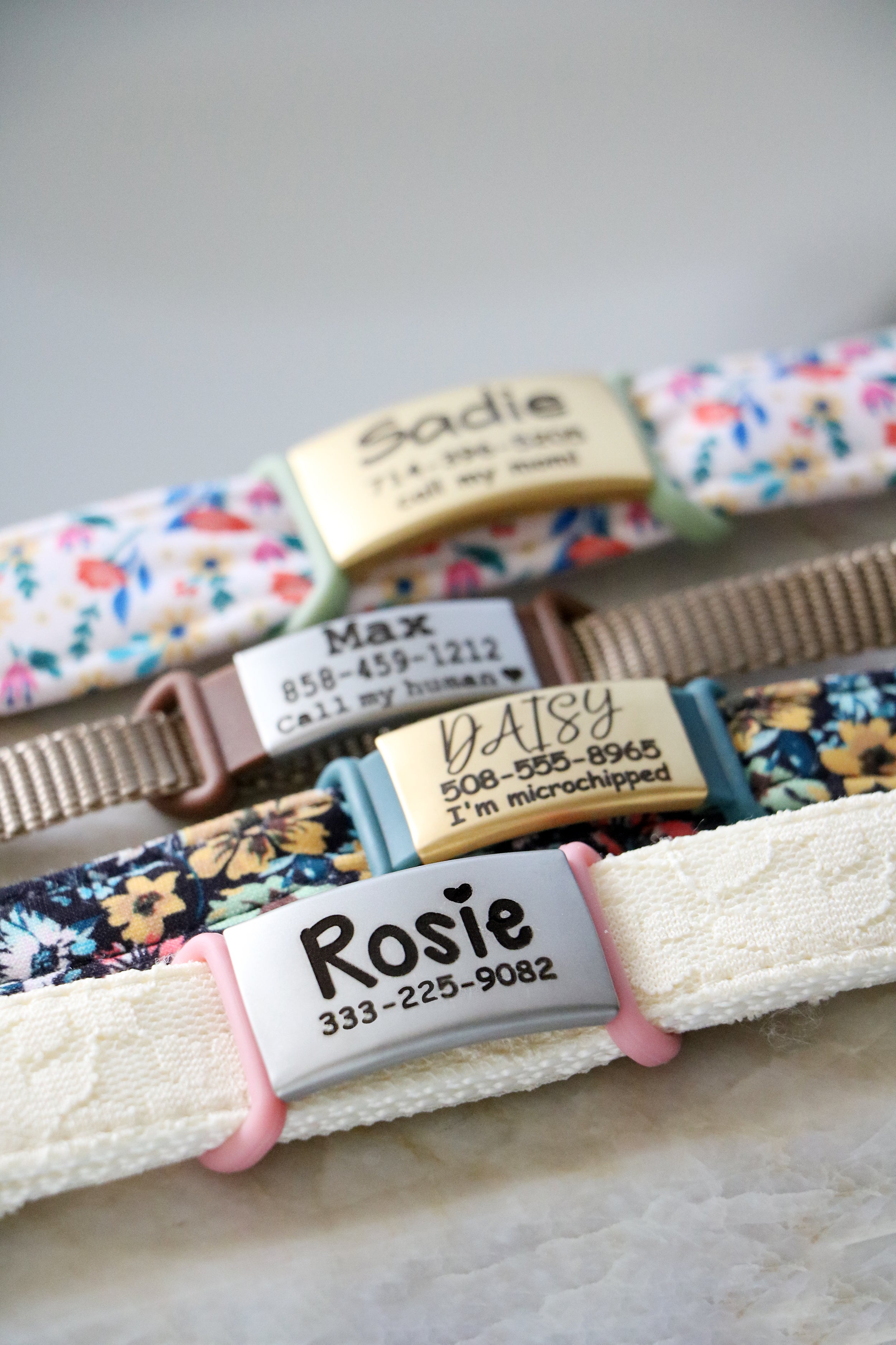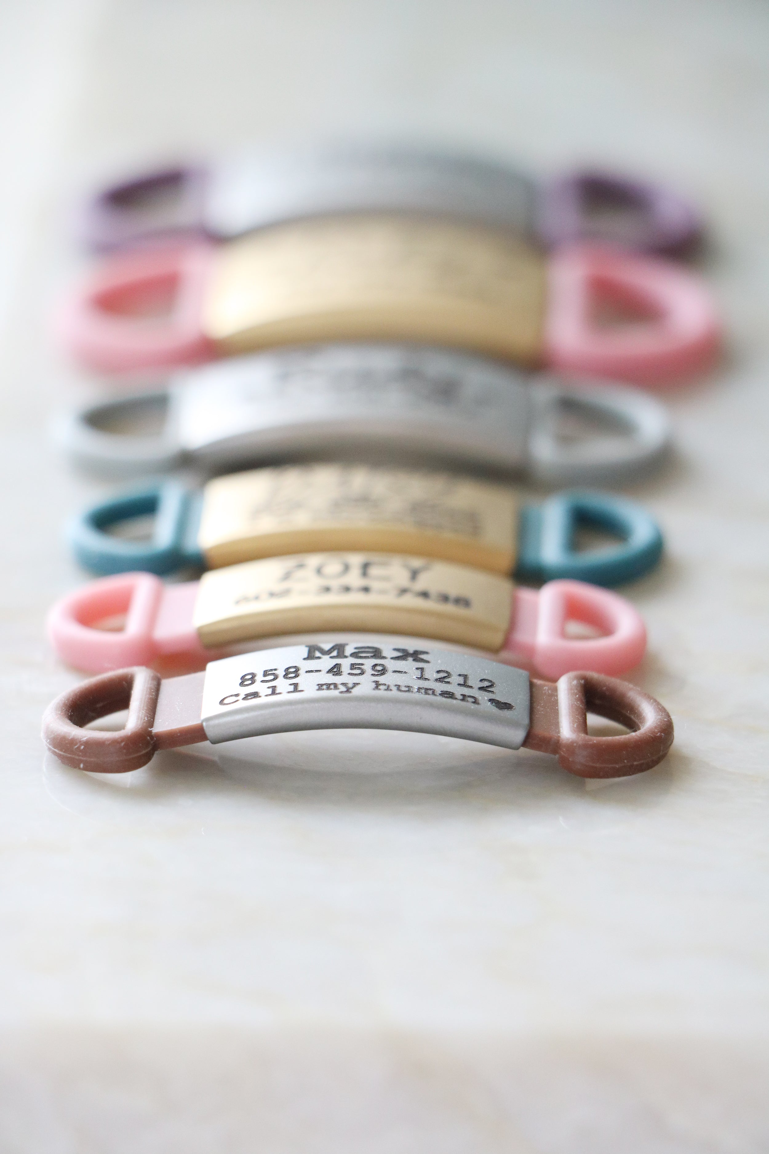 This will be your new favorite pet tag! Completely customizable with color and font, these ID tags are perfect for your furry family. Forget the noisy jingle of traditional tags, these are silent and slide easily onto your pet's current collar! Great for cats + dogs alike!