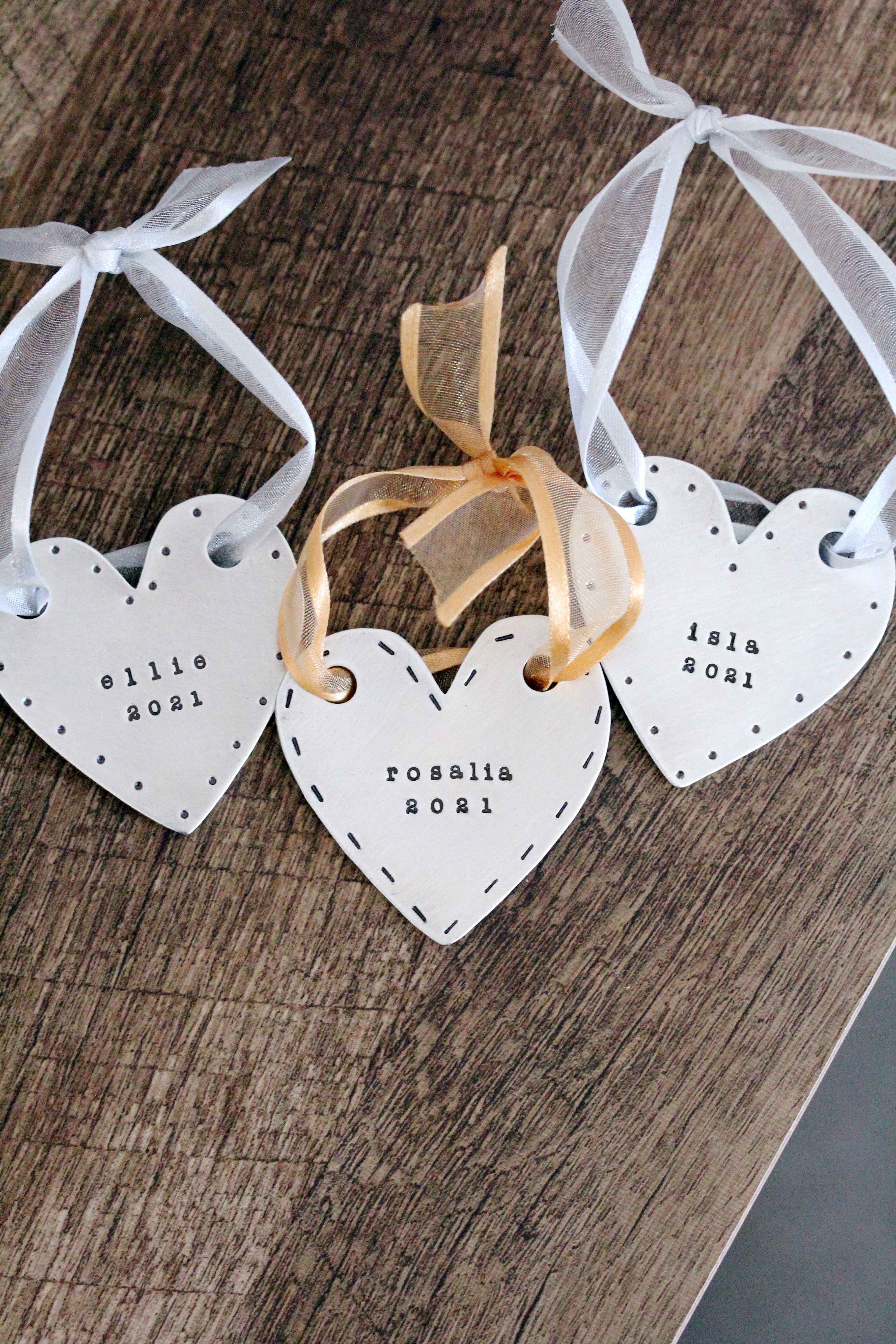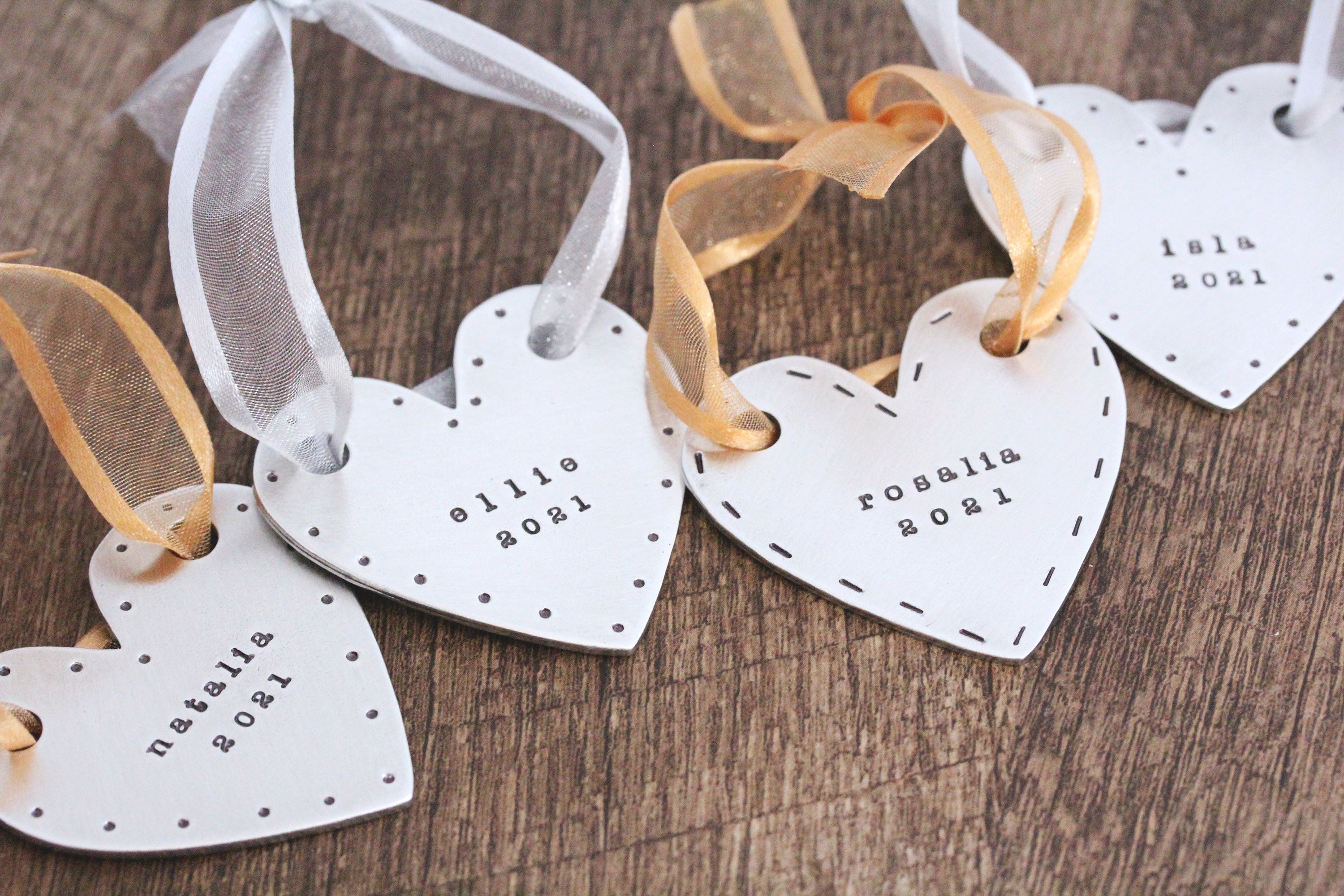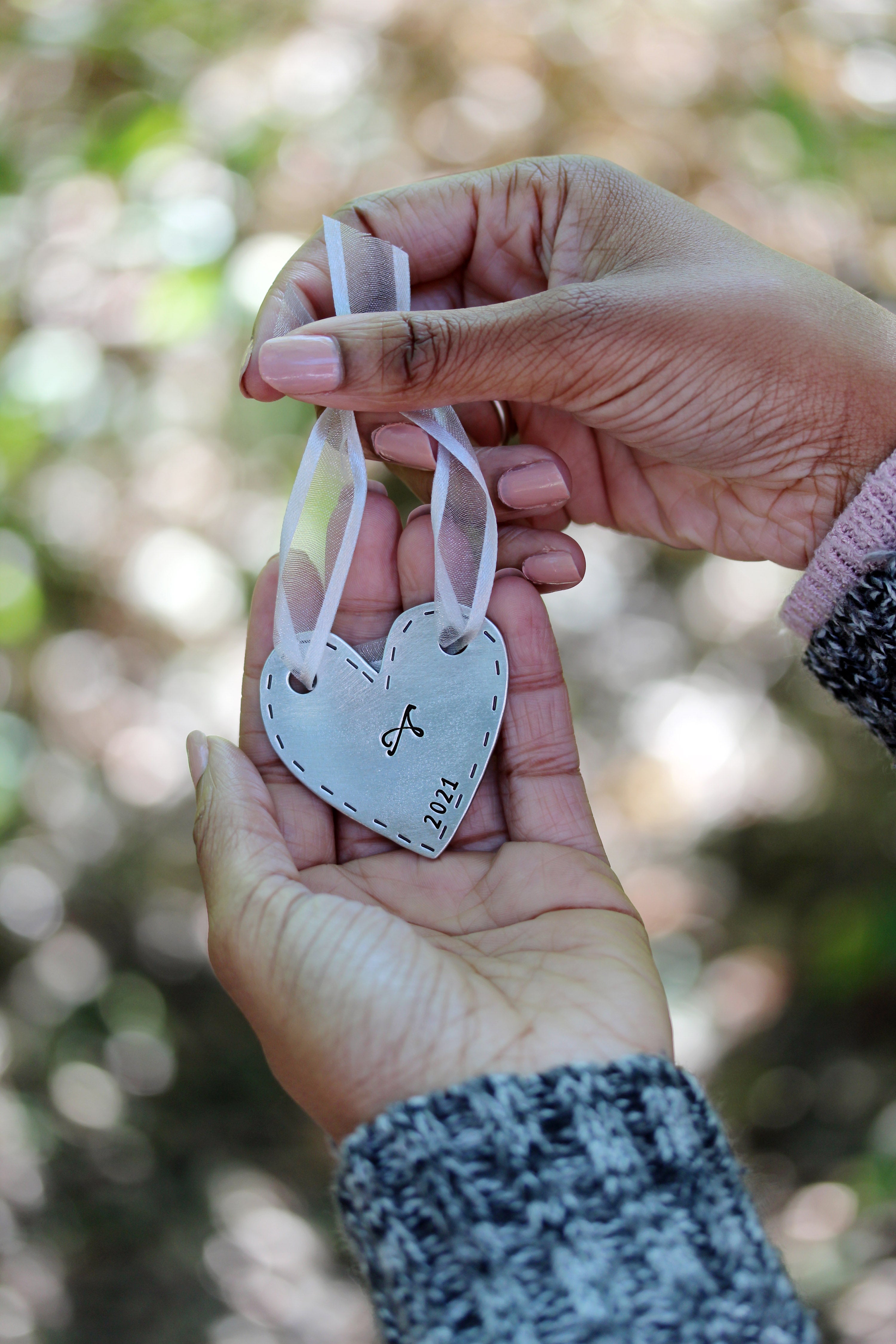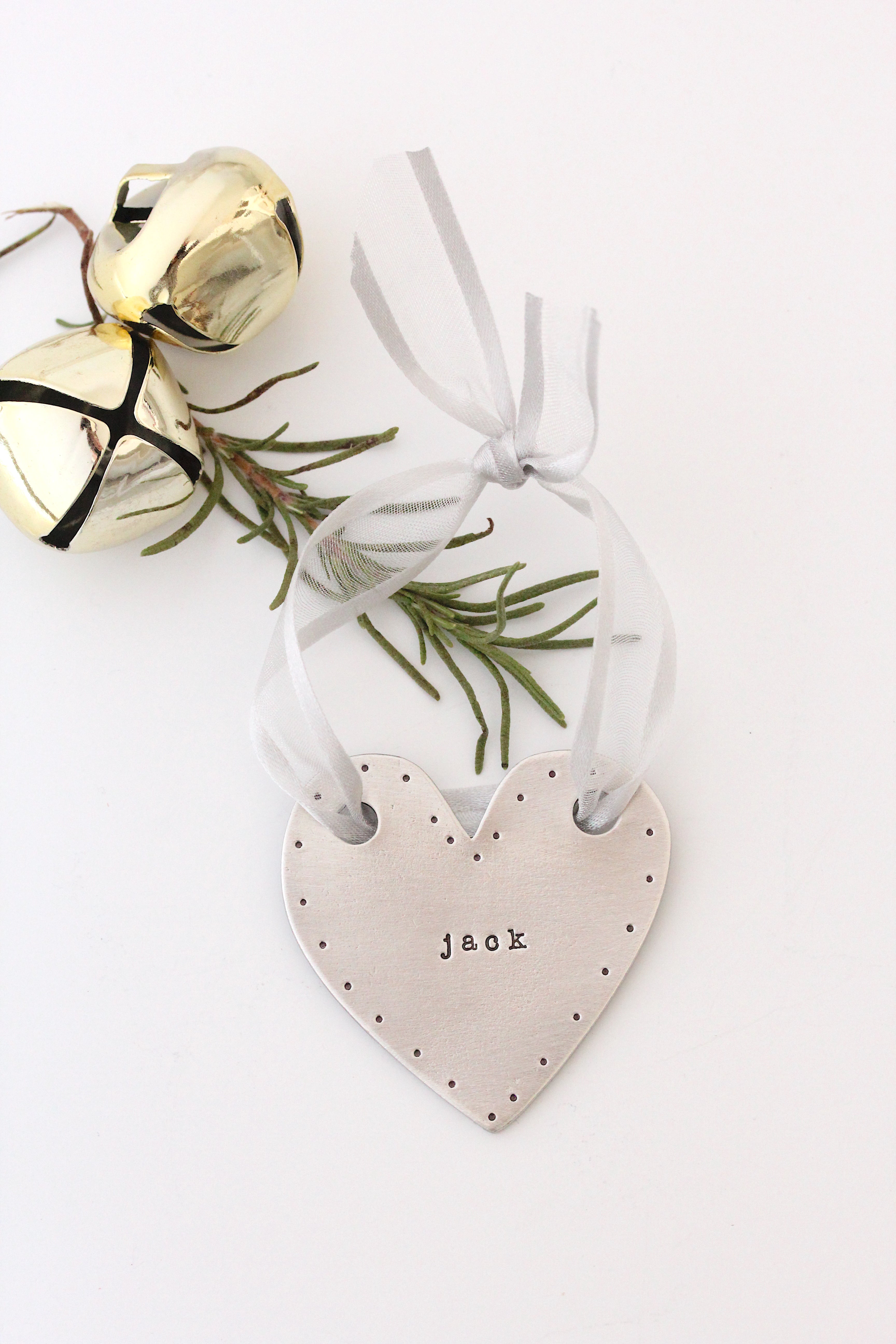 A beautiful solid pewter hear tournament, bench crafted and personalized with any text. Max of 12 characters / 2 lines. Heart measures 2" x 2". Hung from a silver or gold organza ribbon.