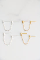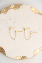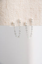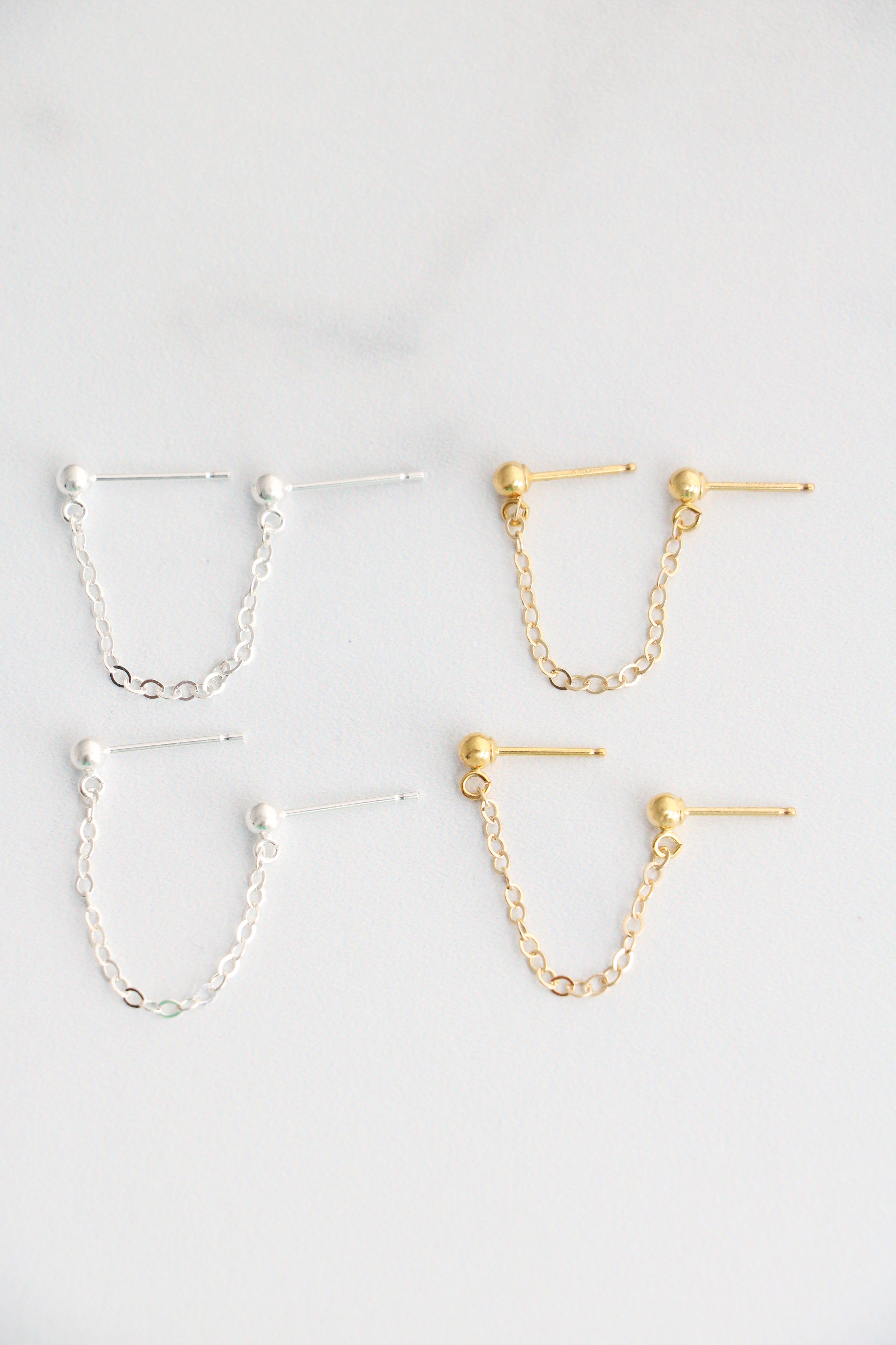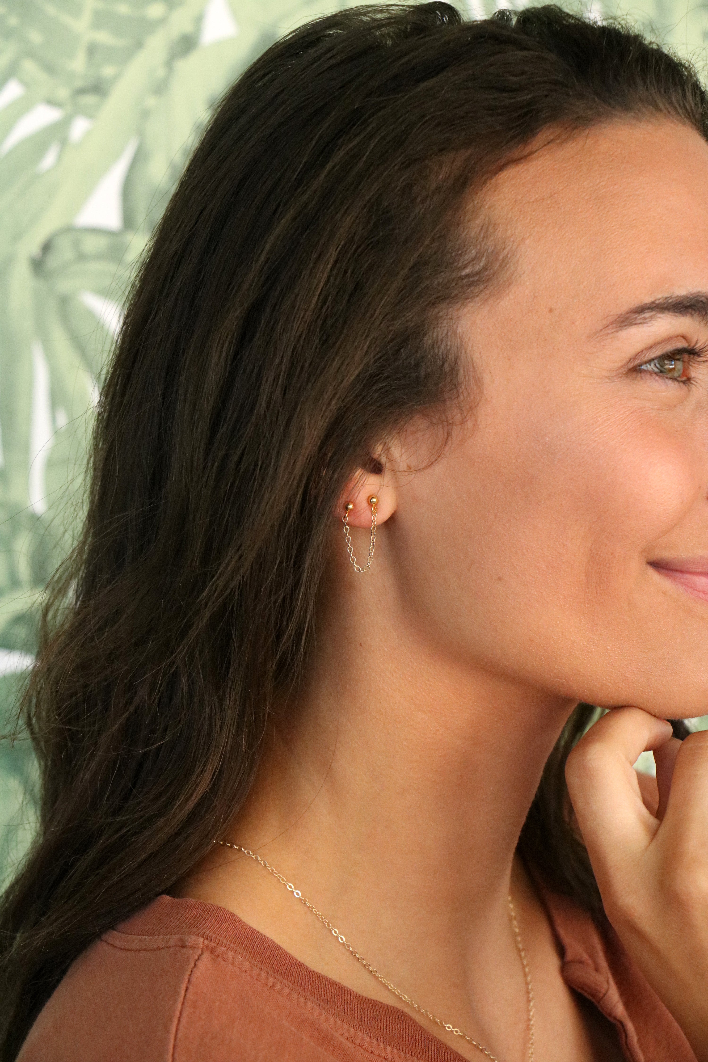 These chain drop earrings are for double piercings. Each end is attached to a ball stud. Earrings are available in solid sterling silver or 14K gold filled. Total length of chain is 1.5", but if you have a specific length please let us know at checkout. Backs of earrings include a clear push back.