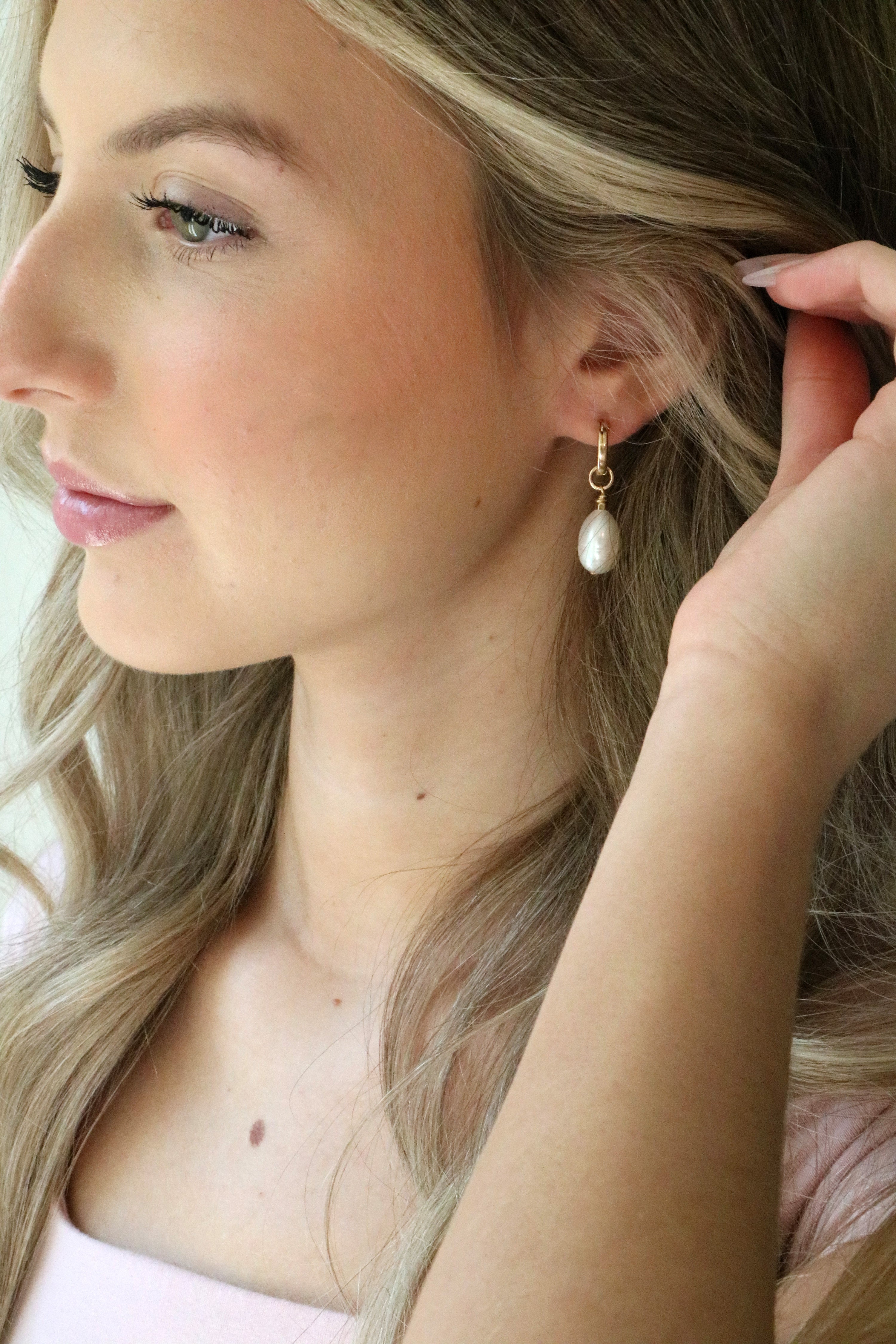 These statement earrings are timeless and elegant. Hoops measure approximately 19mm and 12mm and are the perfect size for everyday wear. A large freshwater pearl is wire wrapped and dangles from the center of the loop. Each pearl measures approximately 15mm. Pearls are genuine cultured freshwater pearls with a creamy white iridescent tone.