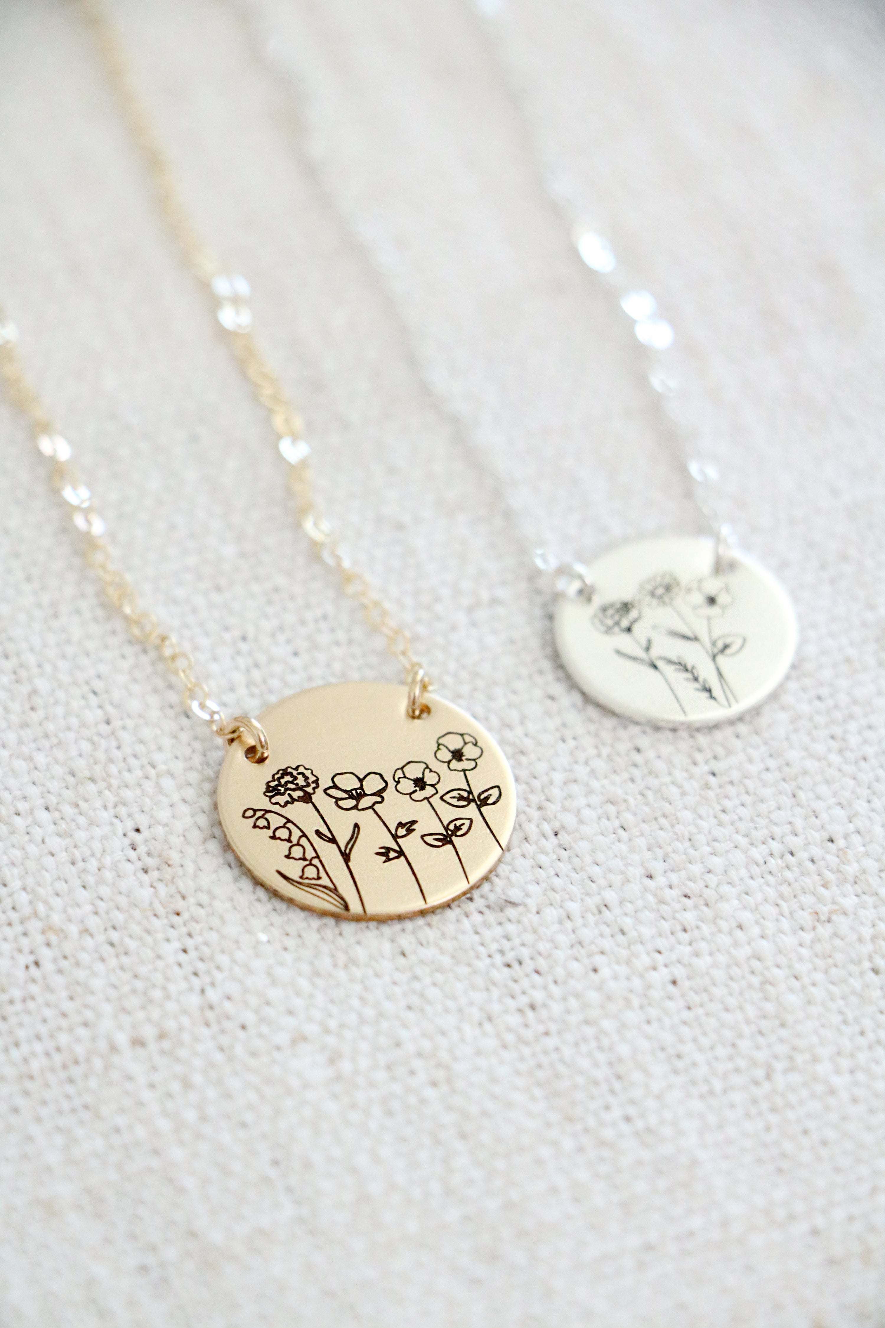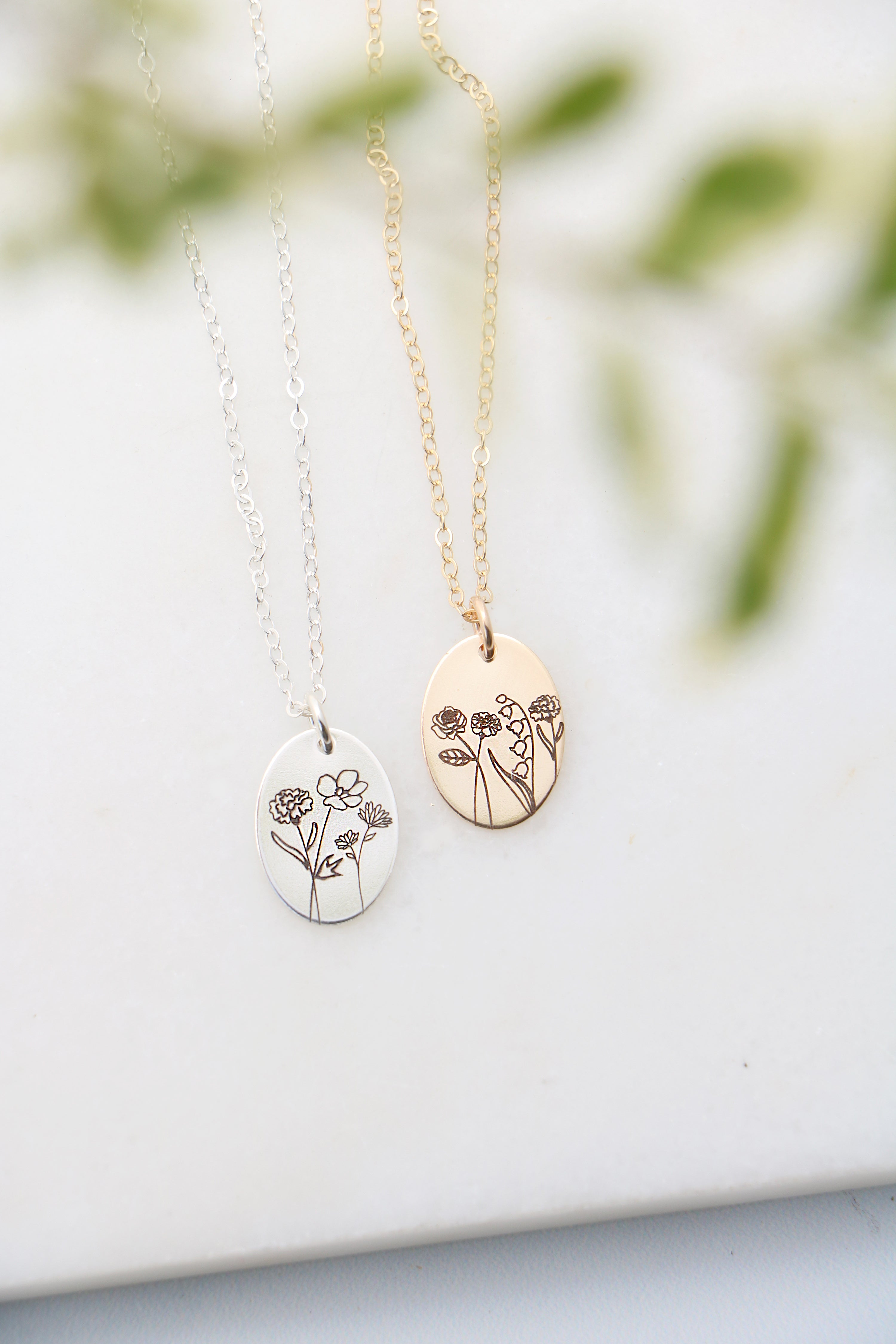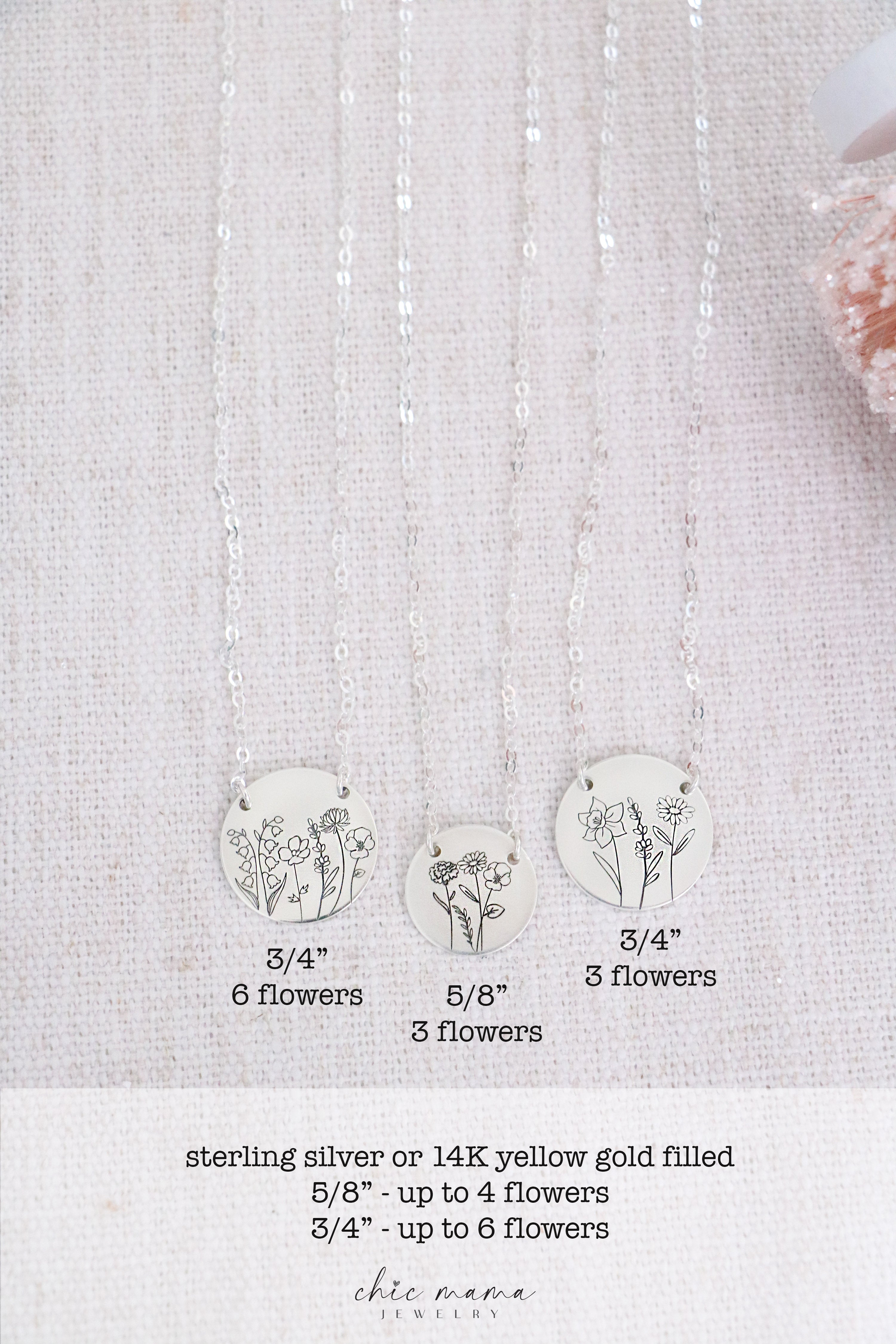 A beautiful multi-birthflower necklace perfect to gift to mom or grandma. Both rectangle and oval charms can be engraved with up to 4 birth flowers, round charm can be engraved with up to 6 flowers. Choose your preference of stainless steel, sterling silver, or gold filled at checkout. Stainless steel options include a modern rectangle shape pendant and an adjustable chain 16-19". Oval and round charms are available in sterling silver and yellow gold filled, and are heirloom quality. Sterling silver/ gold filled charms include a cable chain in your choice of length 16" or 18".