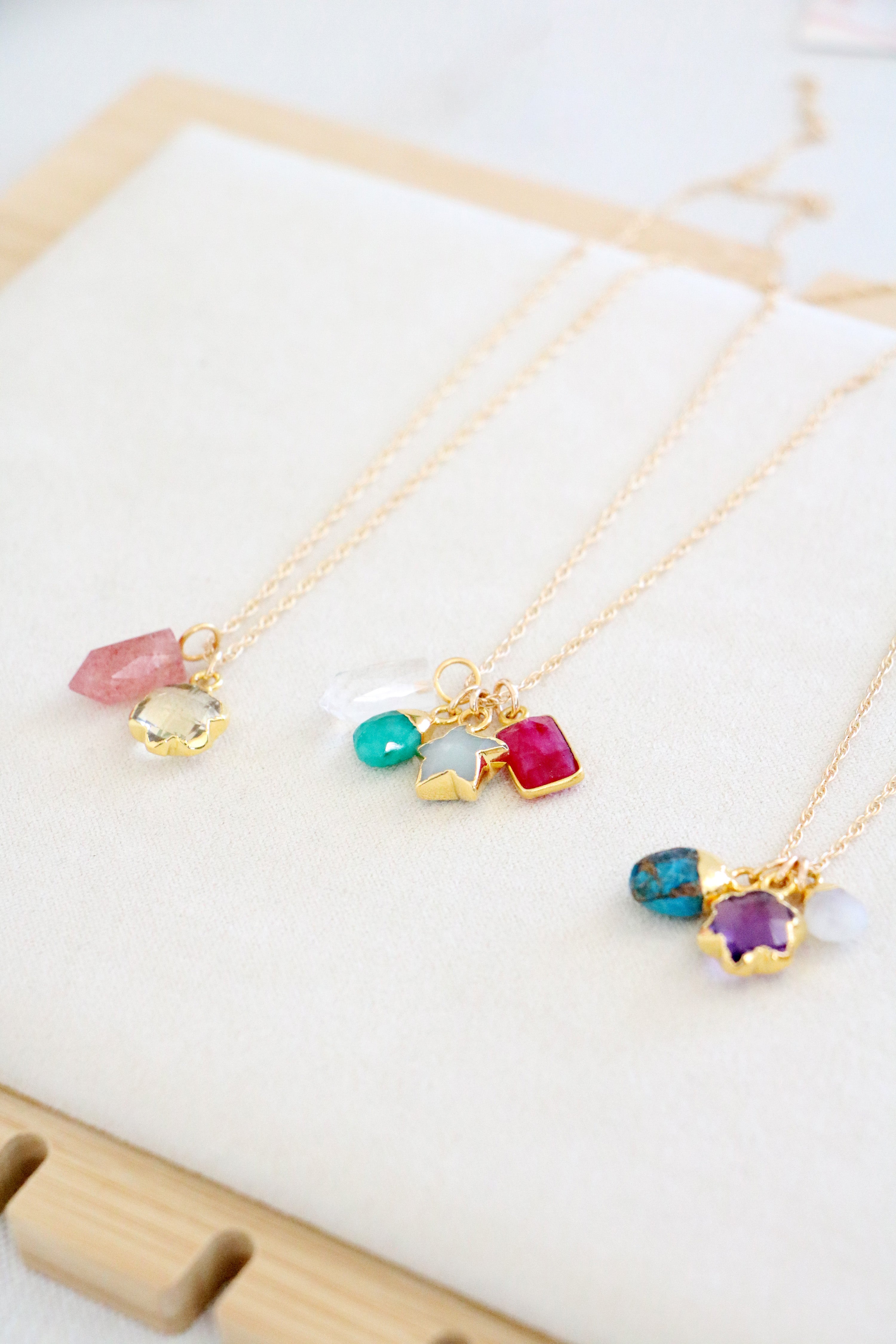 A unique mix of raw gemstone charms each representing a loved one and worn close to your heart. Each gemstone is slightly unique in shape, color and texture. Gemstones are ethically sourced from India, plated in silver or 14K gold, then polished and set here in our studio. Choose your unique assortment of gemstones and have them hung from your choice of sterling silver or 14K gold filled chain in a variety of lengths.