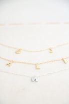 Suspended on a delicate chain are up to 8 initial charms. Each charm has a mirror finish and is available in gold plated, solid 10K yellow gold, or solid sterling silver. Initial charms are attached to individual links so they are stationary on the chain and will not overlap. Chain is 14K gold filled or 925 sterling silver. Please include your preferred length and letters (in order) at checkout. If no length is specified, the necklace will be 17".