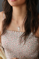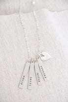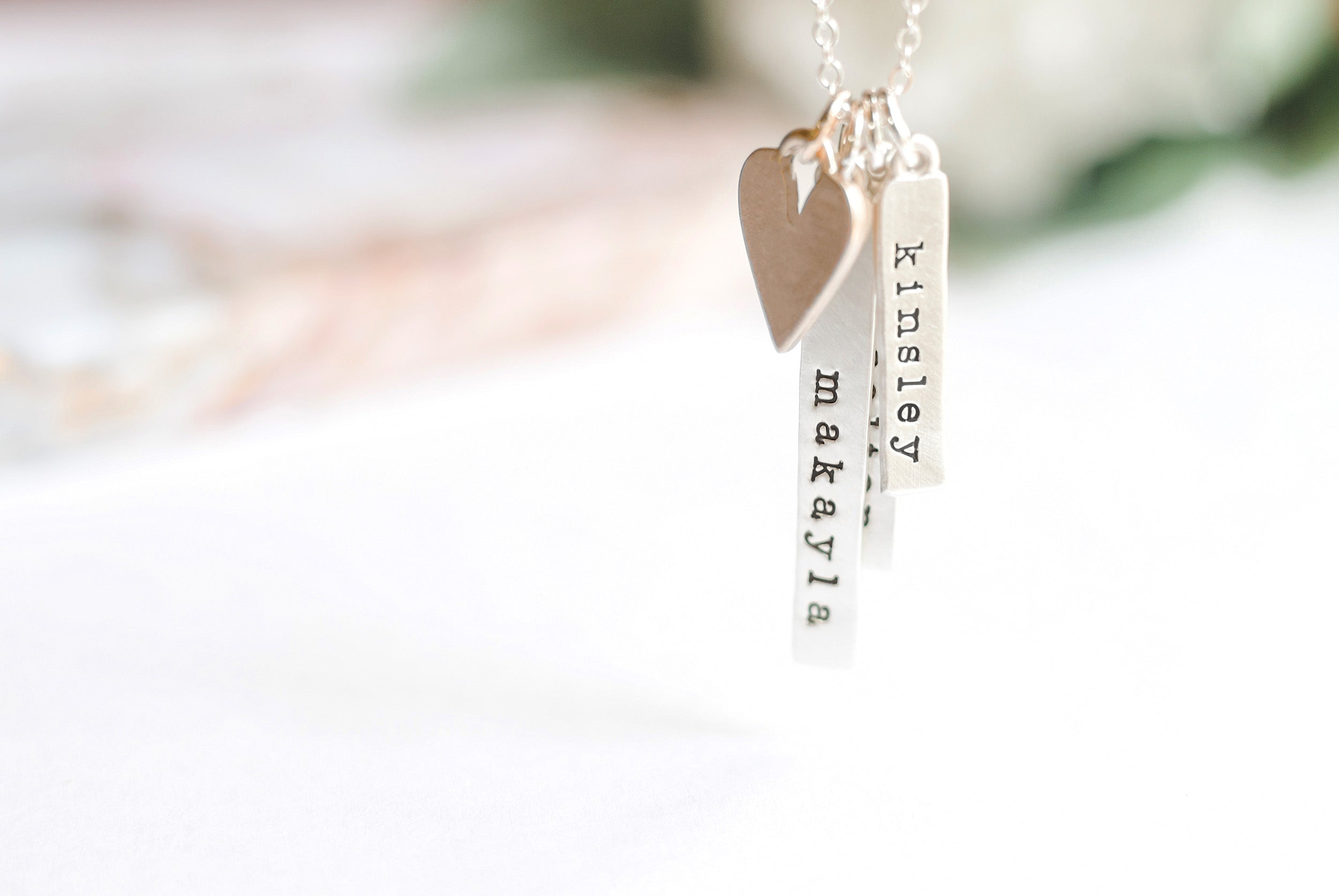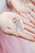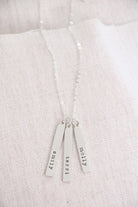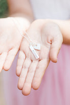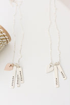 A beautiful sculpted bar is hand-stamped with any name or date you would like. Personalize one bar, or personalize several and wear them all together with our beautiful heart charm. Hung from a fine sterling silver cable chain.