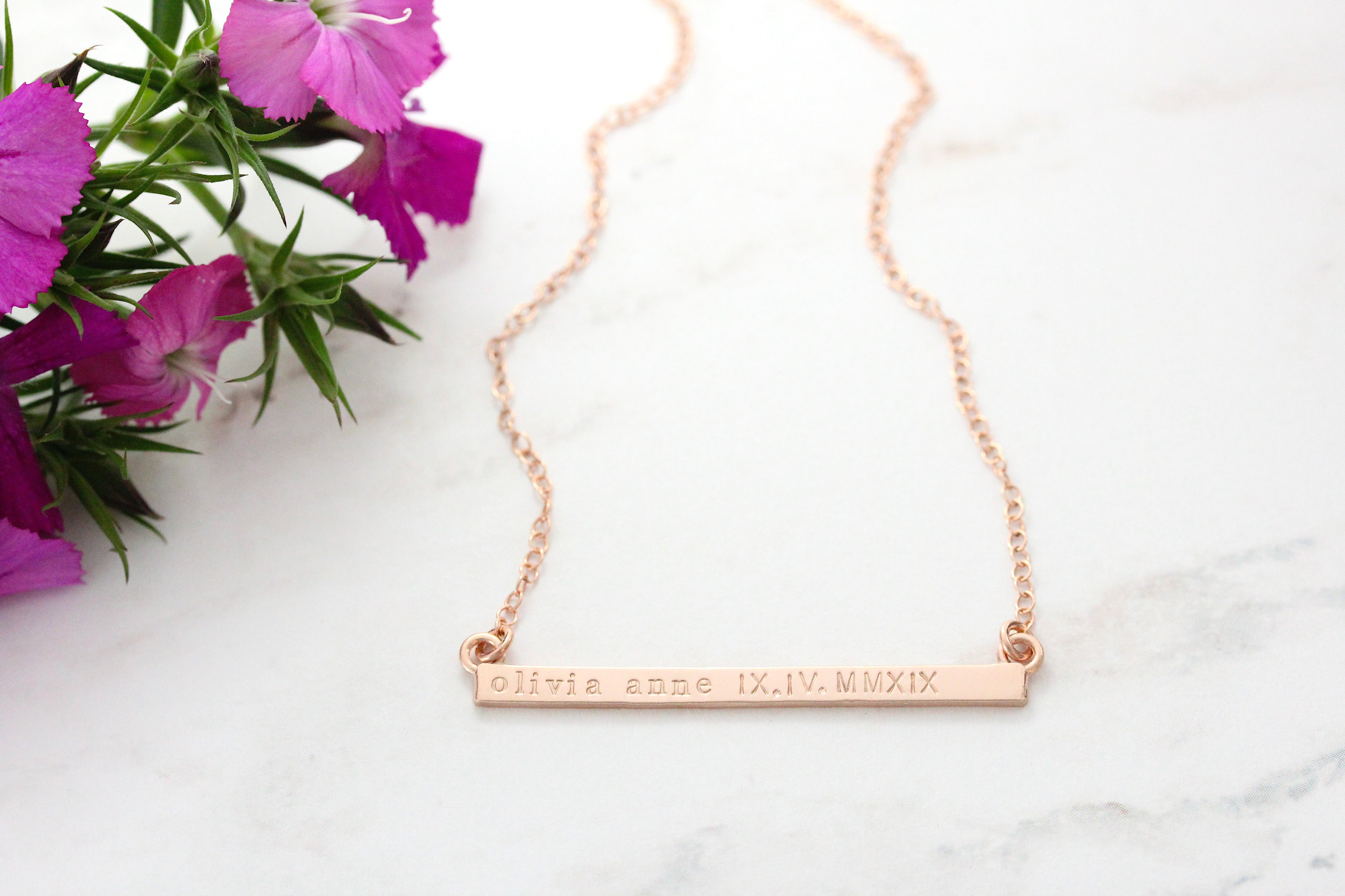 This necklace features a solid bar stamped with a roman numerals of your choice.  Bar measures approximately 42mm by 3mm and can be stamped on front only.