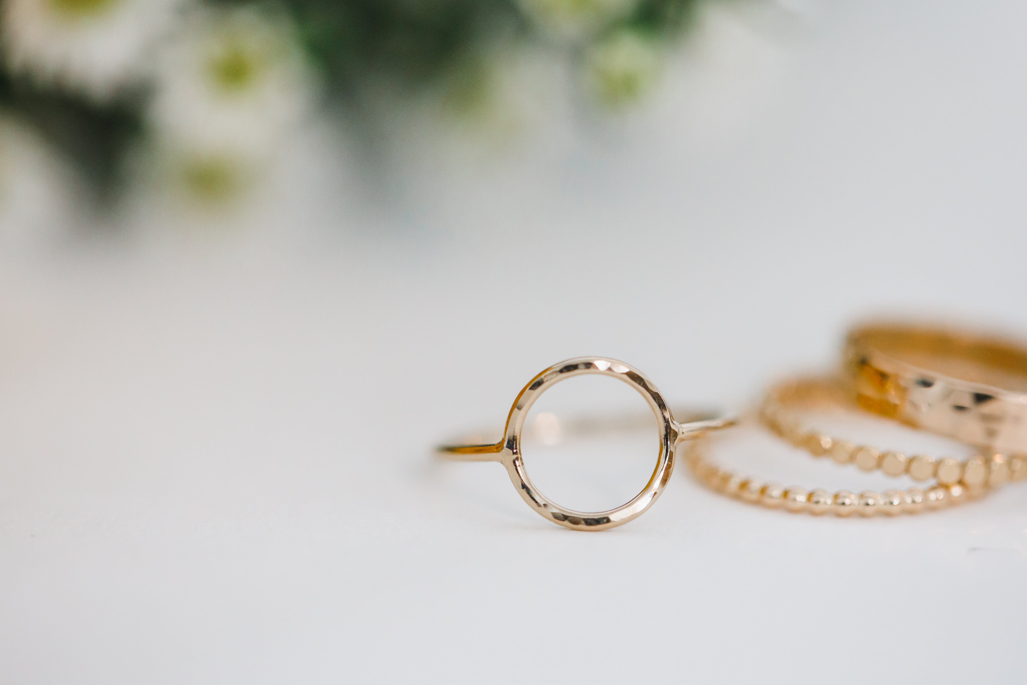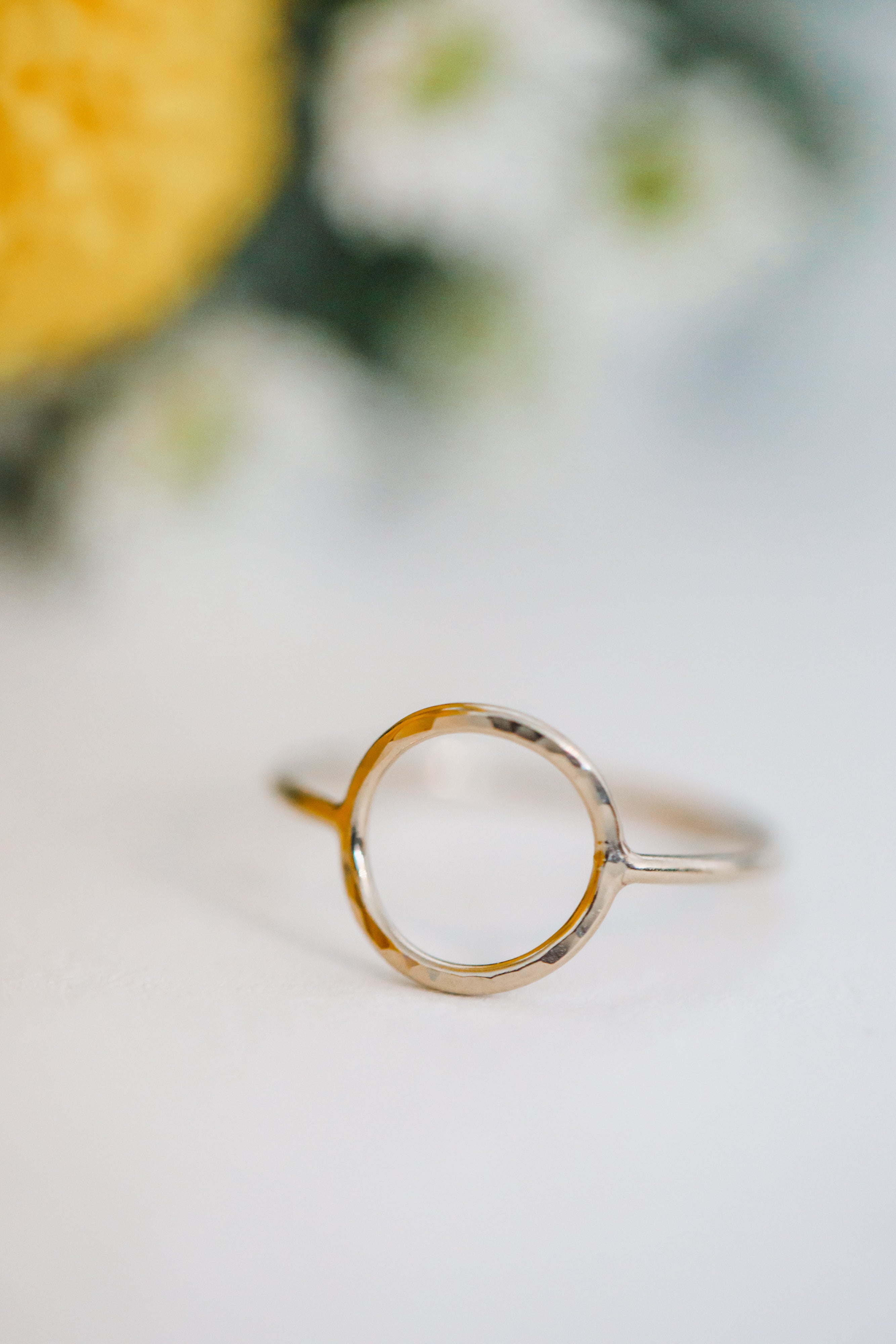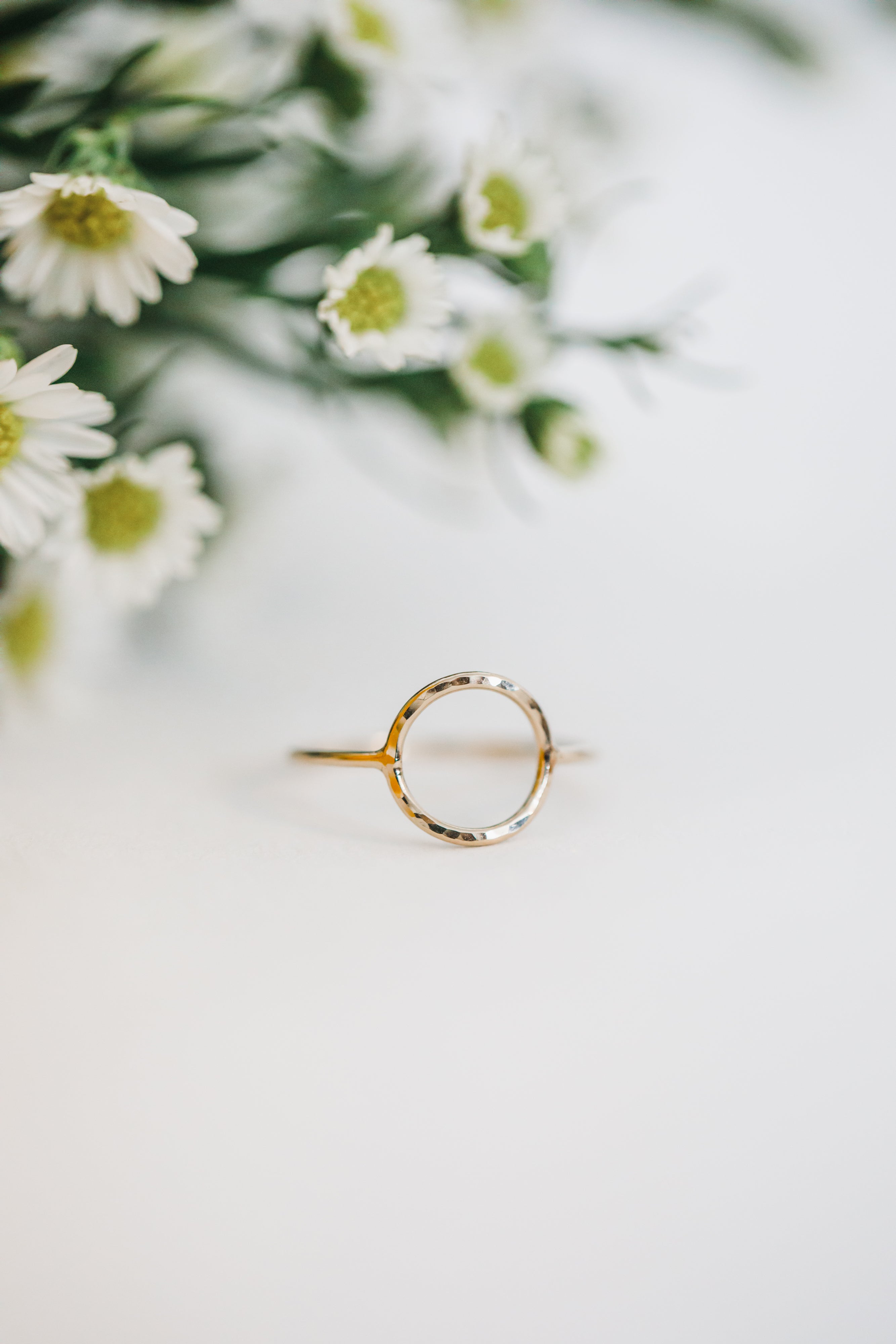 A simple circle detail is the focal point of this ring. The circle is textured just enough to make it shine brilliantly. Made from 14K gold filled wire with a shank width of approximately 1mm. This ring is perfect for stacking and wearing as an accent ring. Available in sizes 5-9.