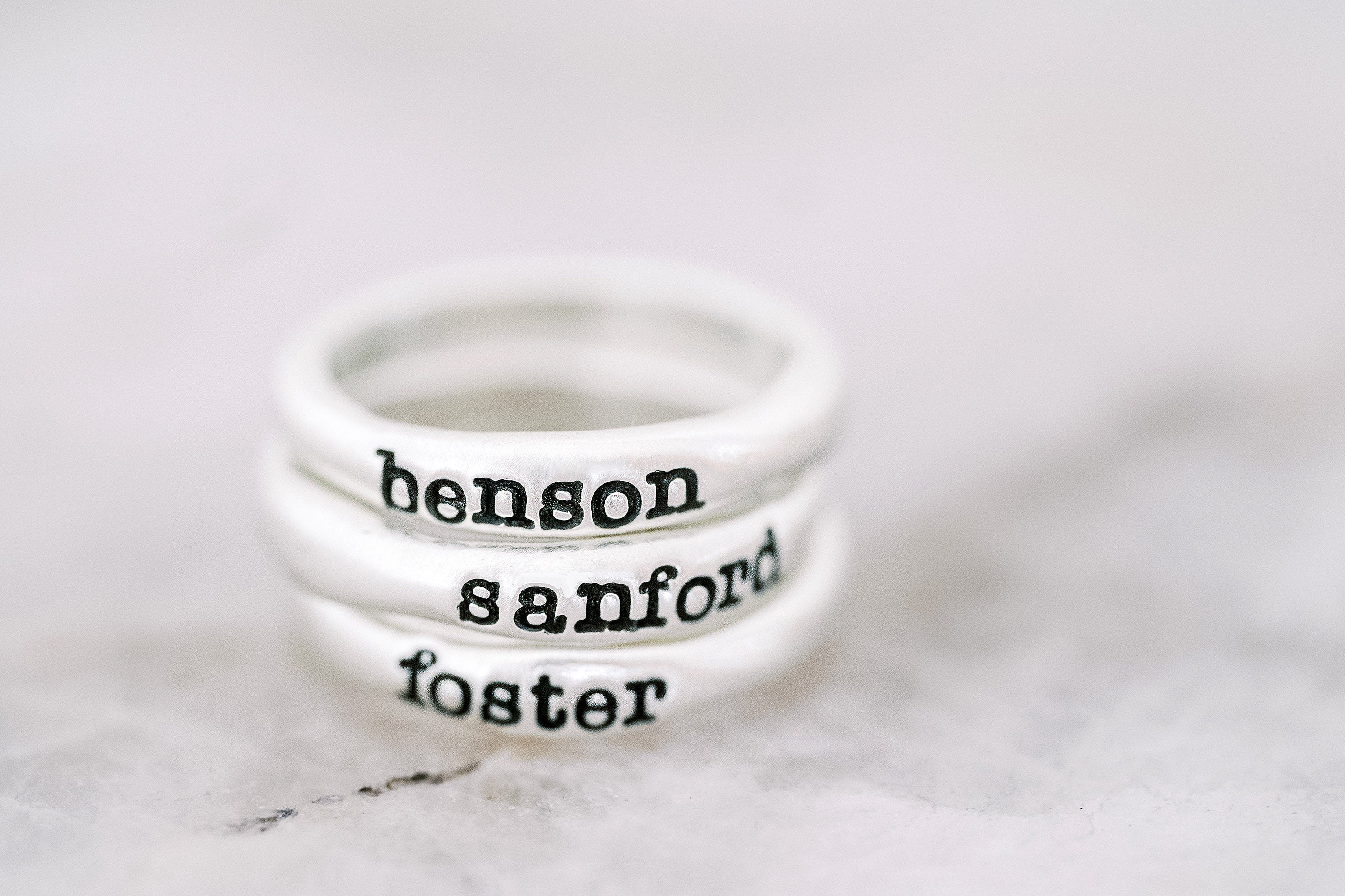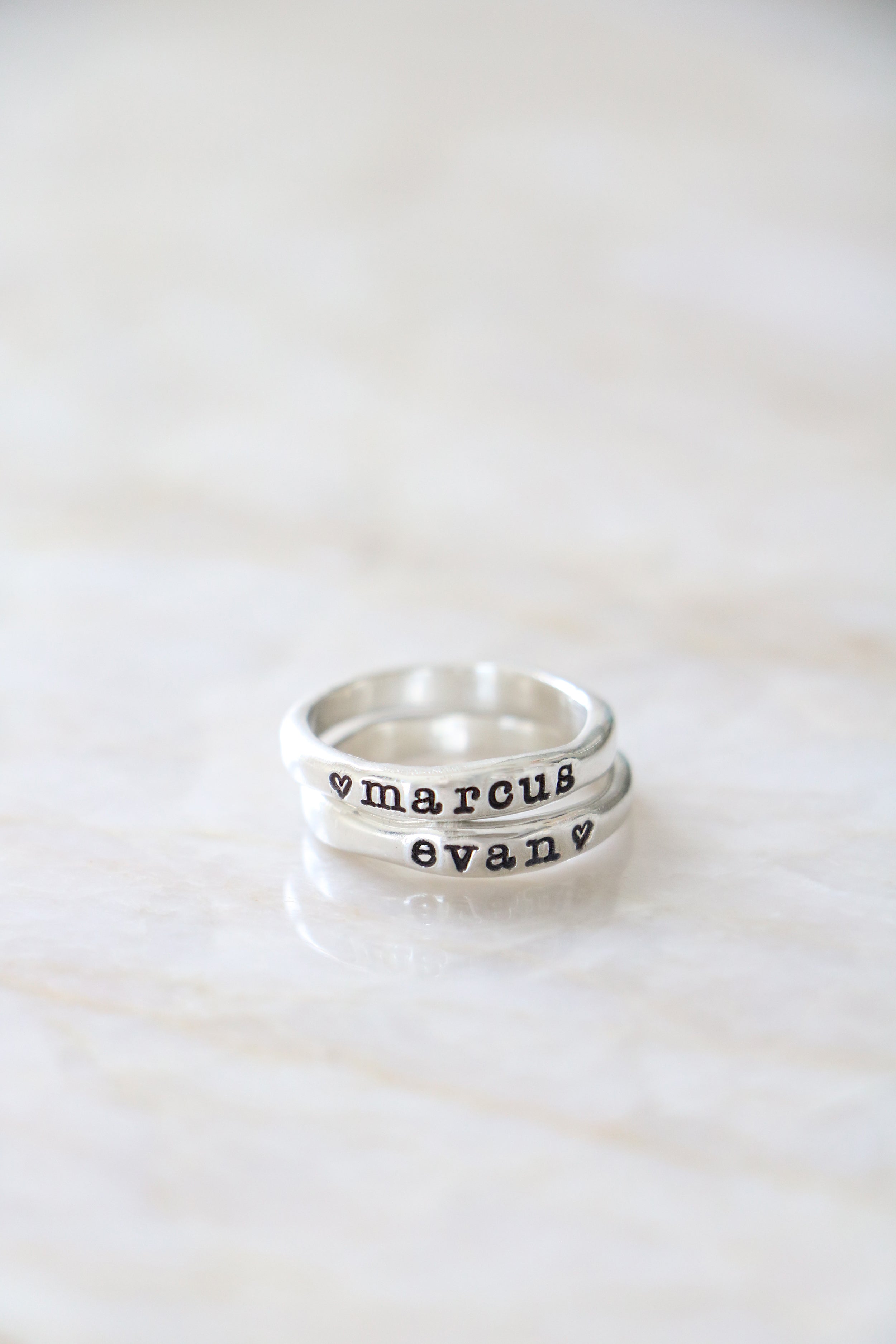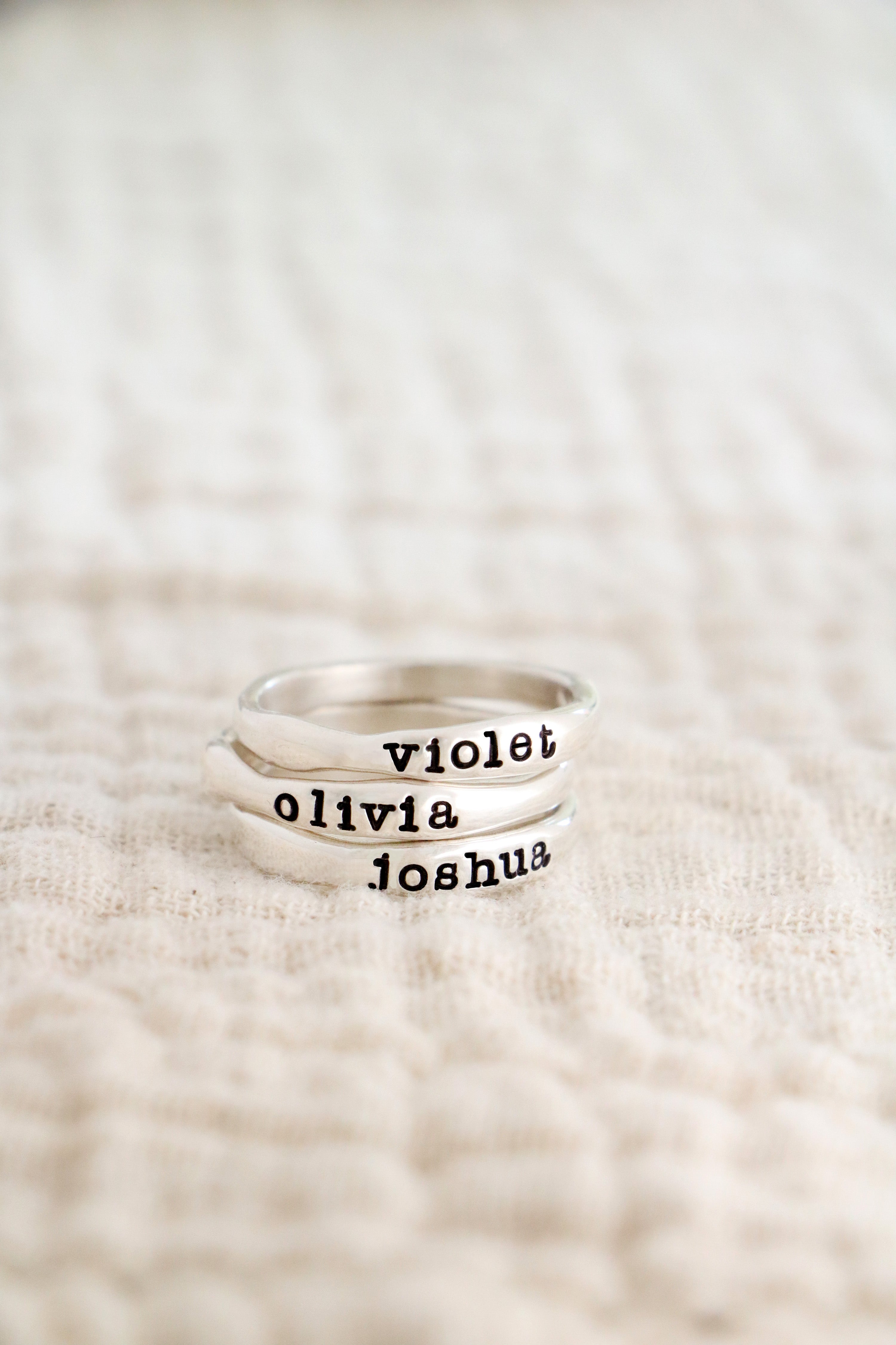 Each ring is handcast from fine sterling silver and has a pillowy-soft feel. Rings are handstamped with a single name.... wear one or stack a few!