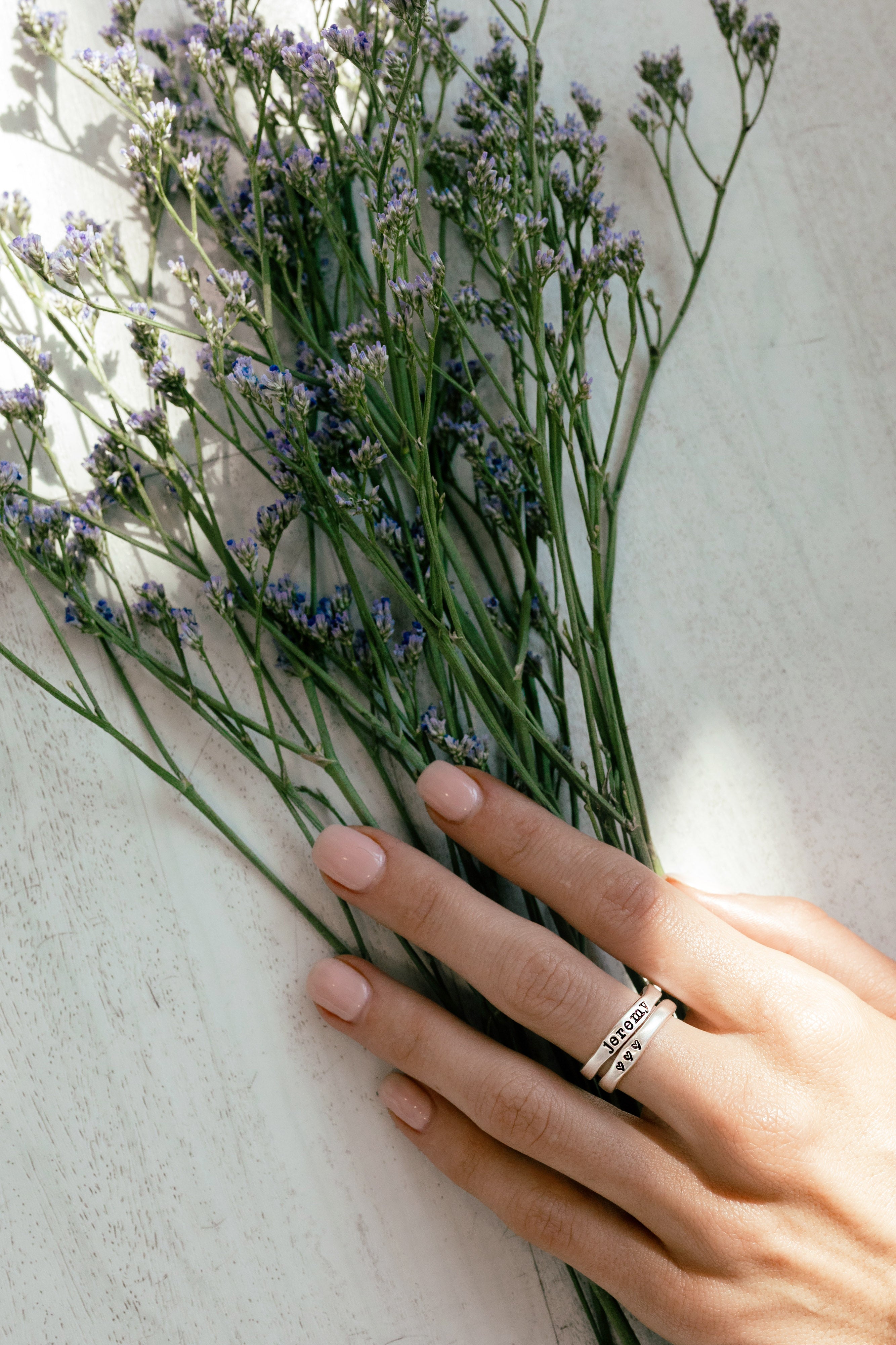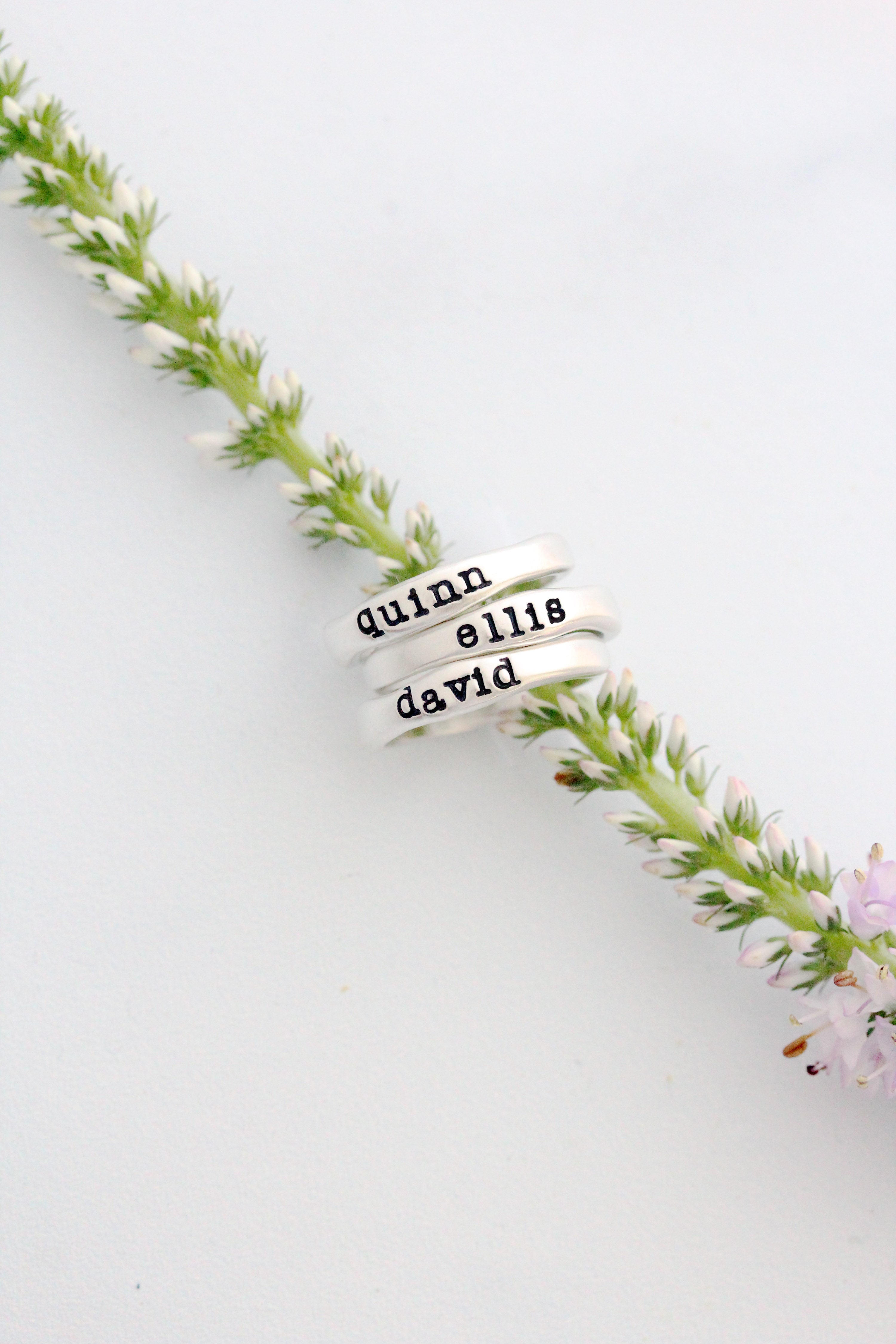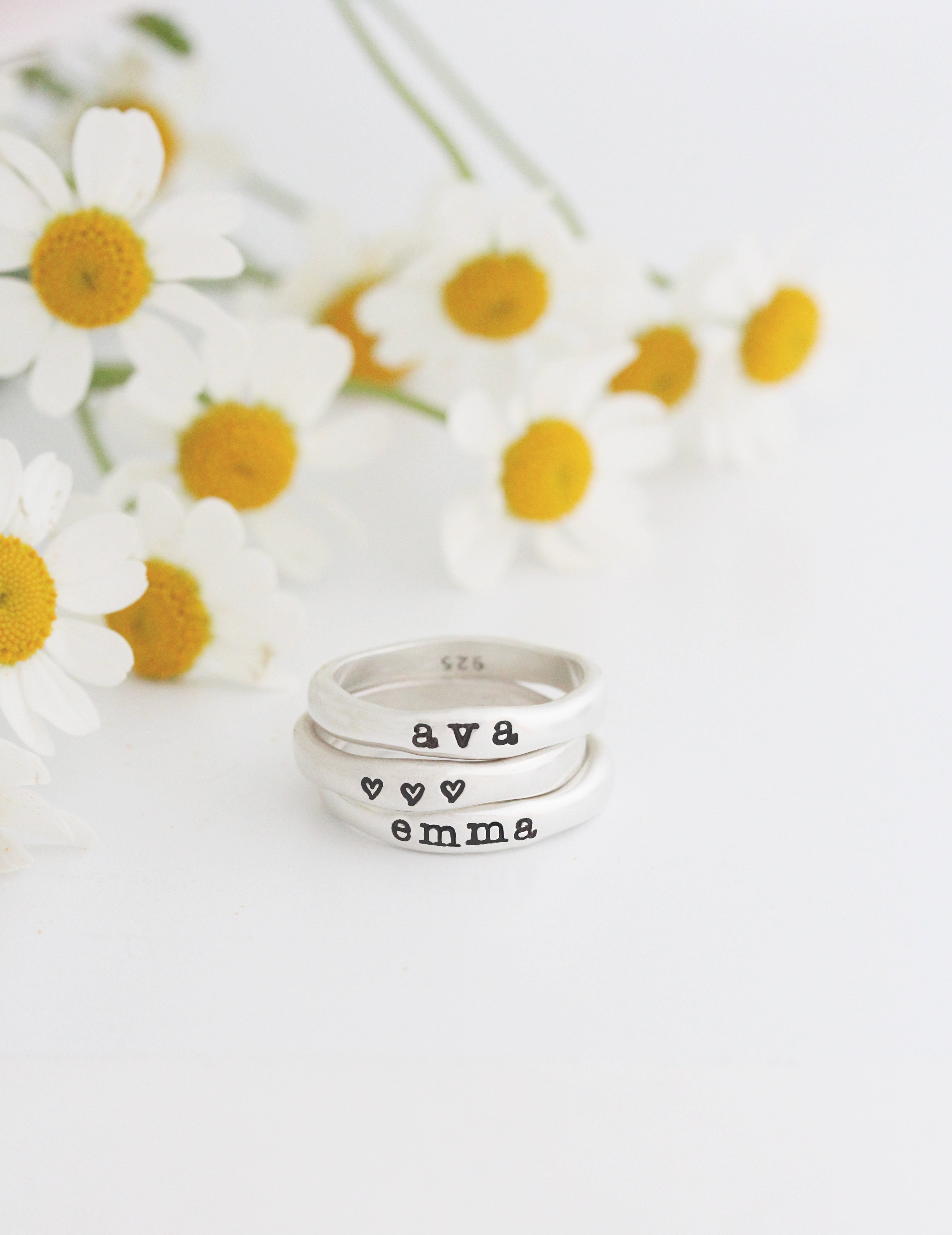 Each ring is handcast from fine sterling silver and has a pillowy-soft feel. Rings are handstamped with a single name.... wear one or stack a few!