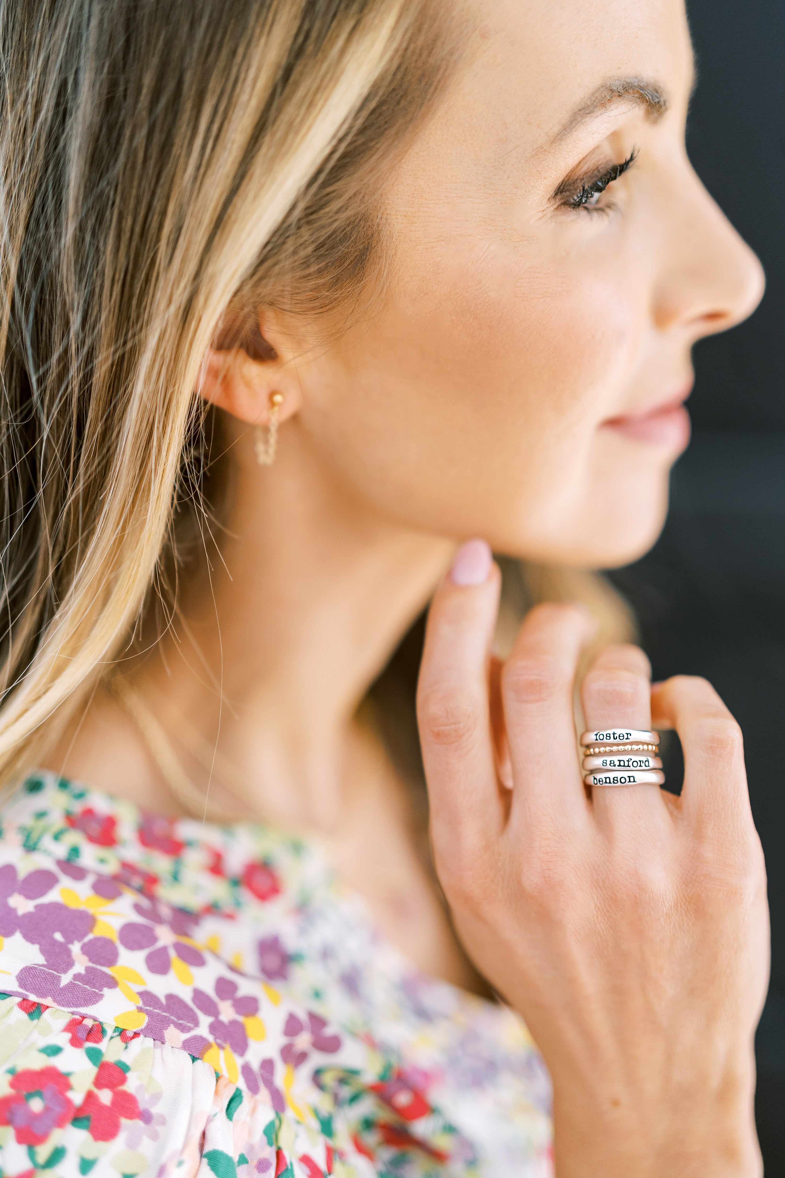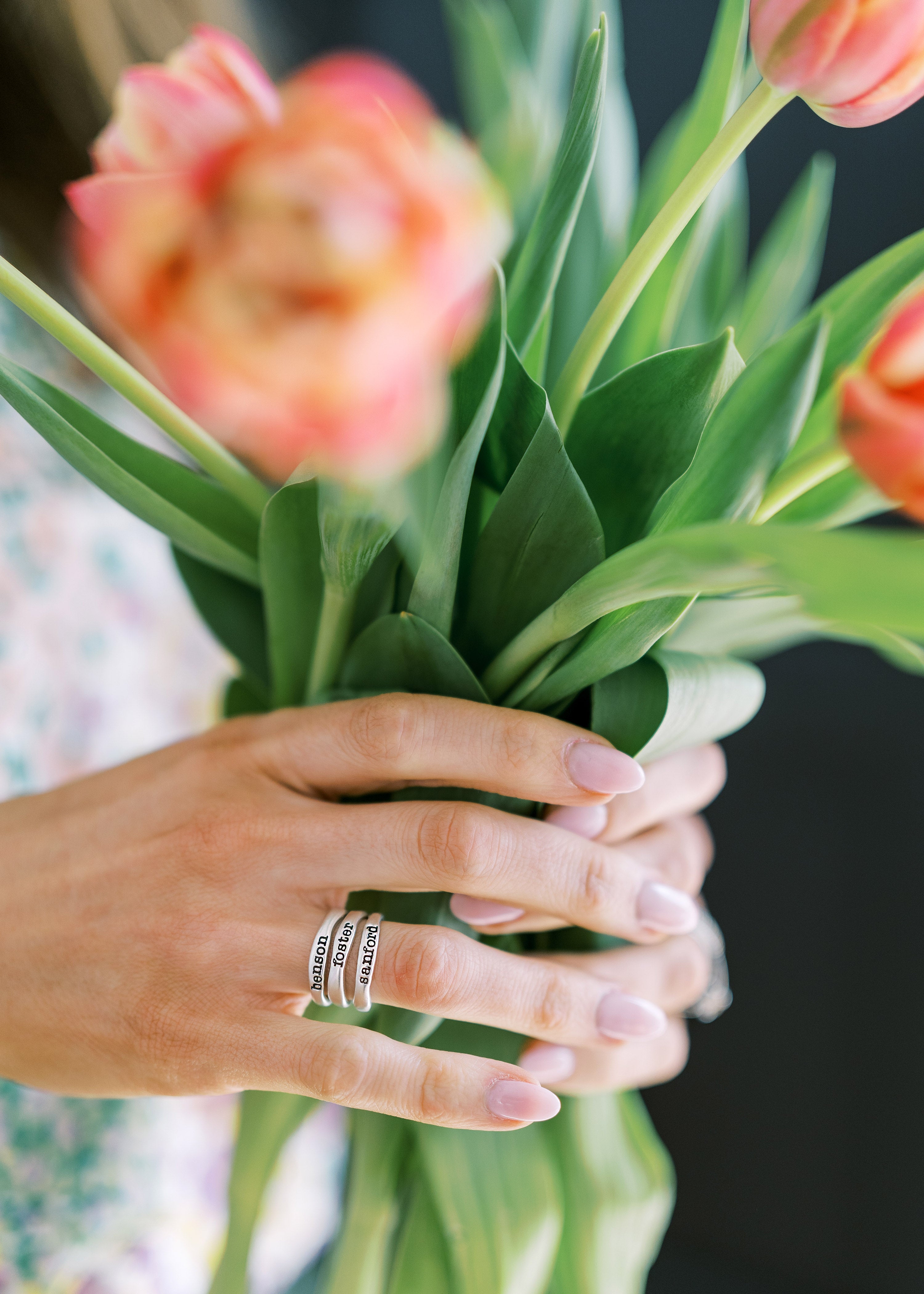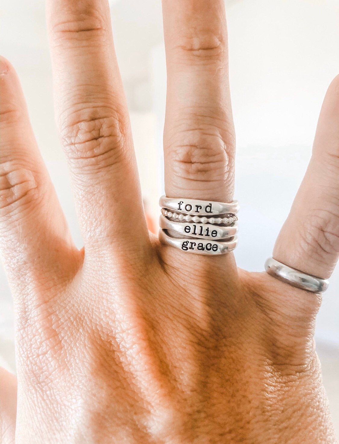 As a mom, I am constantly using my hands, whether its cleaning up spills, playing with legos, tying ponytails, or making lunches.... these rings are the sweetest reminder in all the ordinary jobs I do. My heart is renewed every time I see those three sweet names around my finger.