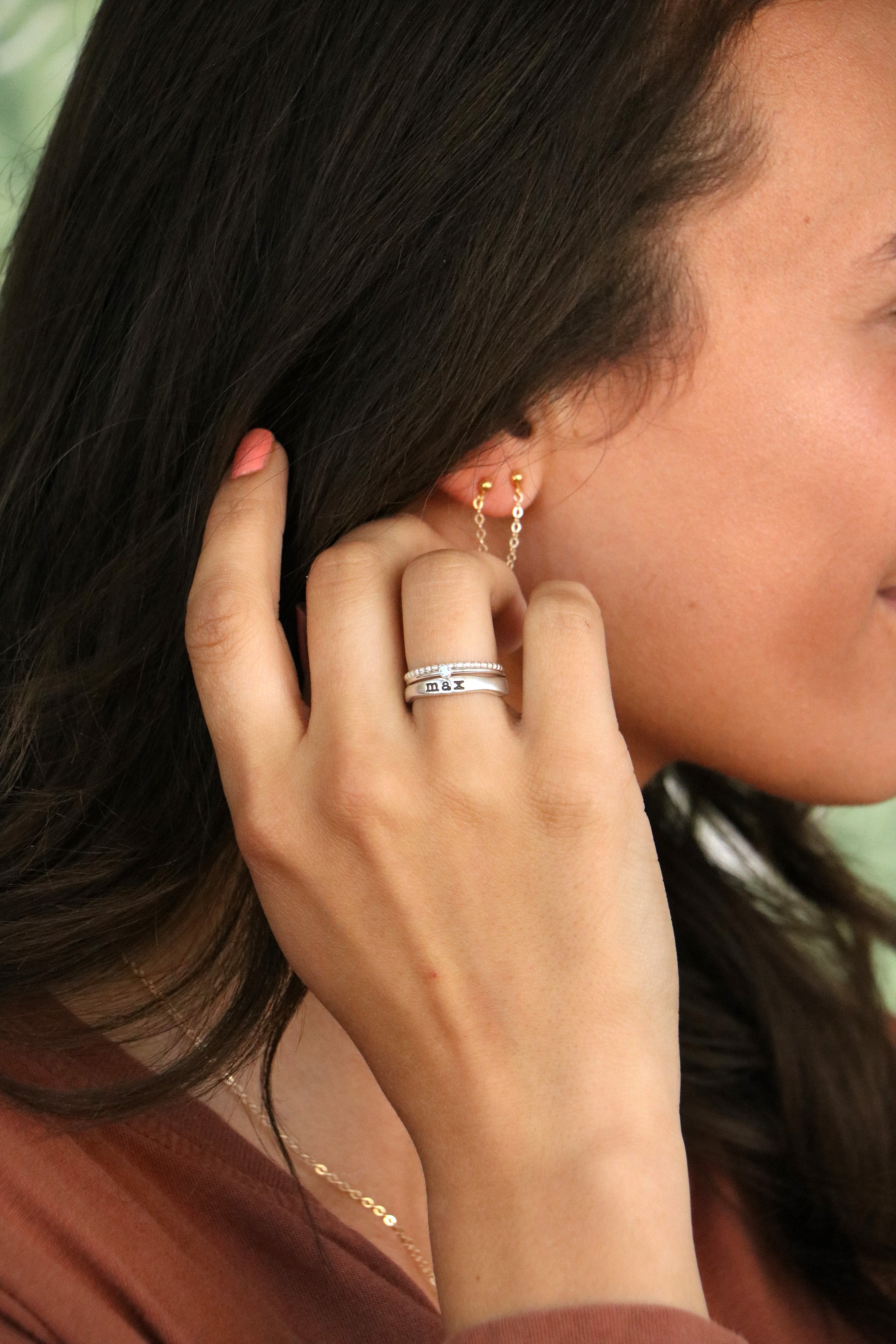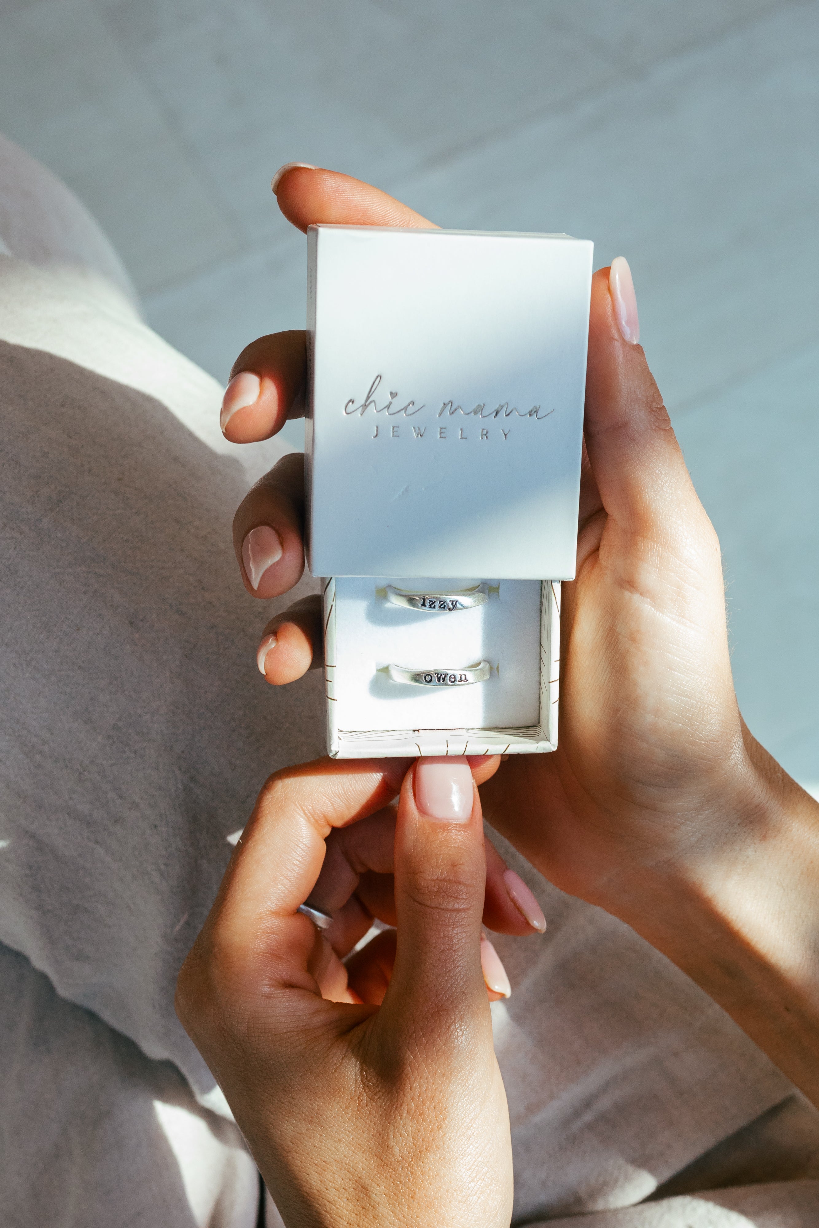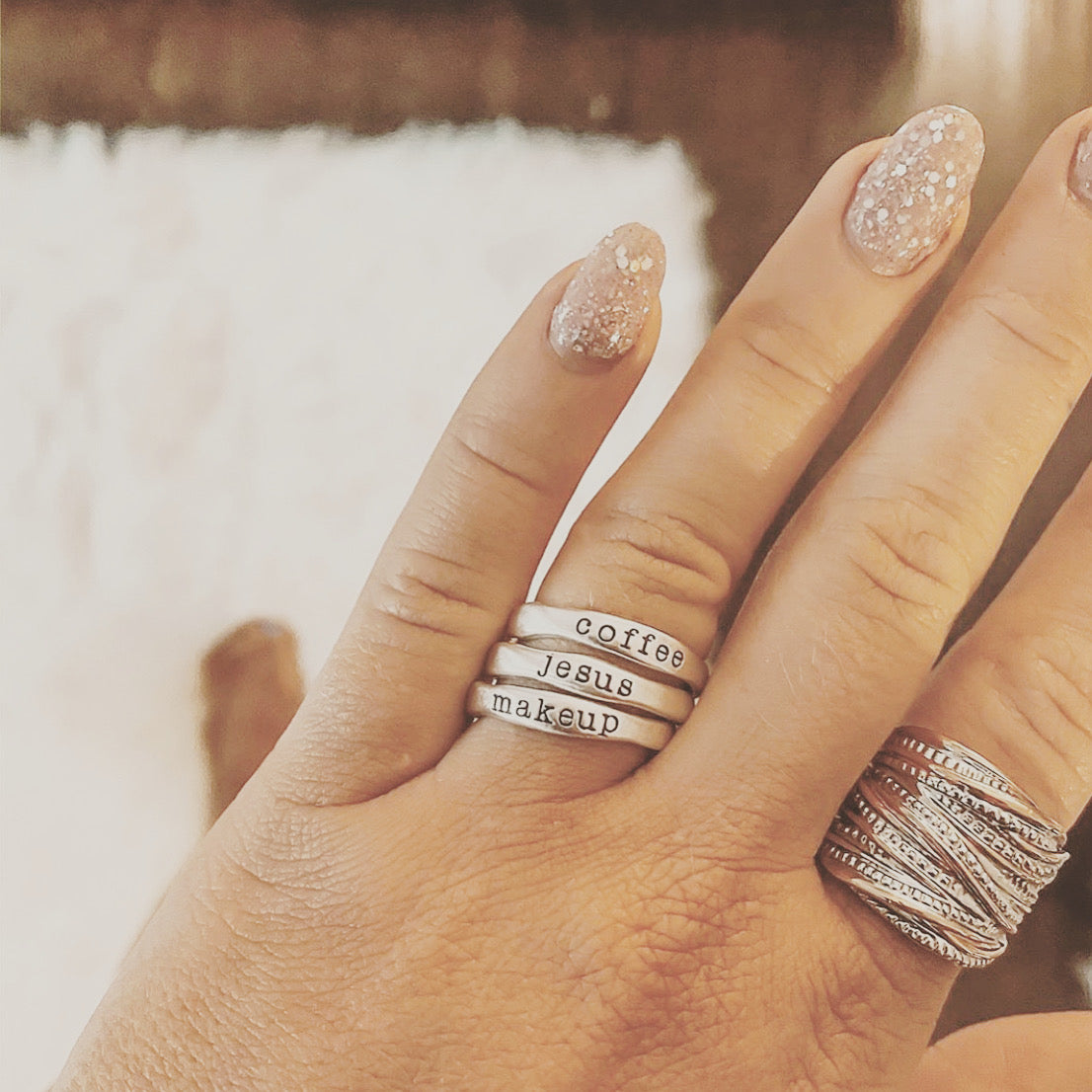 As a mom, I am constantly using my hands, whether its cleaning up spills, playing with legos, tying ponytails, or making lunches.... these rings are the sweetest reminder in all the ordinary jobs I do. My heart is renewed every time I see those three sweet names around my finger.