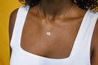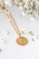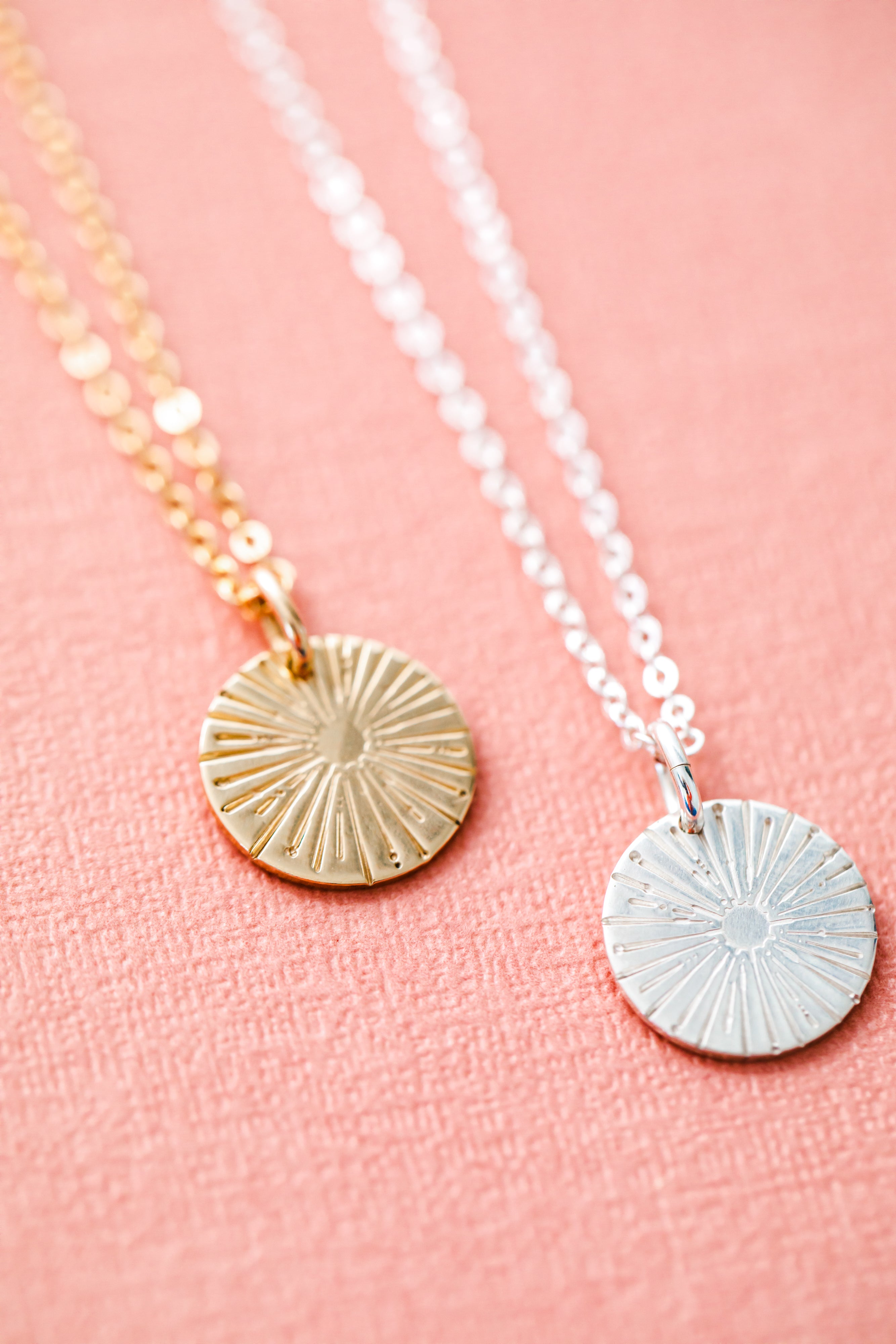 The spring and summer seasons welcome the sun in all its luminous warmth, and this brings the inspiration behind this design. Commissioned by local artist, Annette Trammel, the sun has a celestial beauty that even mother nature admires. Stamped into a gold or silver disc, this design is nice on its own or layered with your favorite chain.